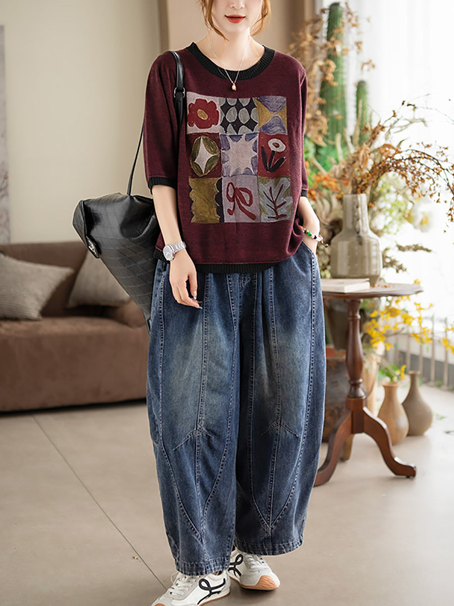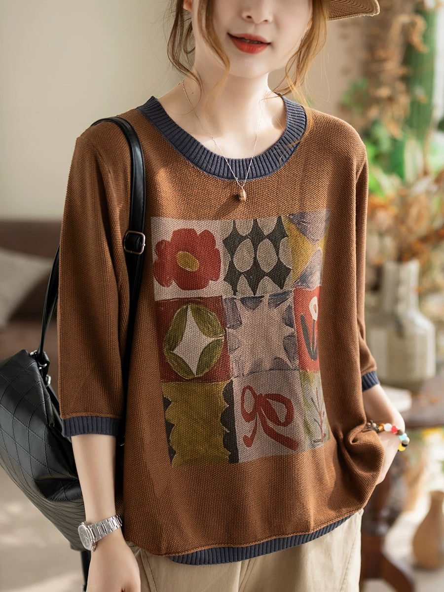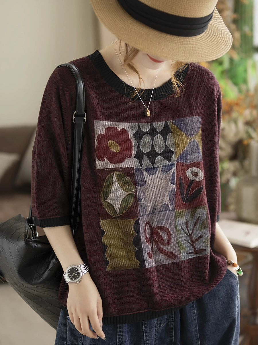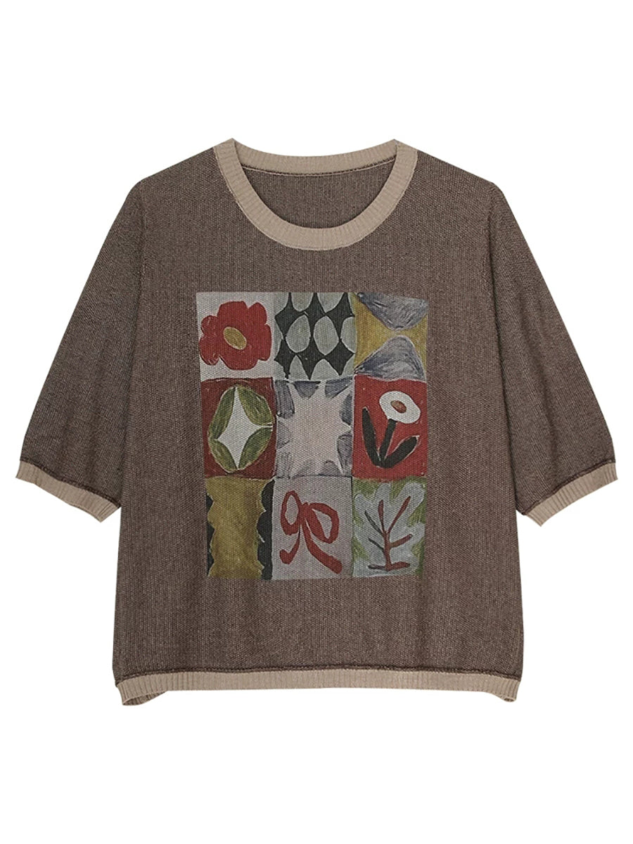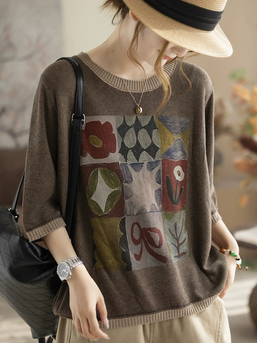 レディース サマー アーティスティック コットン Oネック ニット ブラウス