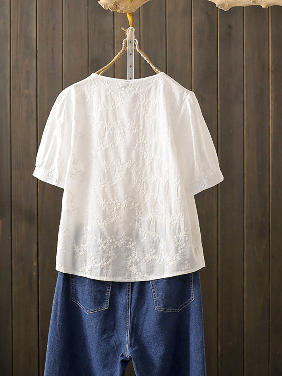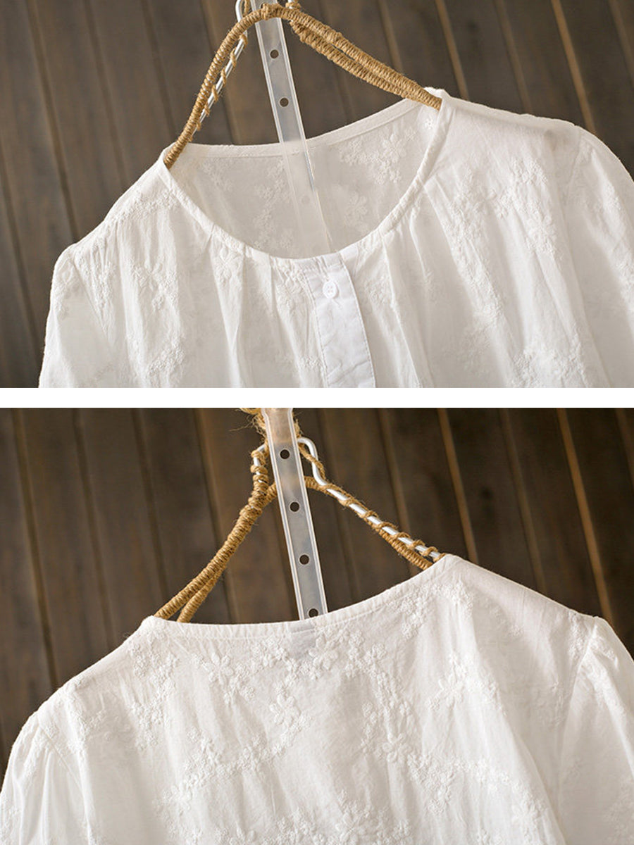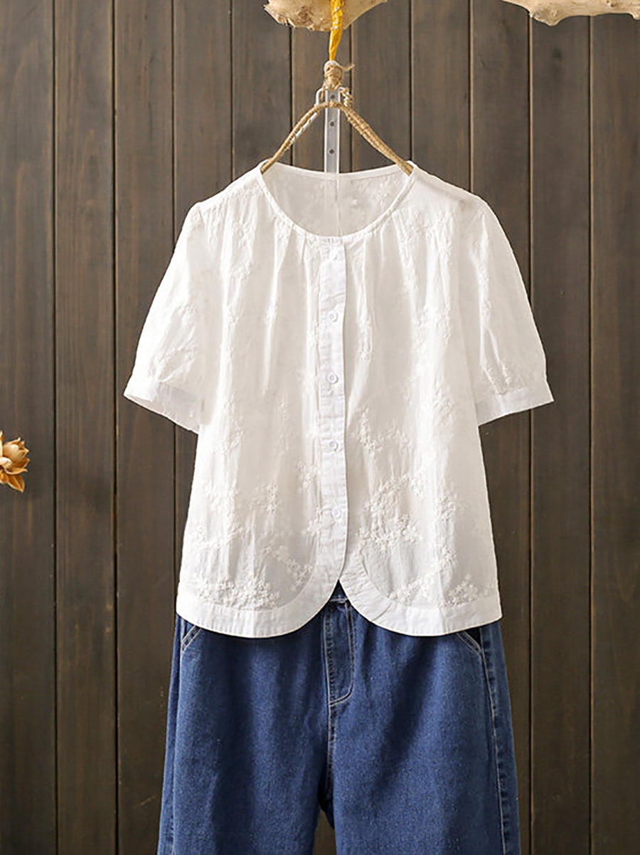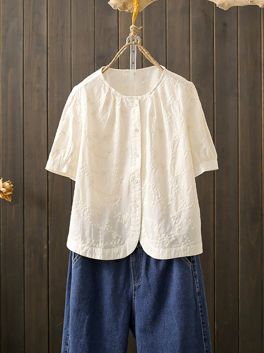 レディース 夏物 アーティスティック刺繍入り 綿100% ラウンドネックブラウス