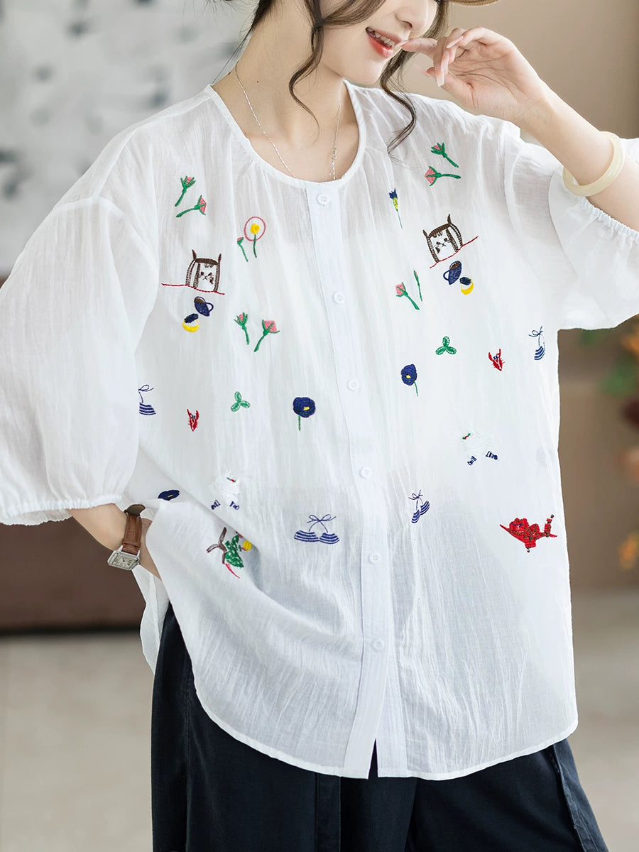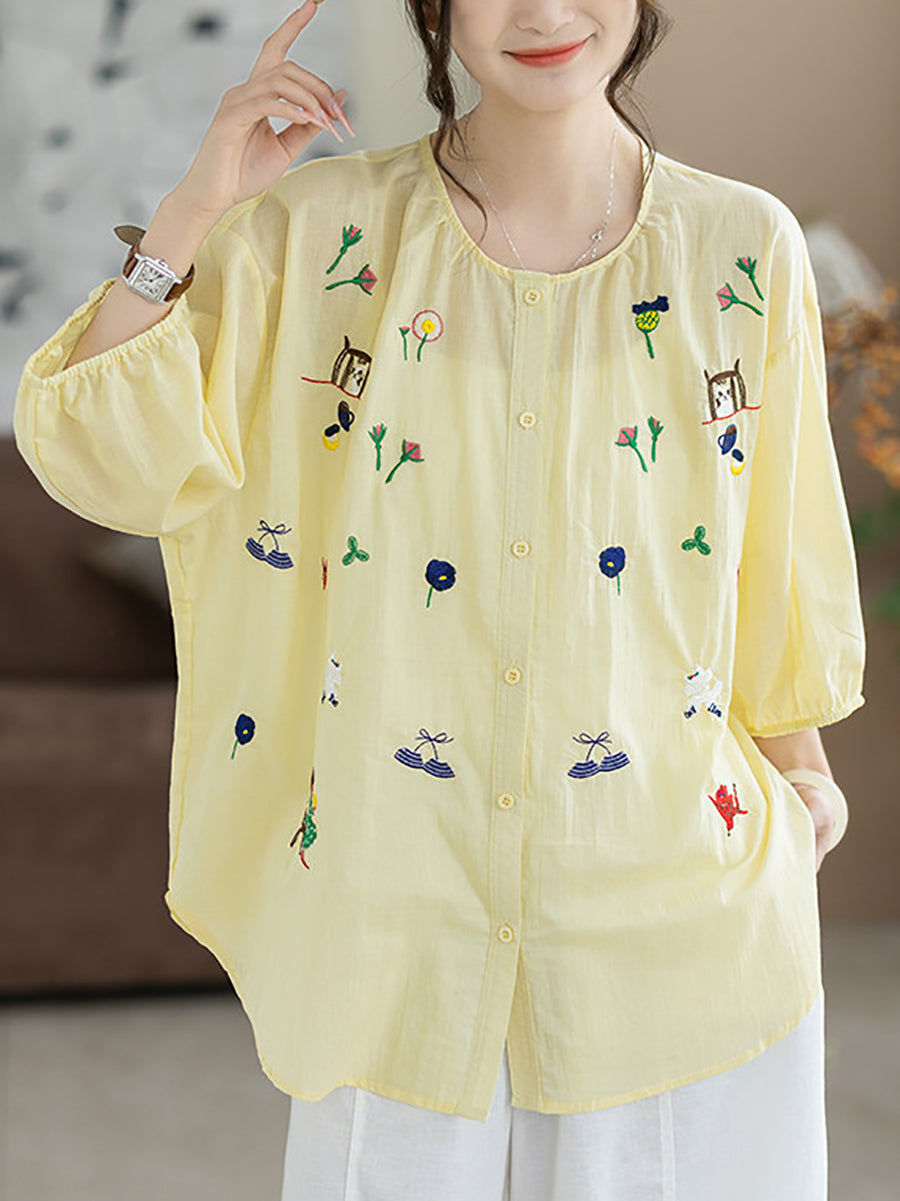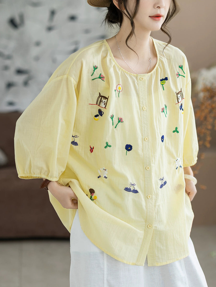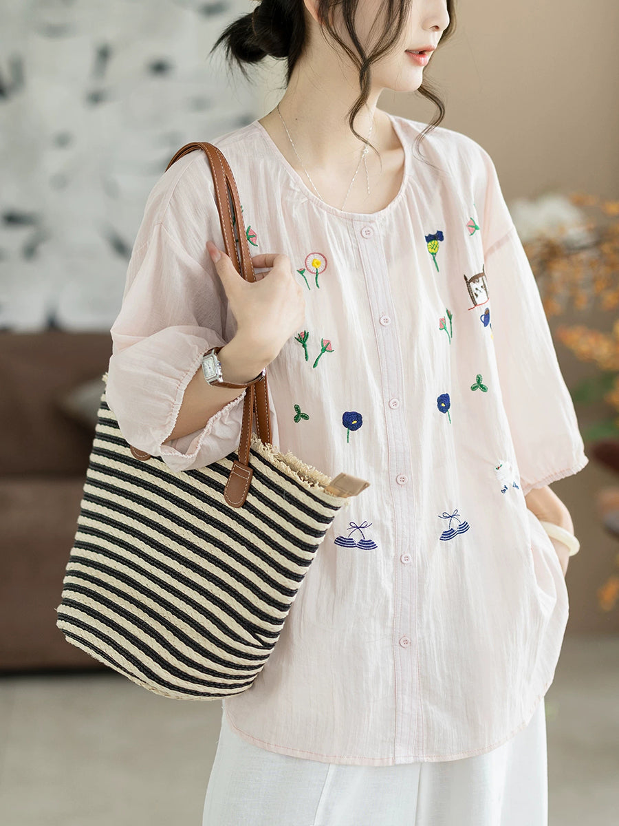 レディース 夏物 アーティスティック刺繍入り ラウンドネック 100%コットンブラウス