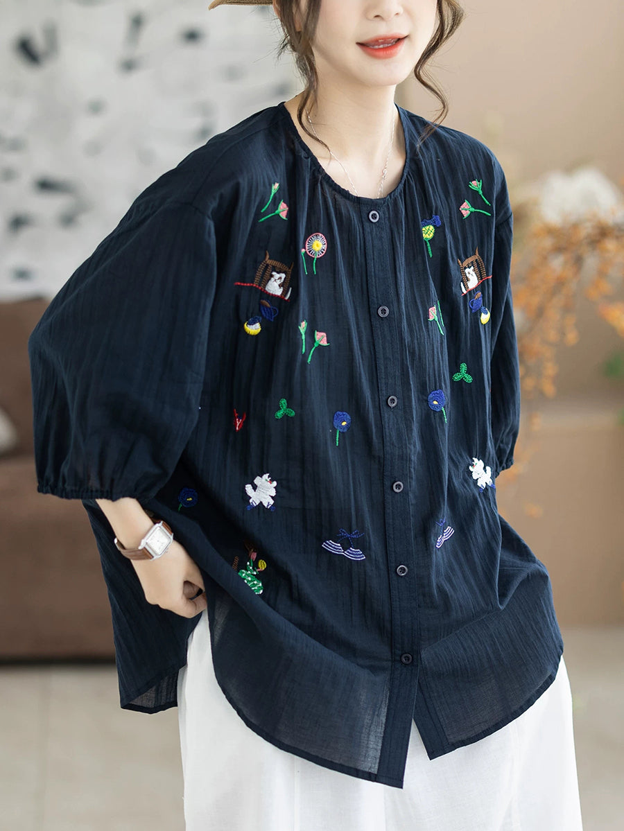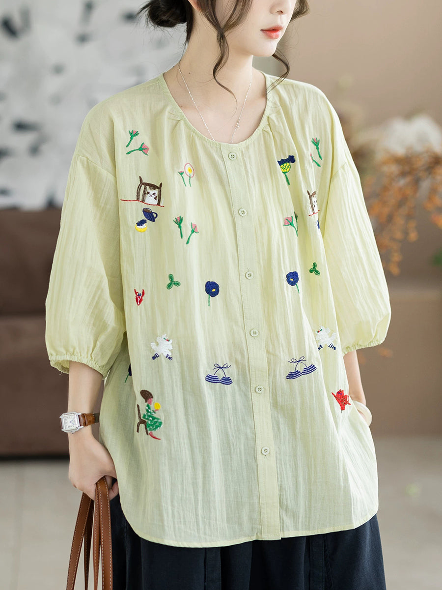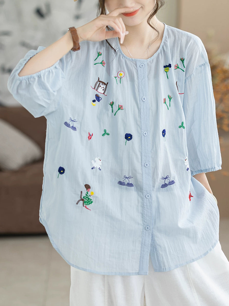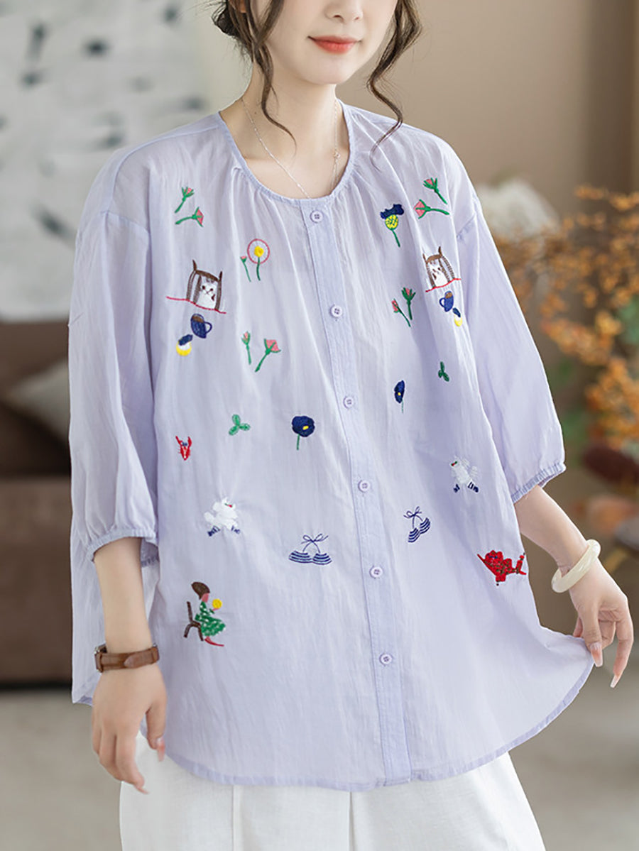 レディース 夏物 アーティスティック刺繍入り ラウンドネック 100%コットンブラウス