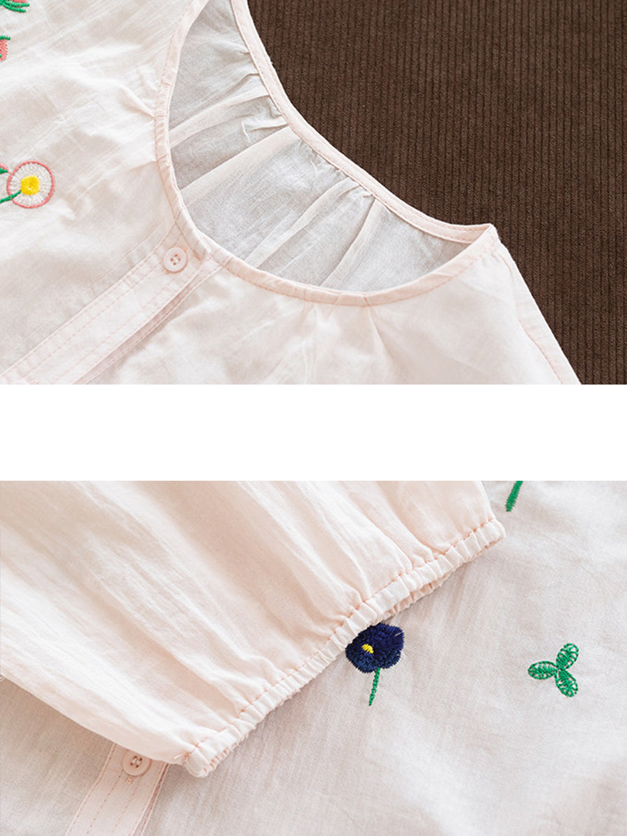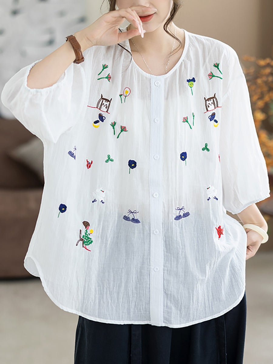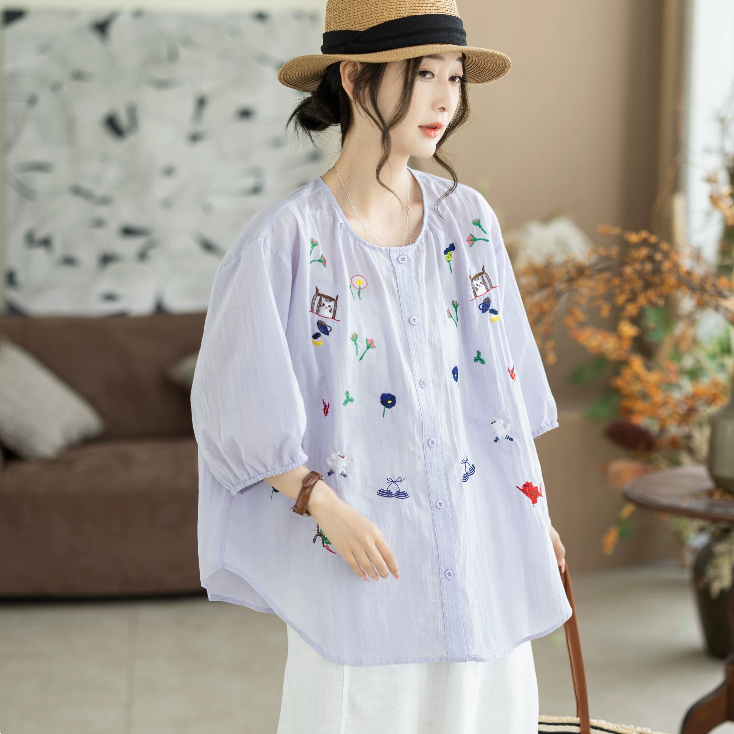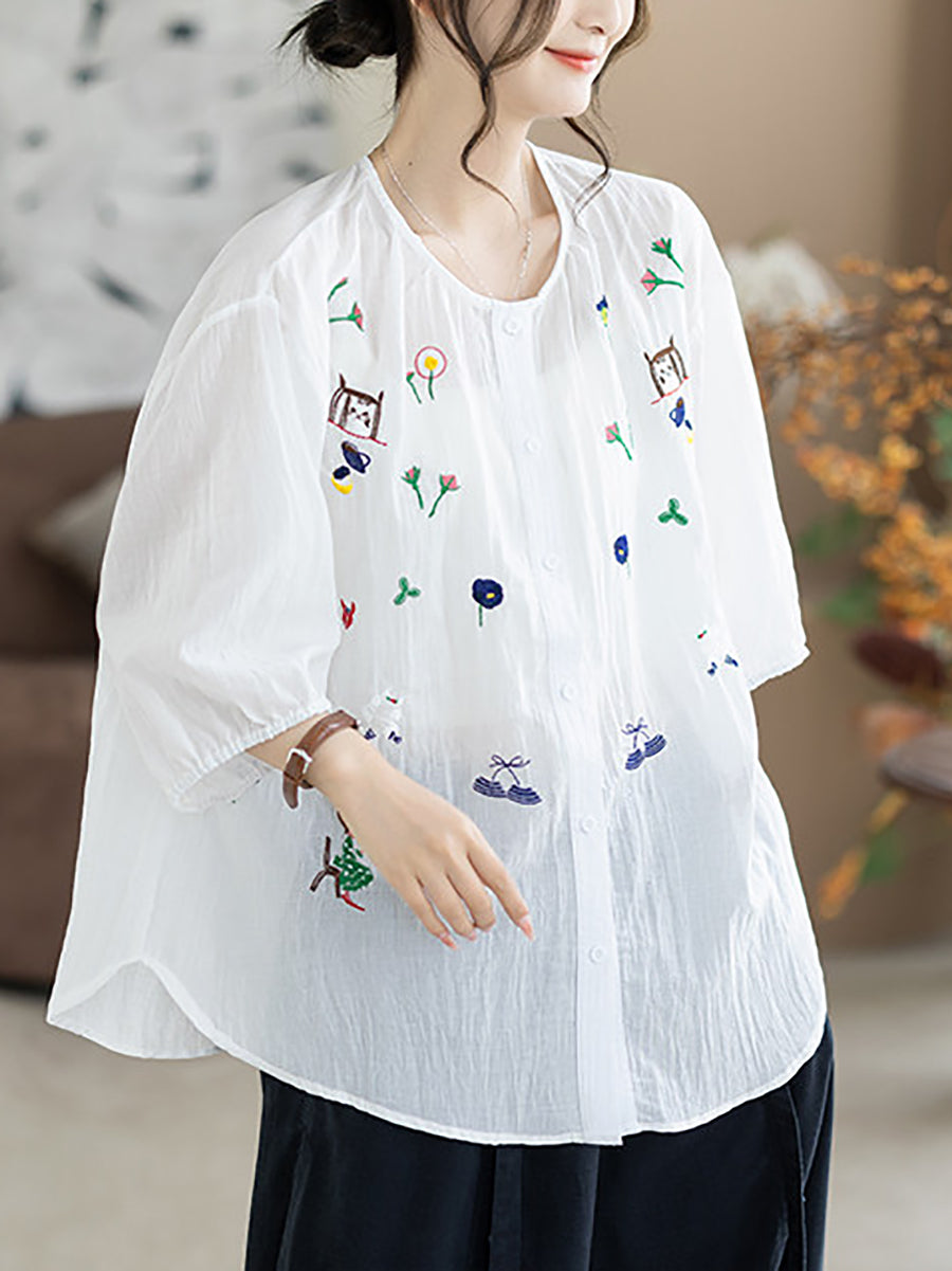 レディース 夏物 アーティスティック刺繍入り ラウンドネック 100%コットンブラウス