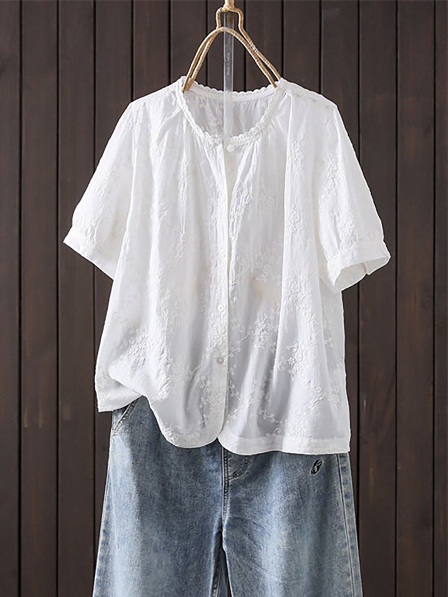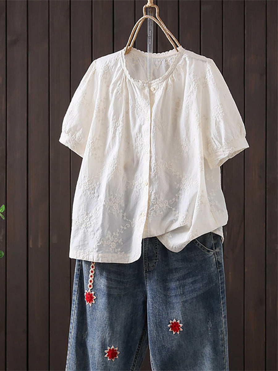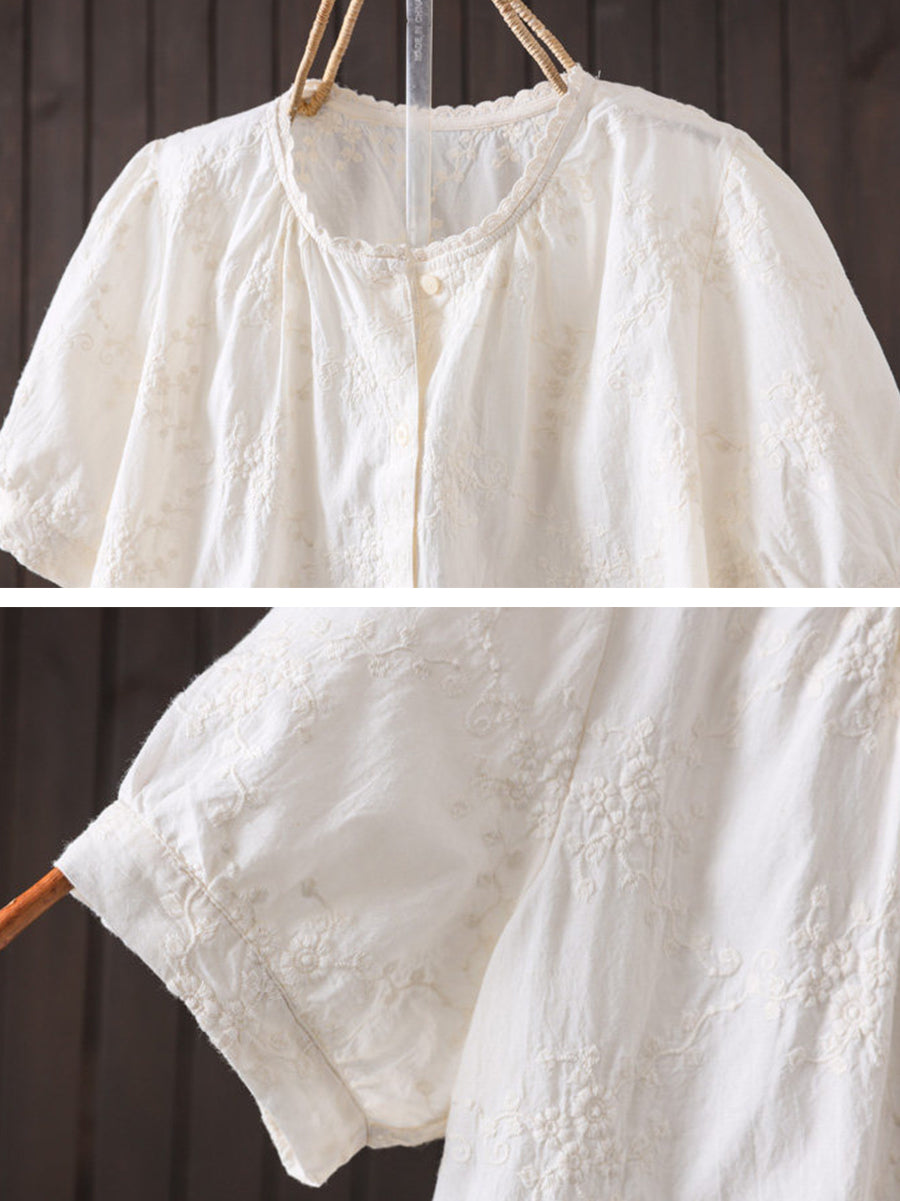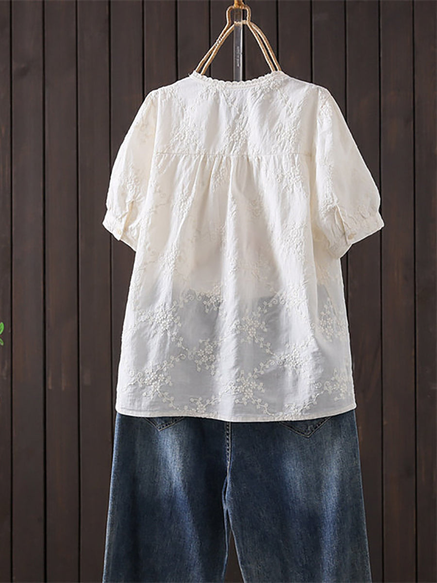 レディース 夏物 アーティスティック刺繍入りOネックブラウス