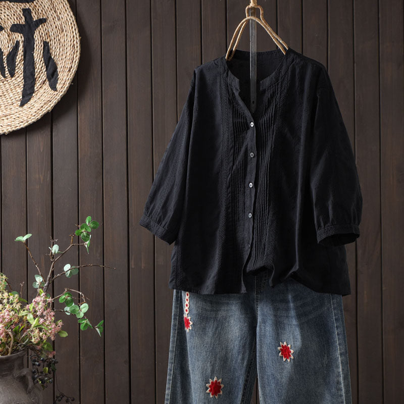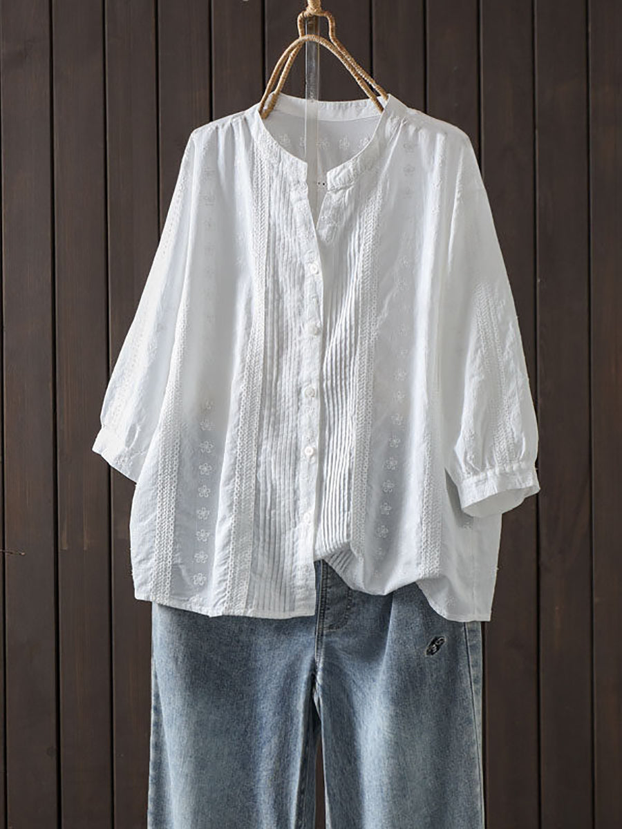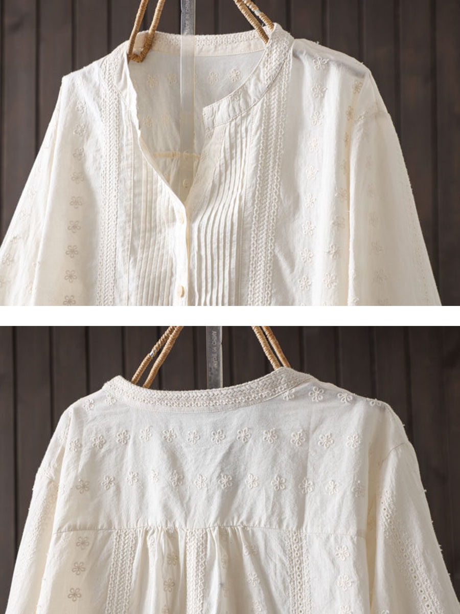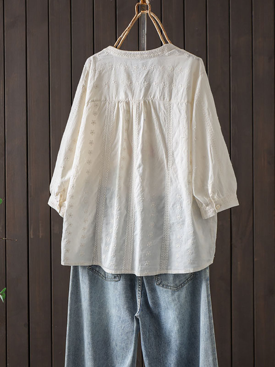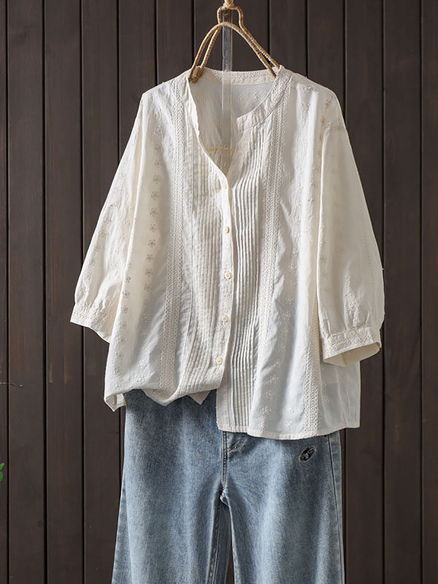 レディース 夏物 アーティスティック刺繍 シャーリング 100%コットン ブラウス