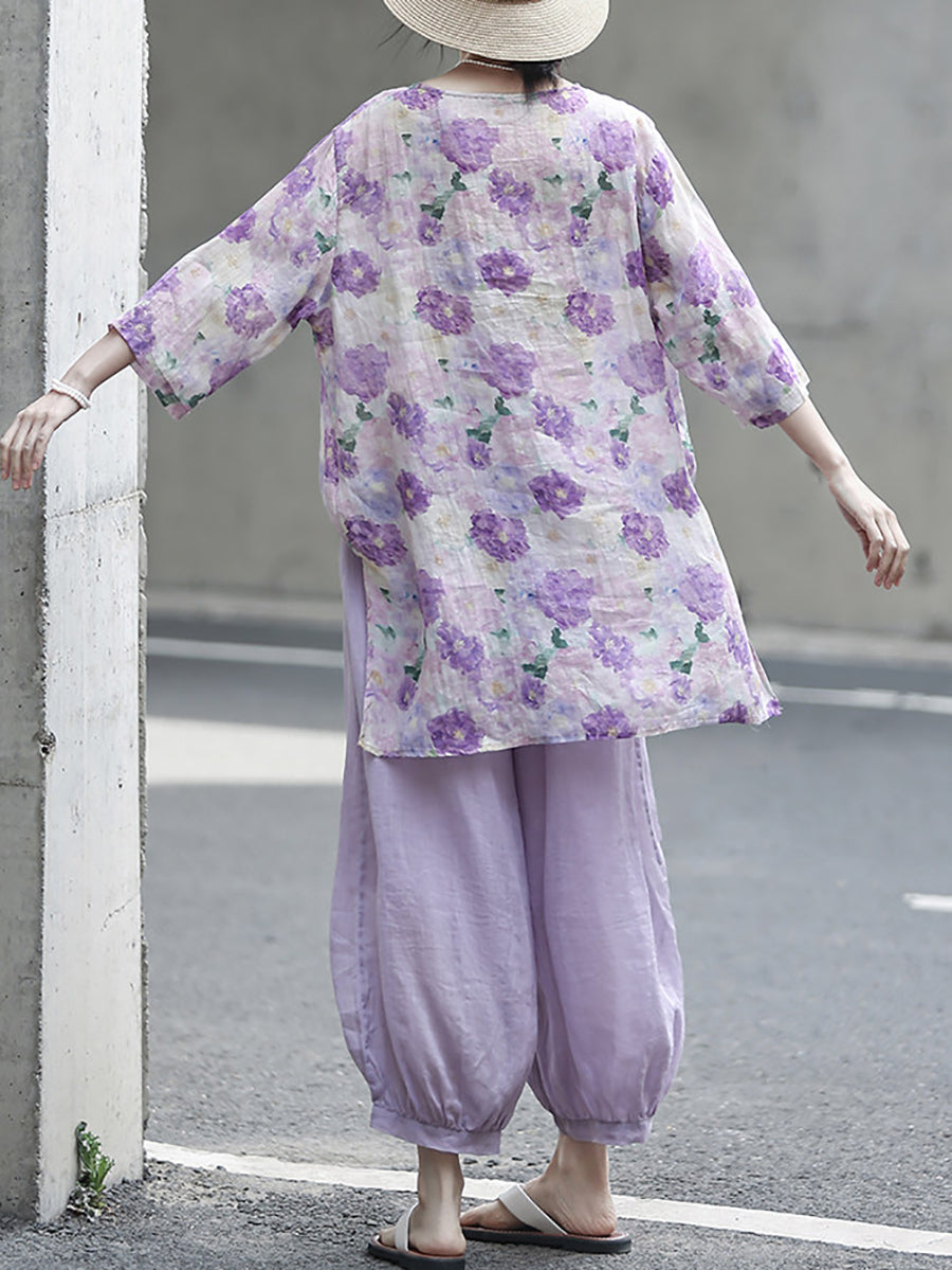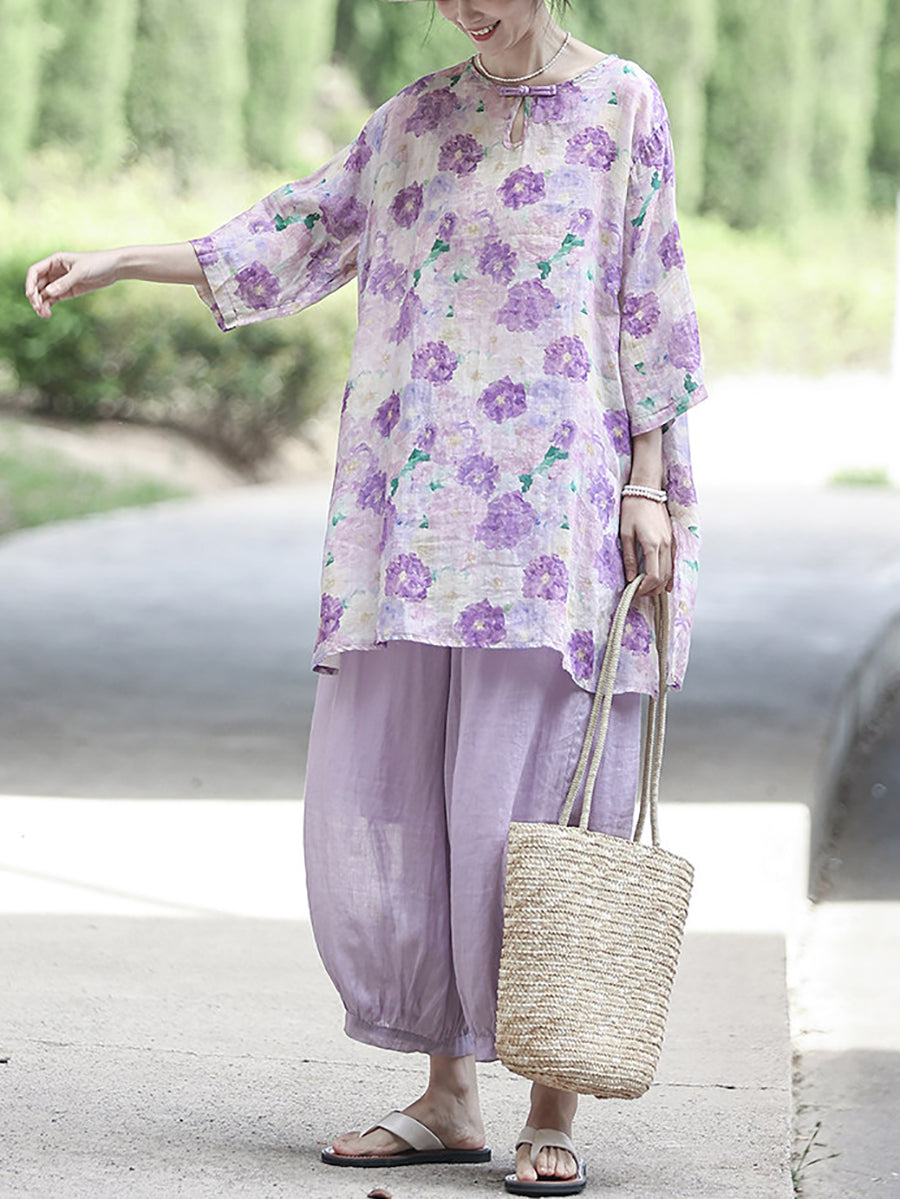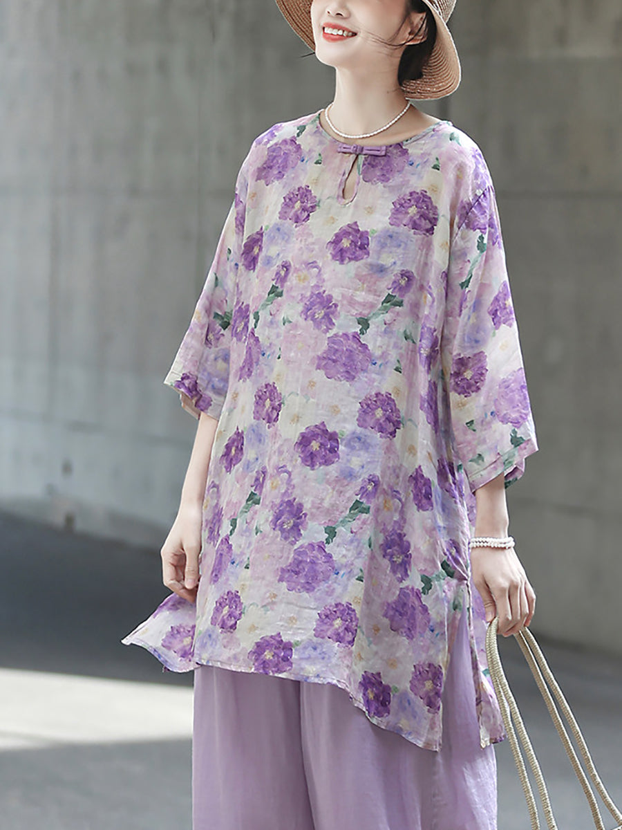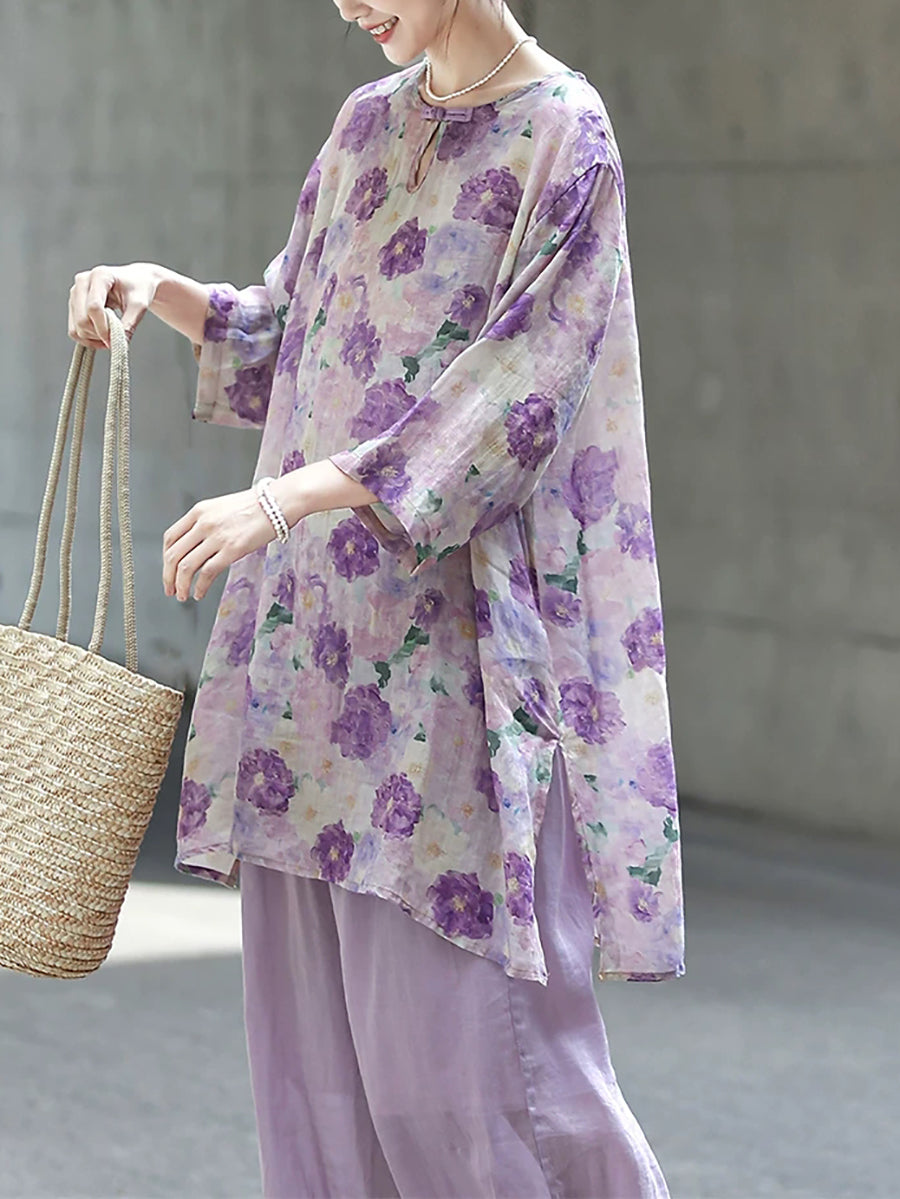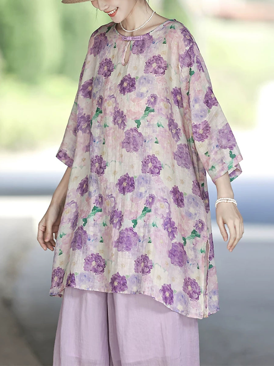 レディース サマー アーティスティックフラワー 100%ラミーシャツ