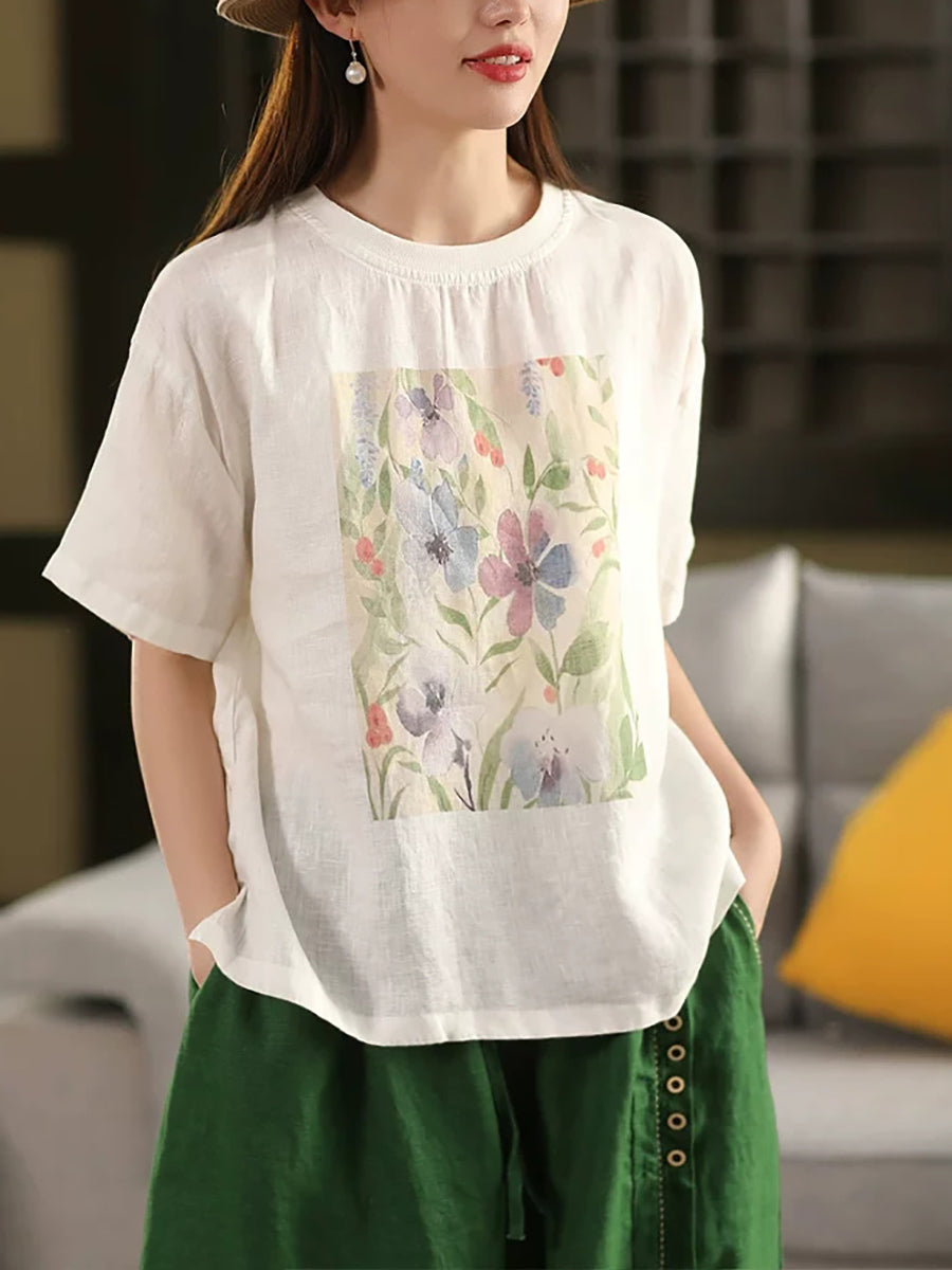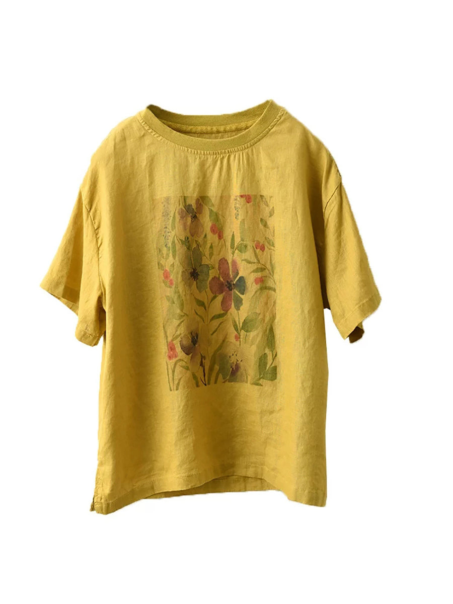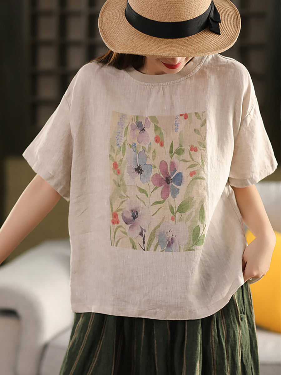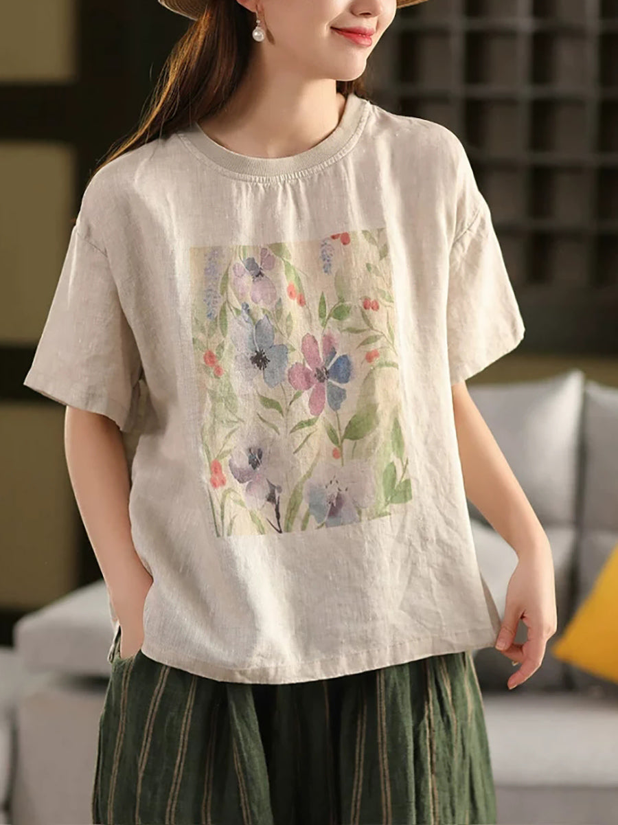 レディース サマー アーティスティックフラワー Oネック 100%リネンシャツ
