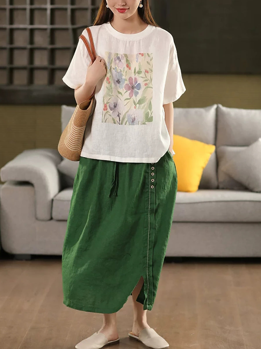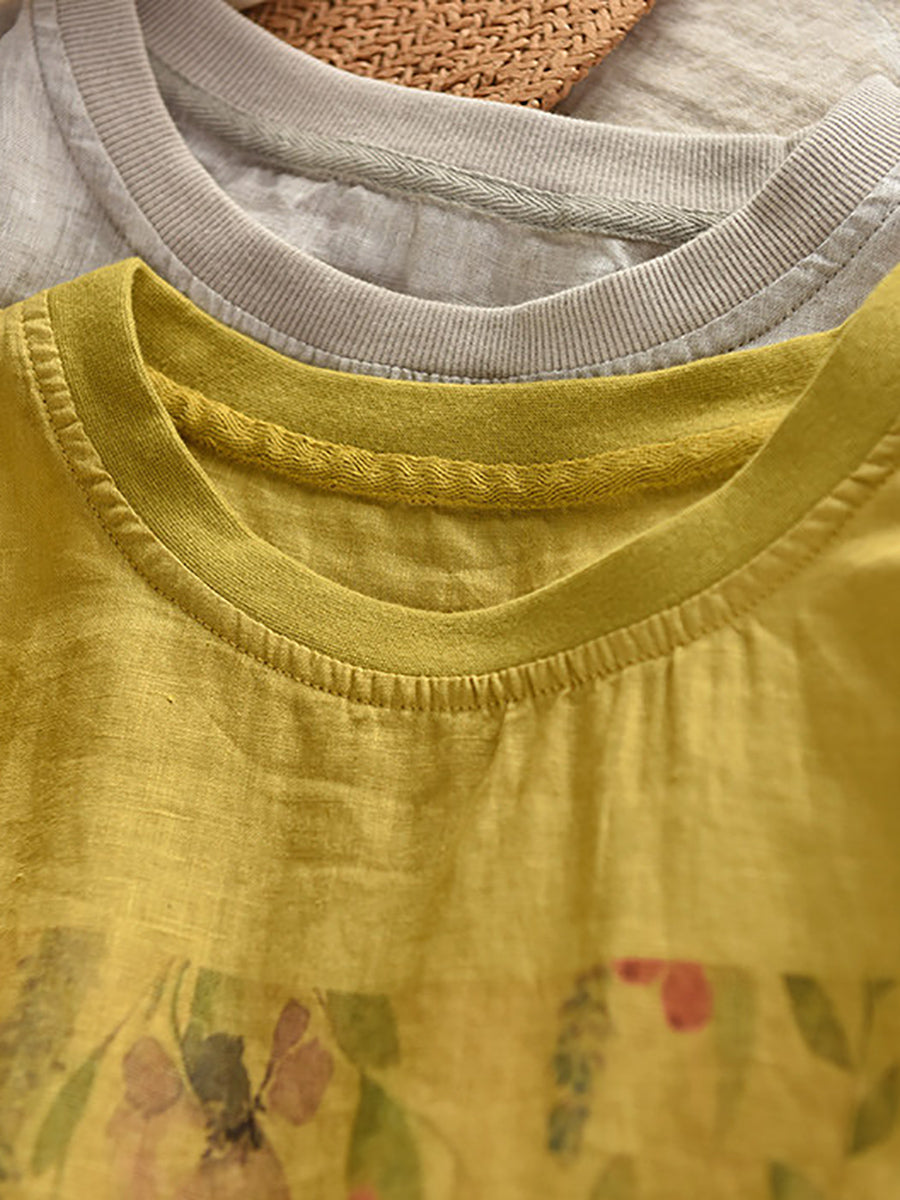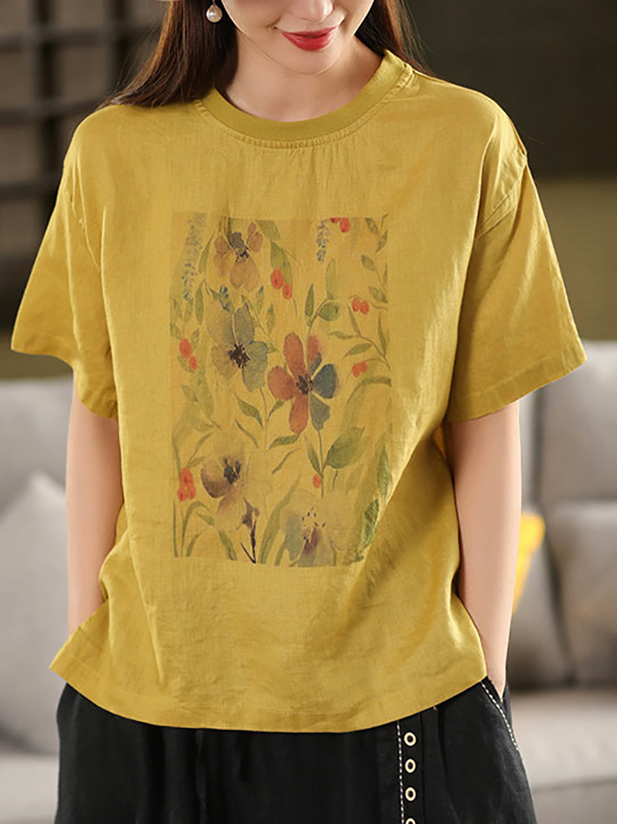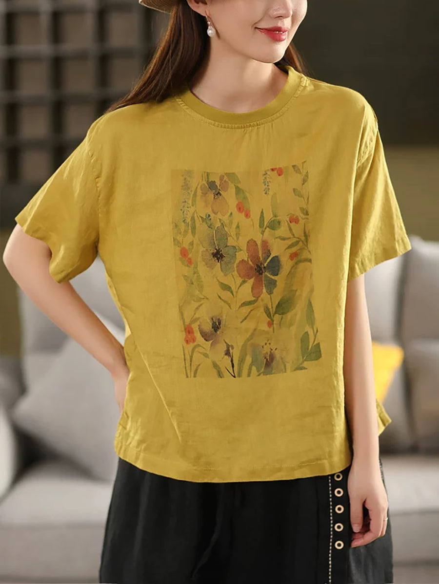 レディース サマー アーティスティックフラワー Oネック 100%リネンシャツ