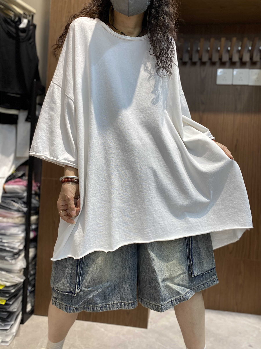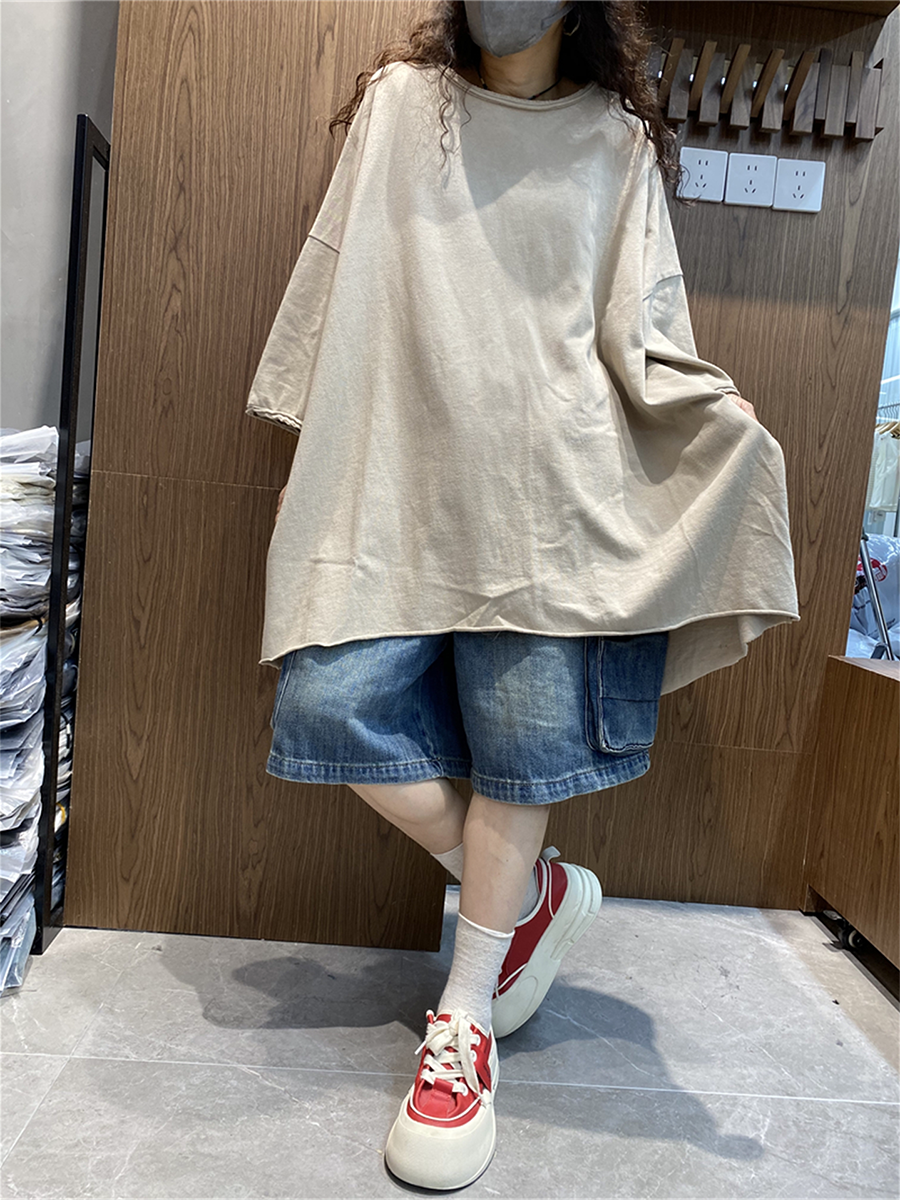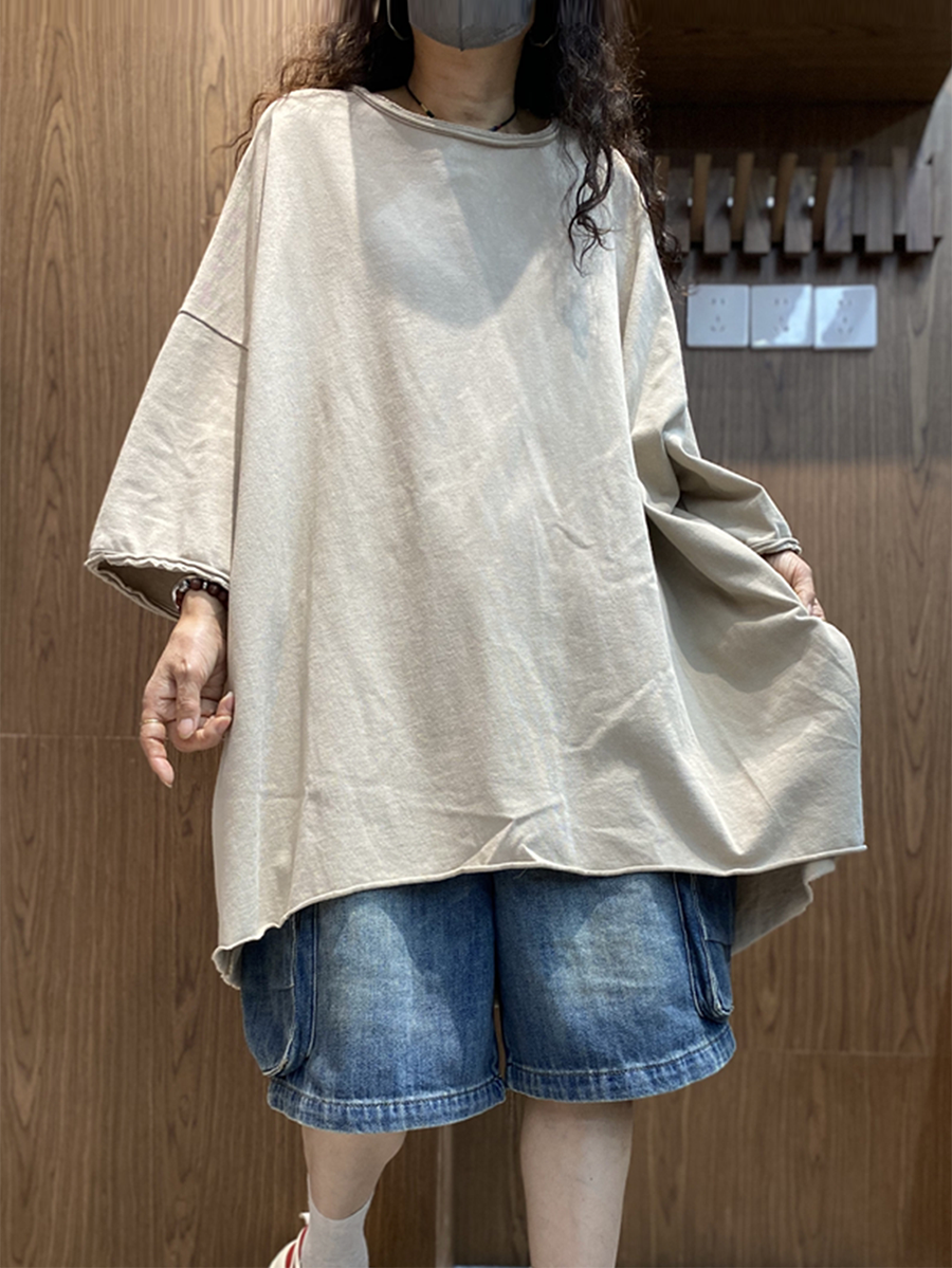 レディース サマー アーティスティック ピュアカラー コットン Oネック ブラウス