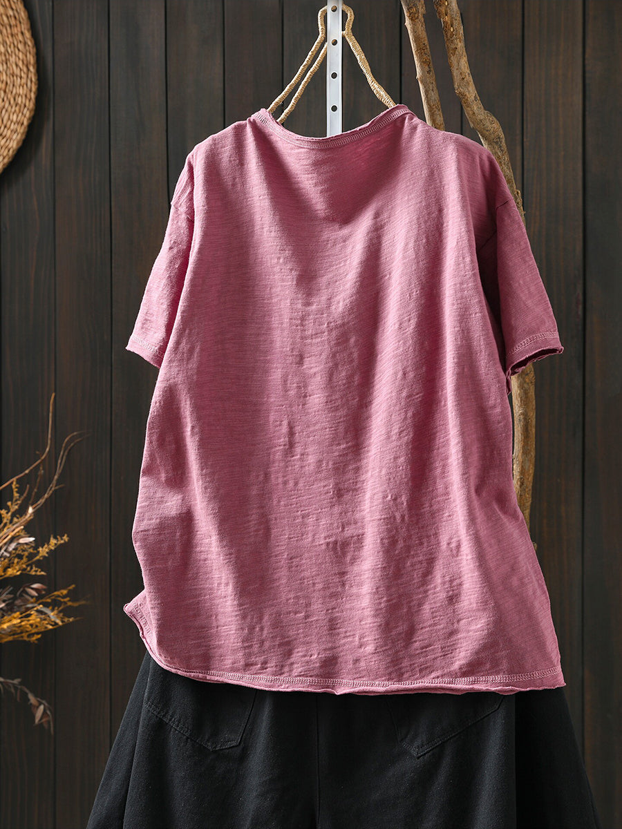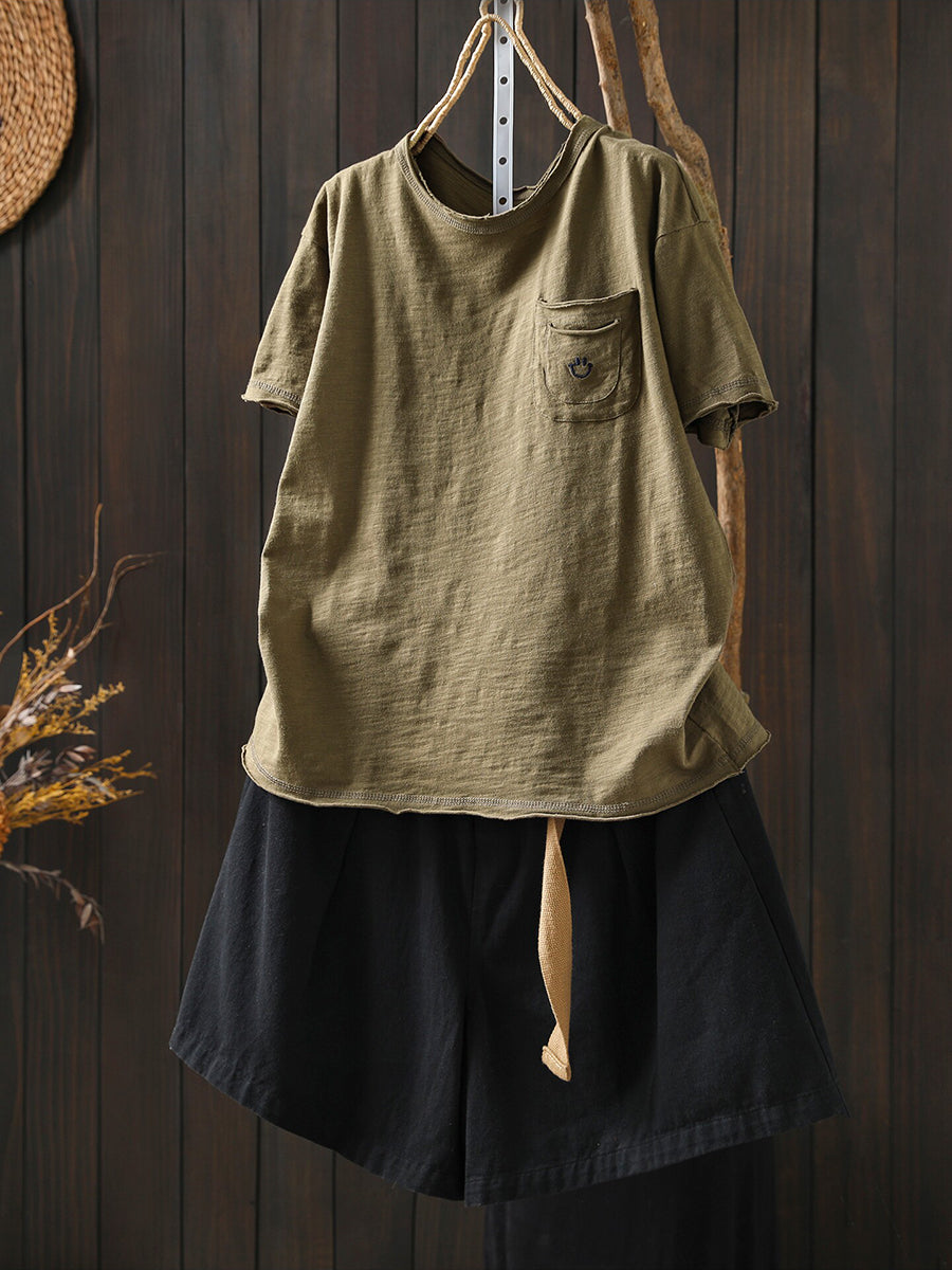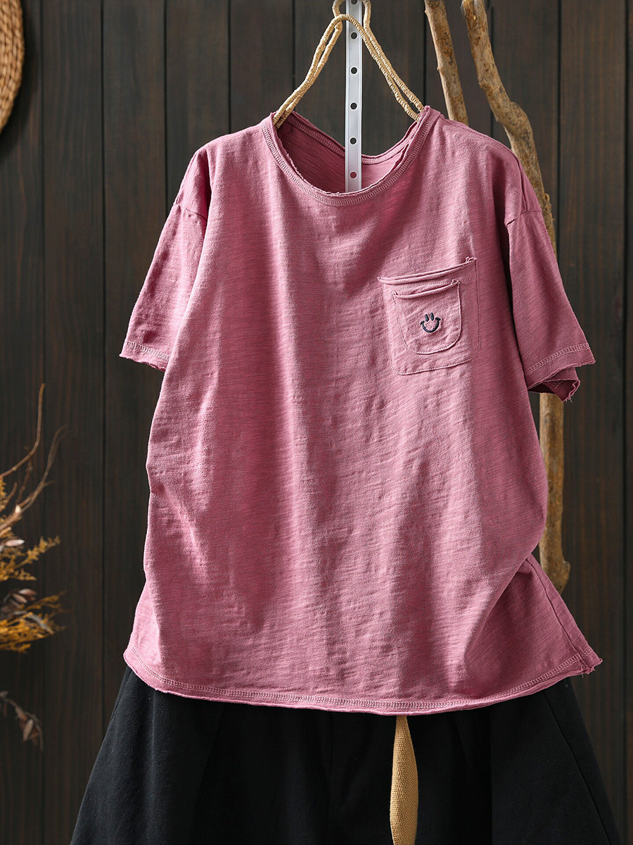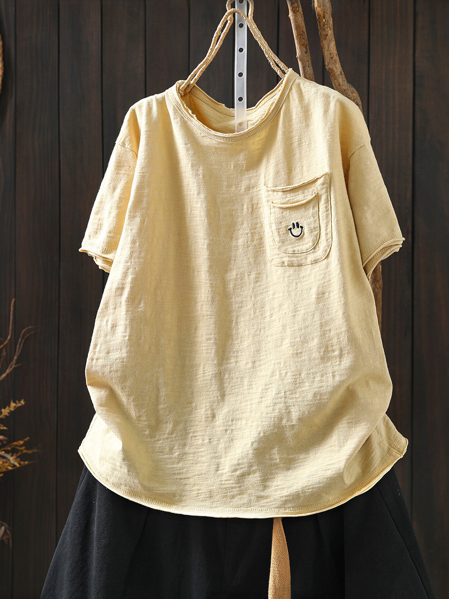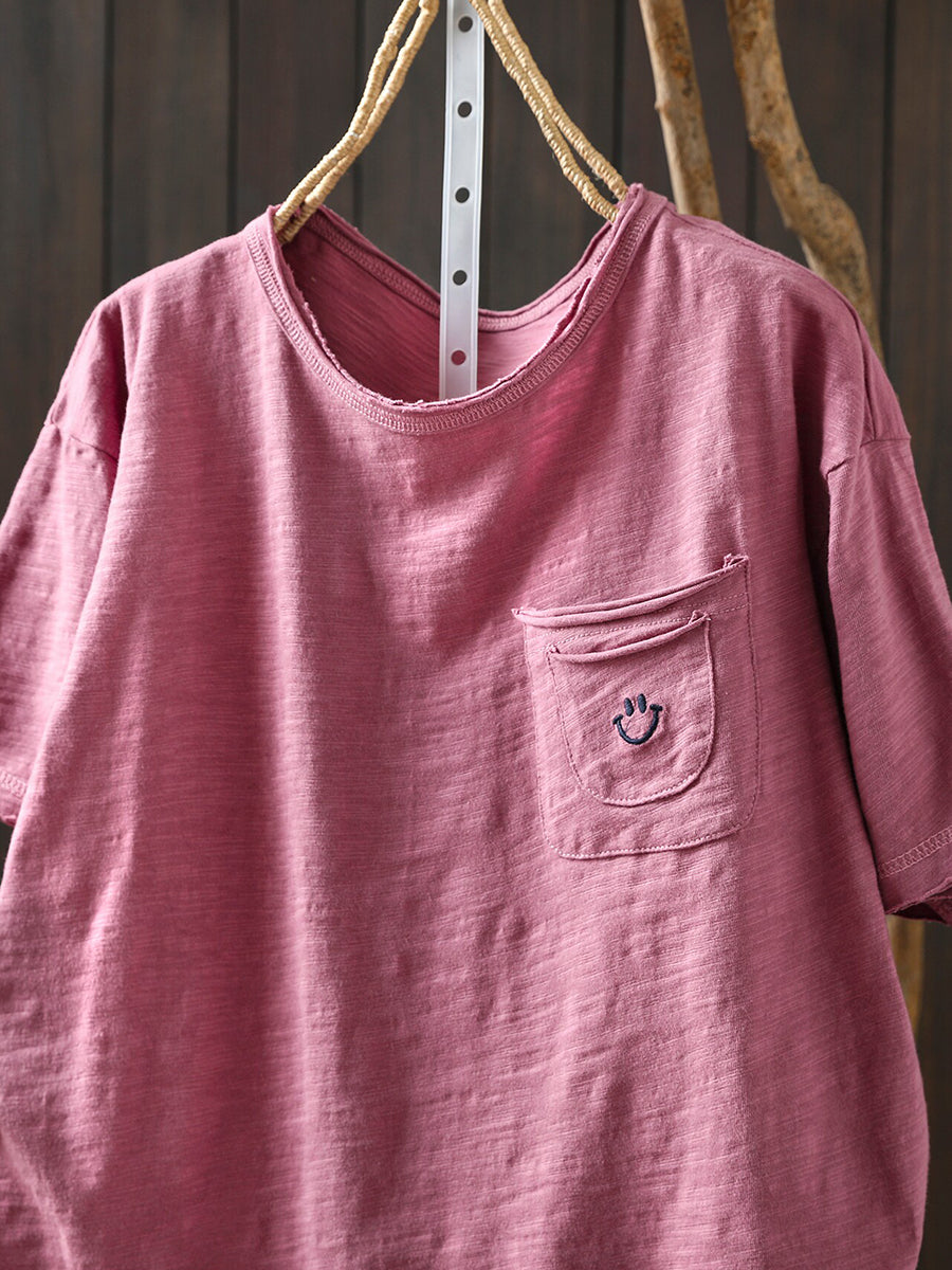 レディース サマー アーティスティック スマイル Oネック 100%コットンシャツ