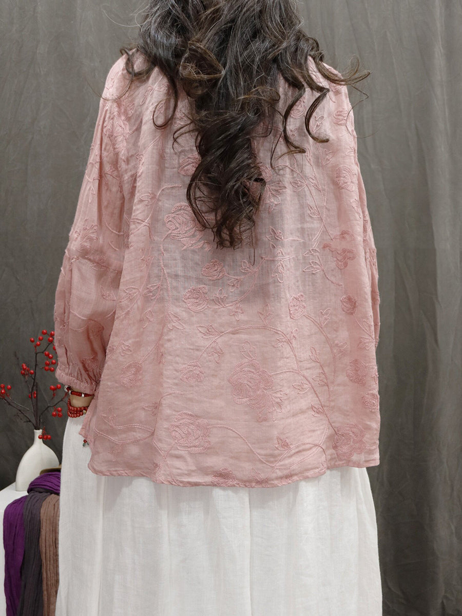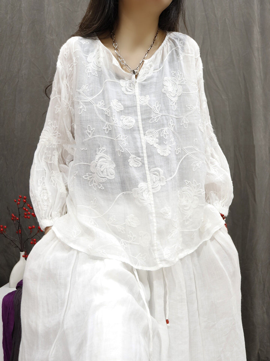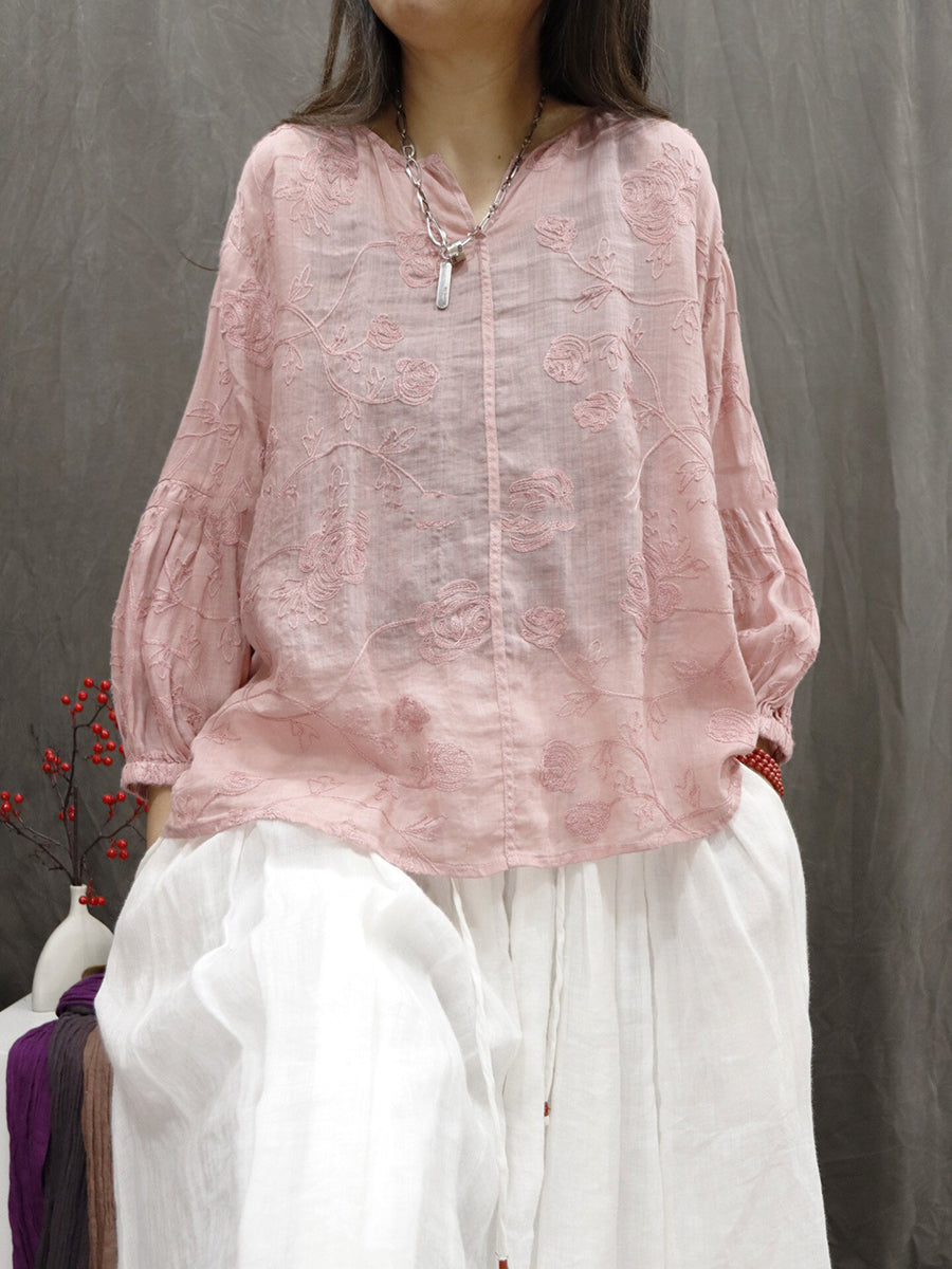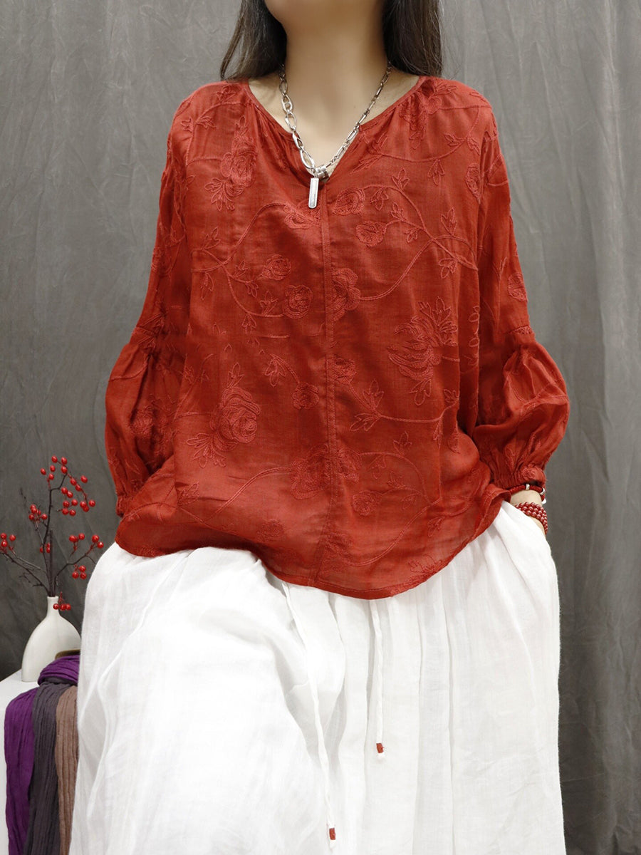 レディース 夏物 アーティスティック Vネック 刺繍入り 100%ラミー ブラウス