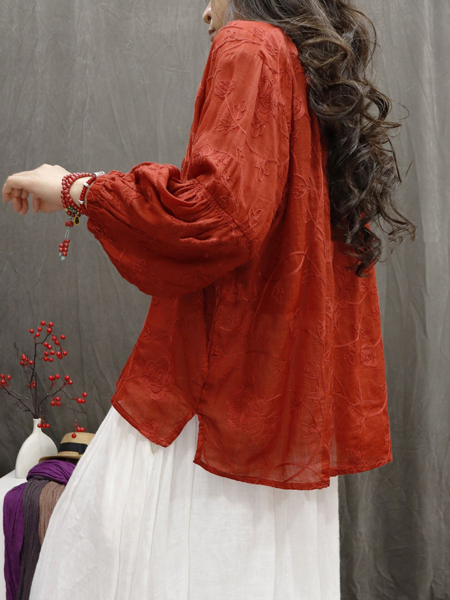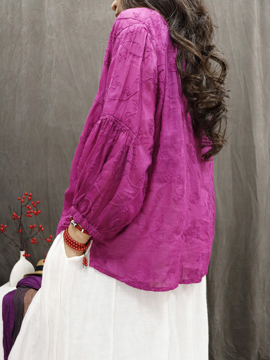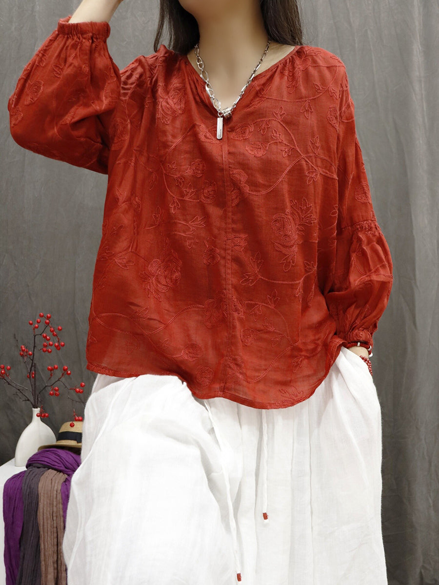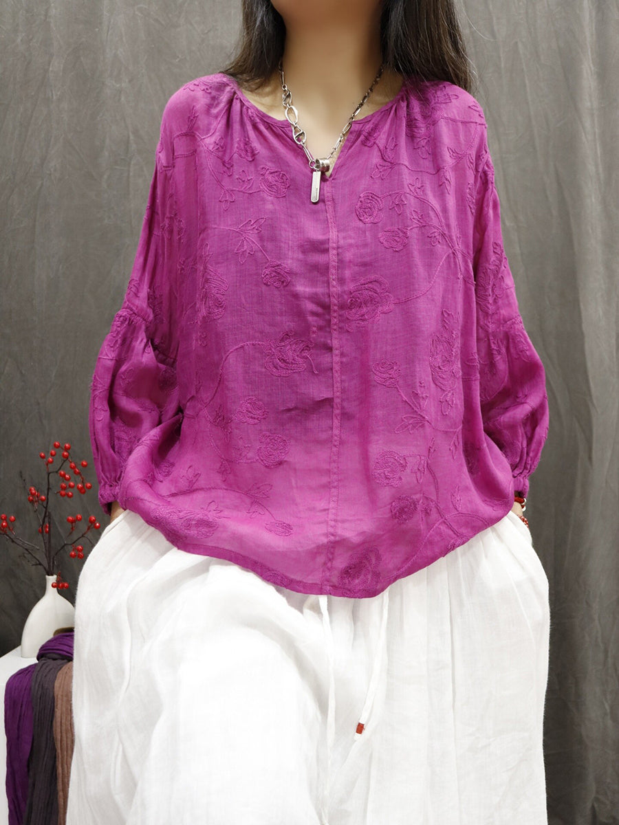 レディース 夏物 アーティスティック Vネック 刺繍入り 100%ラミー ブラウス