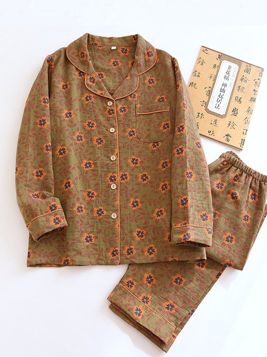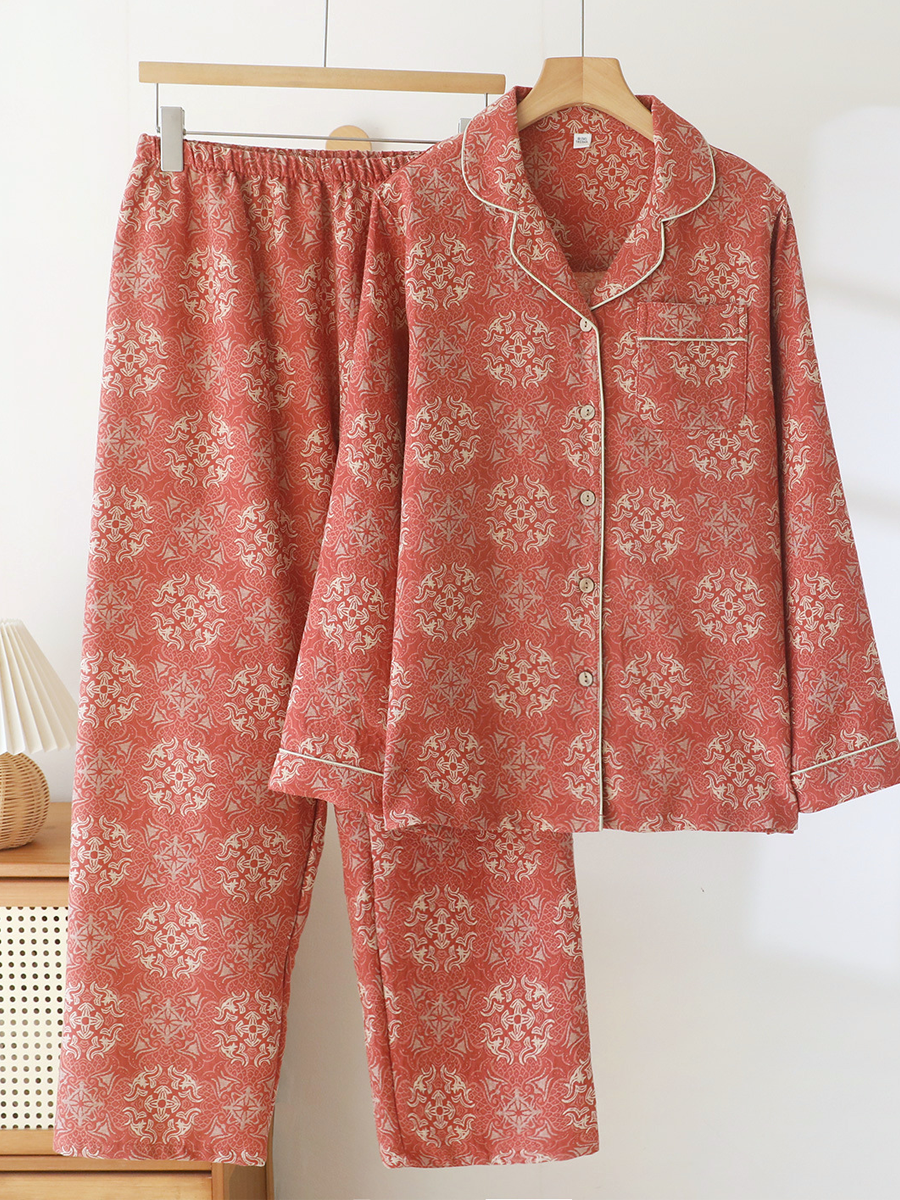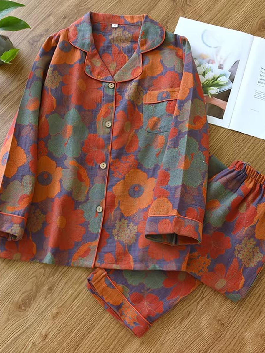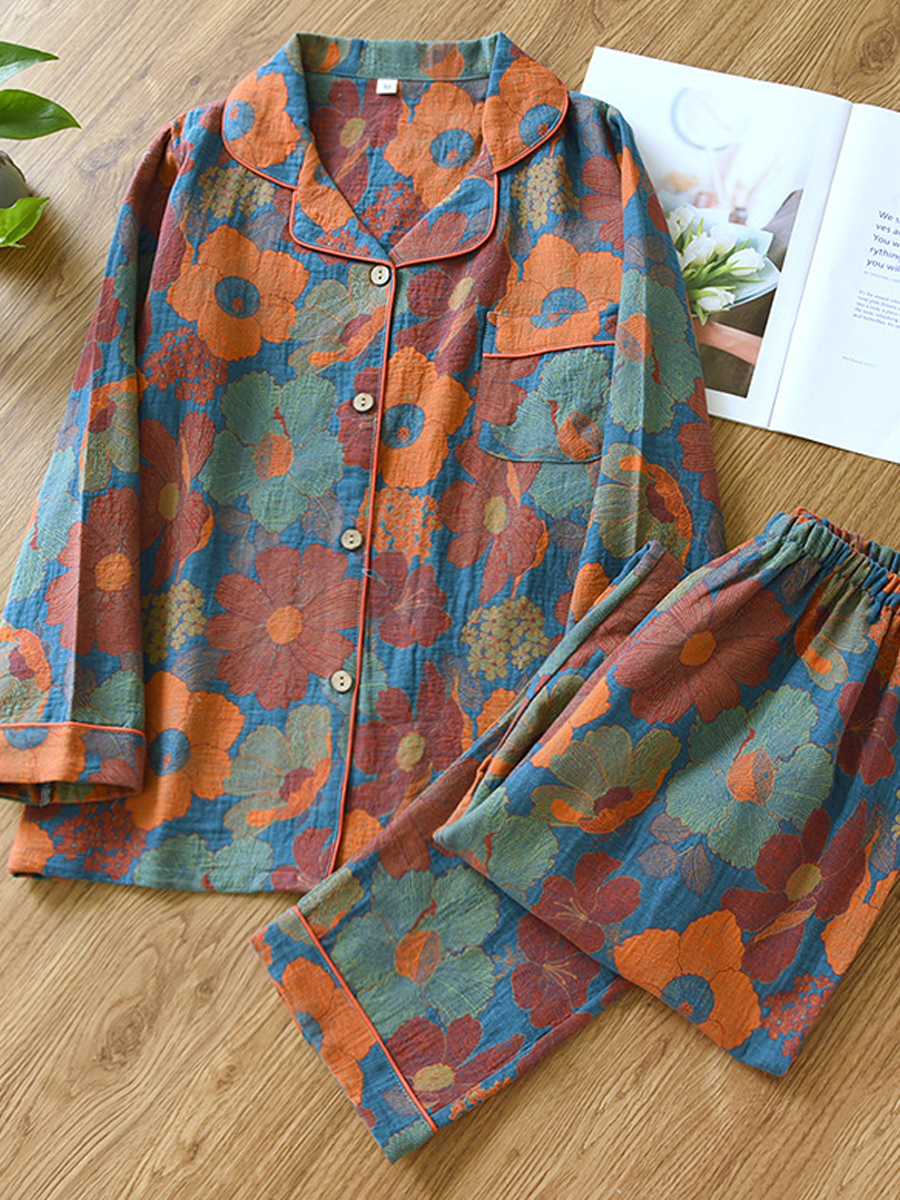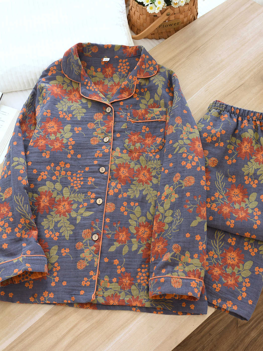 の レディース 夏用 花柄 ホームウェア パジャマセット 柔らかなジャカードガーゼ素材を使用し、快適な着心地を実現しました。Vネック、花柄、長袖、伸縮性のあるウエストバンドが特徴のスタイリッシュなセットで、フルレングスのパンツは自宅でのリラックスタイムに最適です。