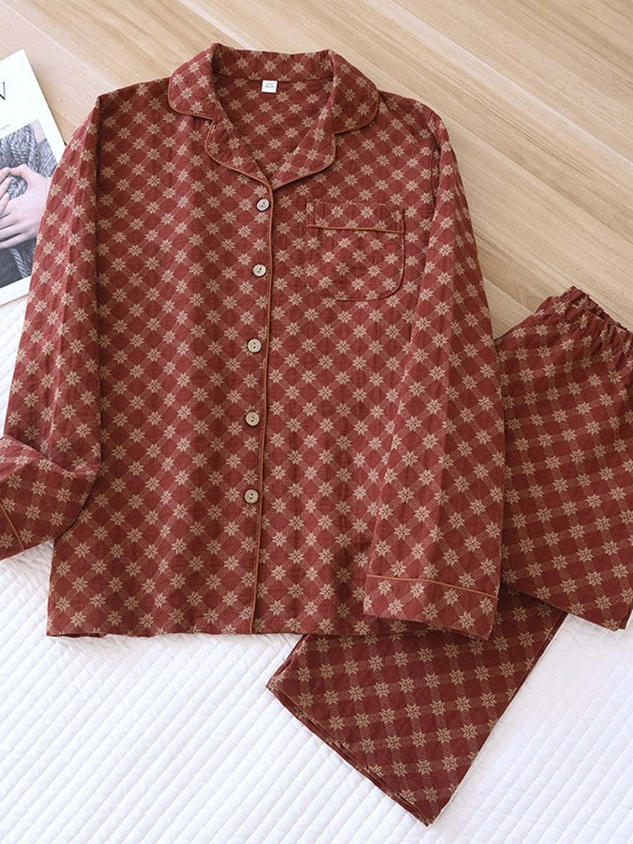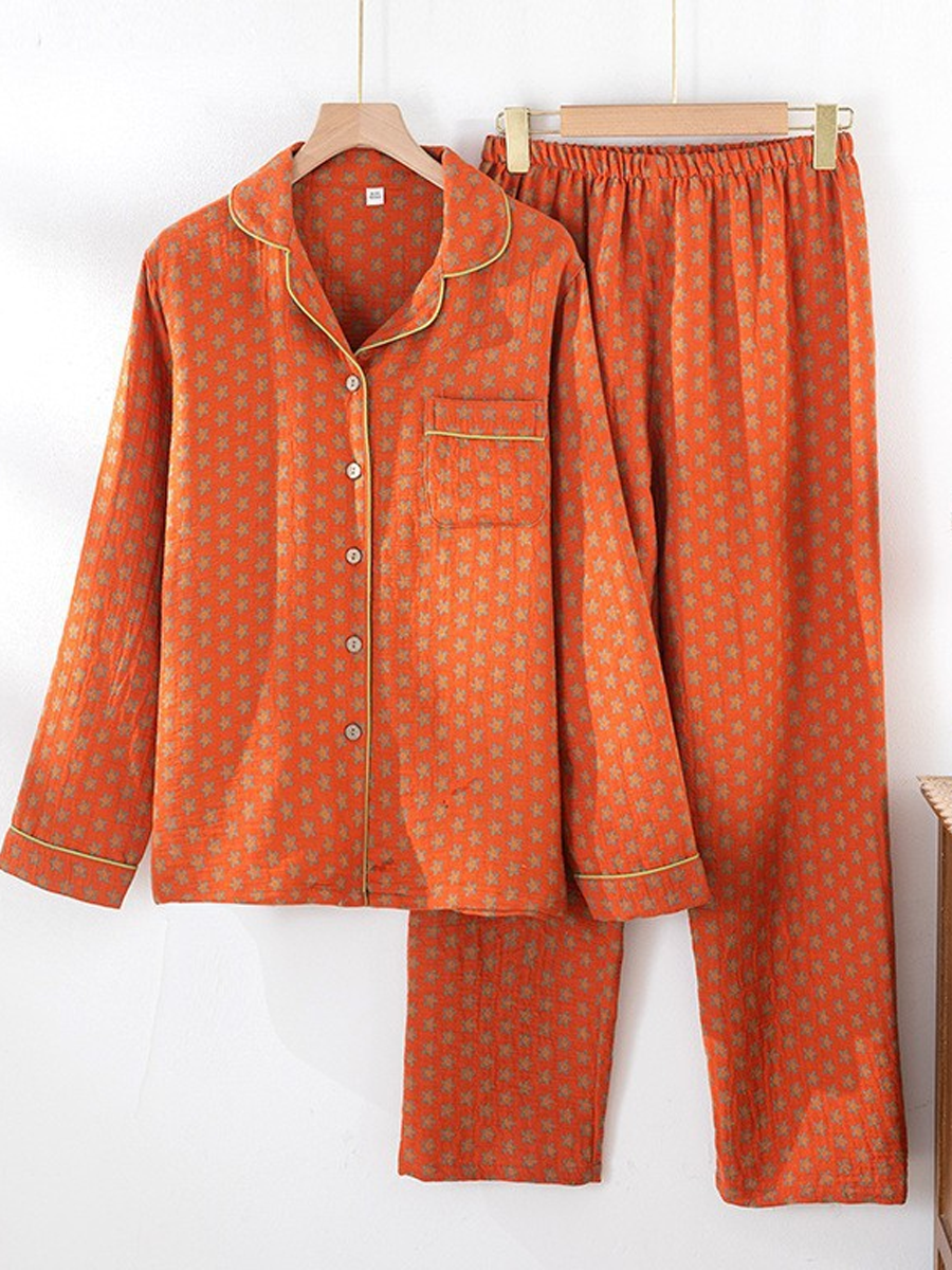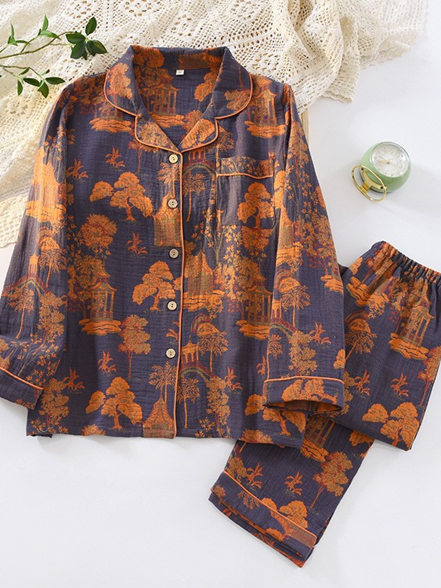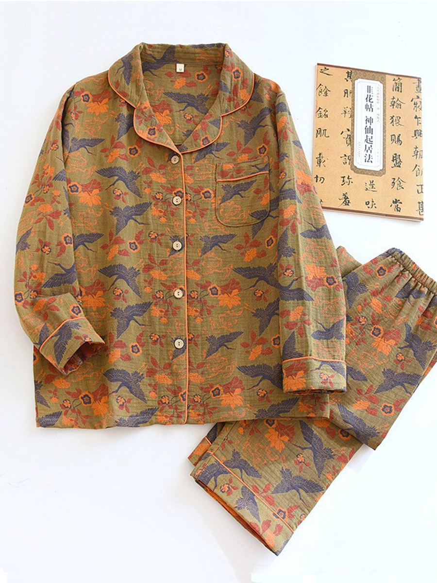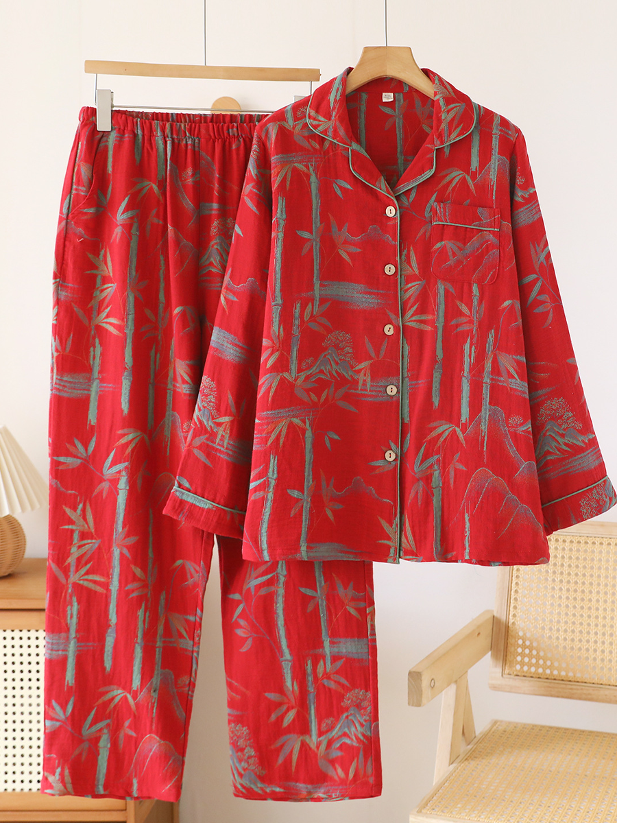 の レディース 夏用 花柄 ホームウェア パジャマセット 柔らかなジャカードガーゼ素材を使用し、快適な着心地を実現しました。Vネック、花柄、長袖、伸縮性のあるウエストバンドが特徴のスタイリッシュなセットで、フルレングスのパンツは自宅でのリラックスタイムに最適です。