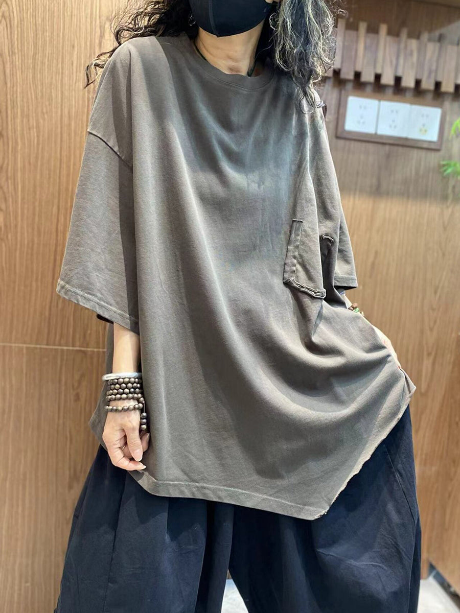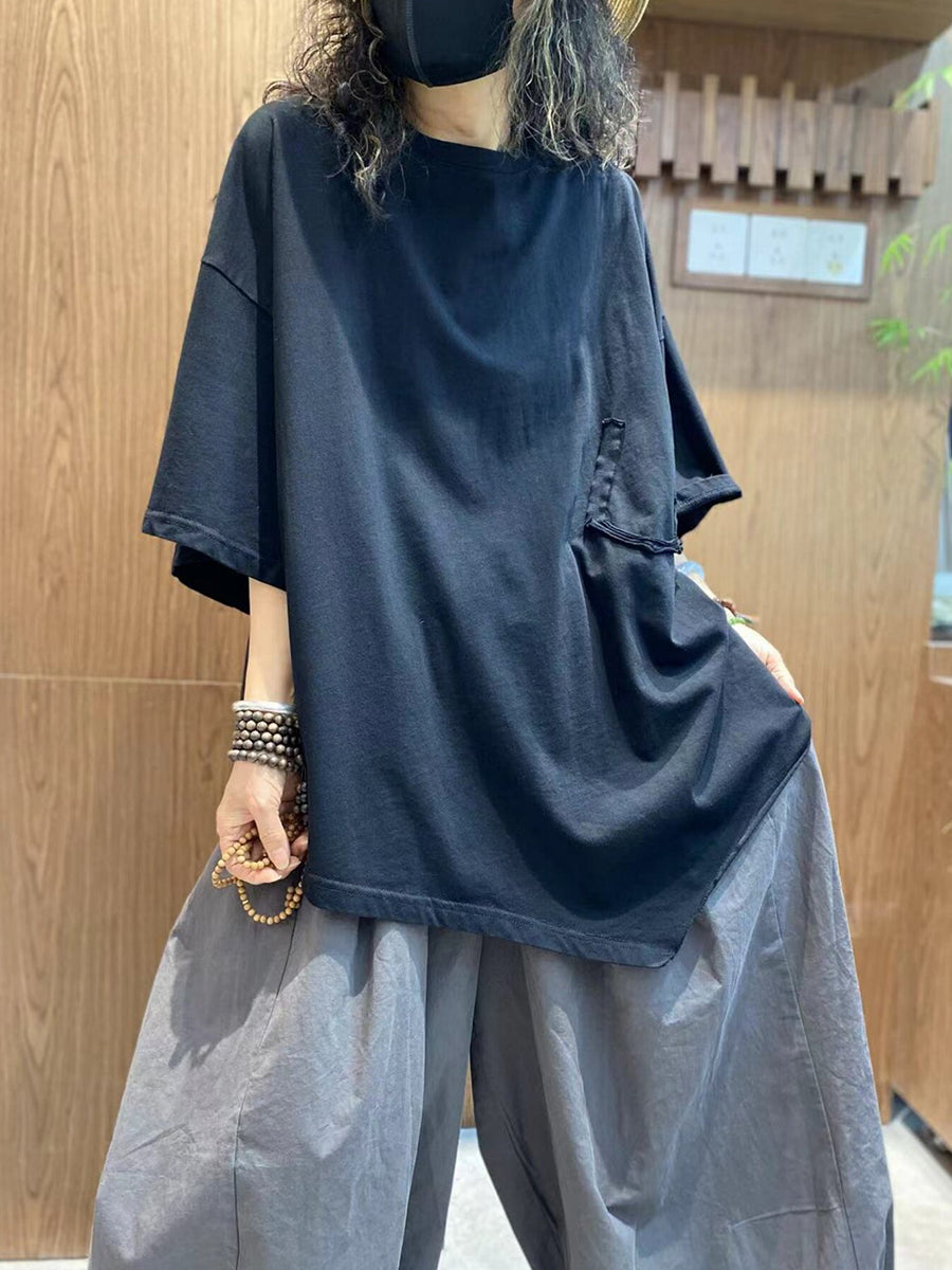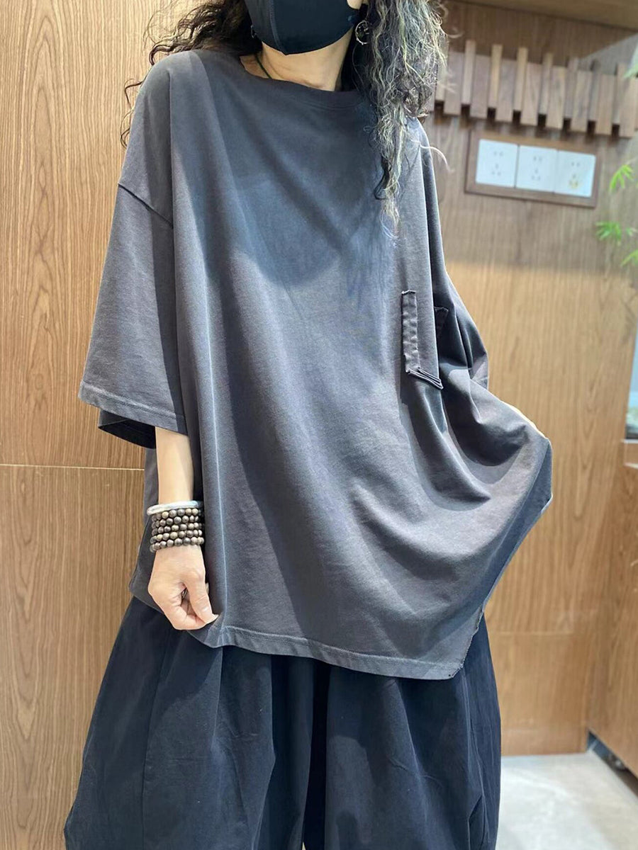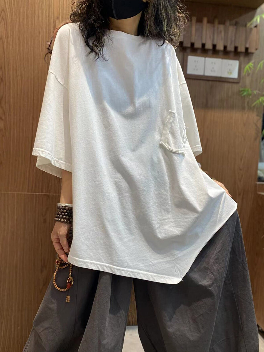 レディース サマー カジュアル ピュアカラー コットン Oネック ブラウス
