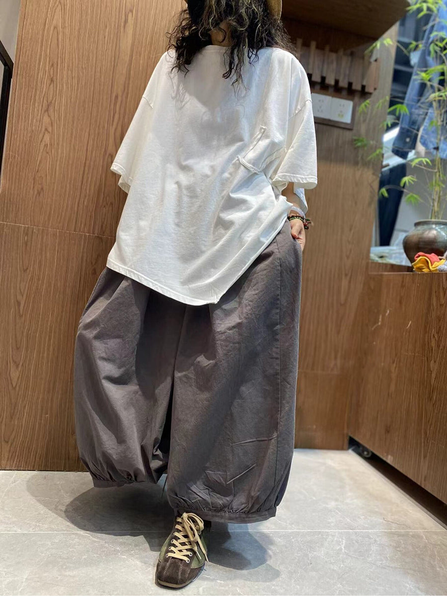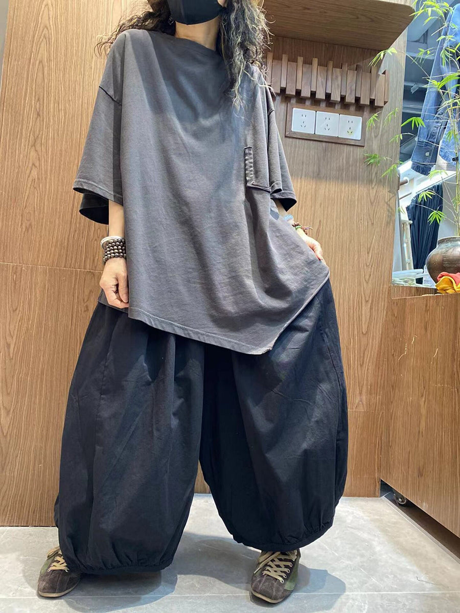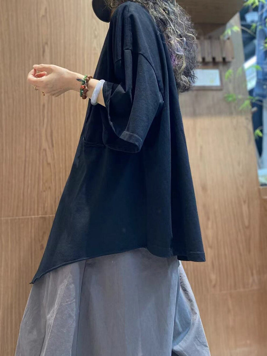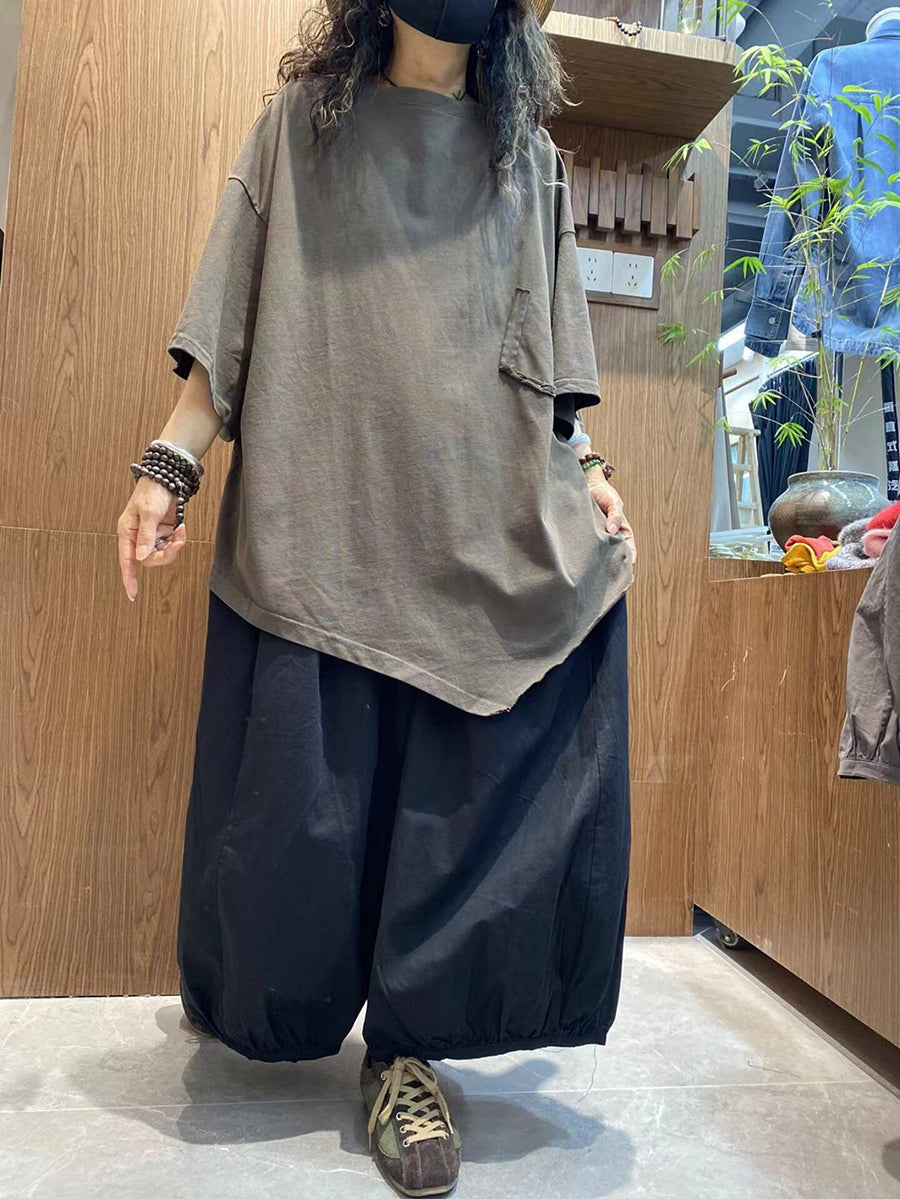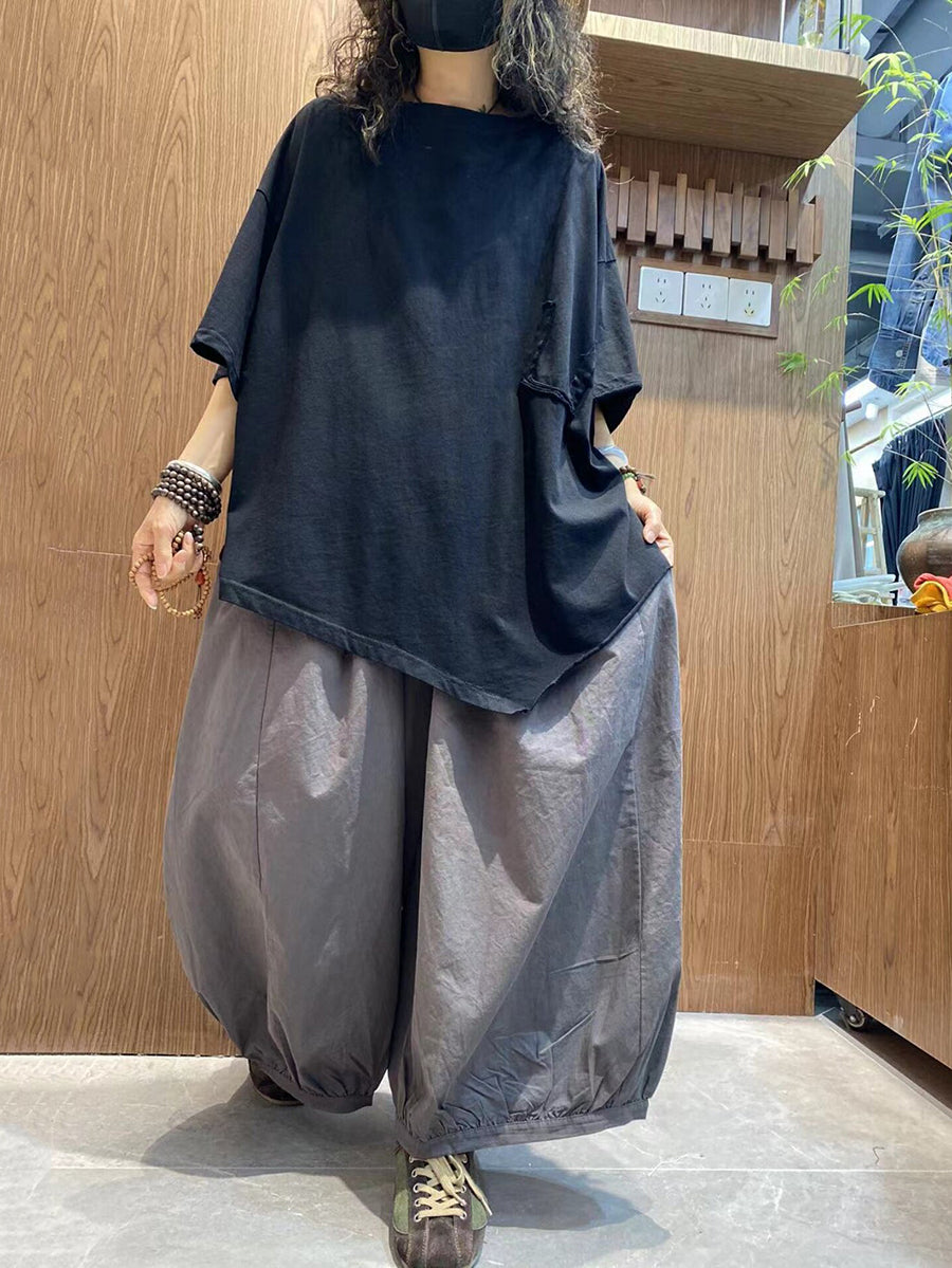 レディース サマー カジュアル ピュアカラー コットン Oネック ブラウス