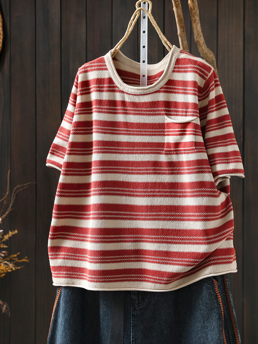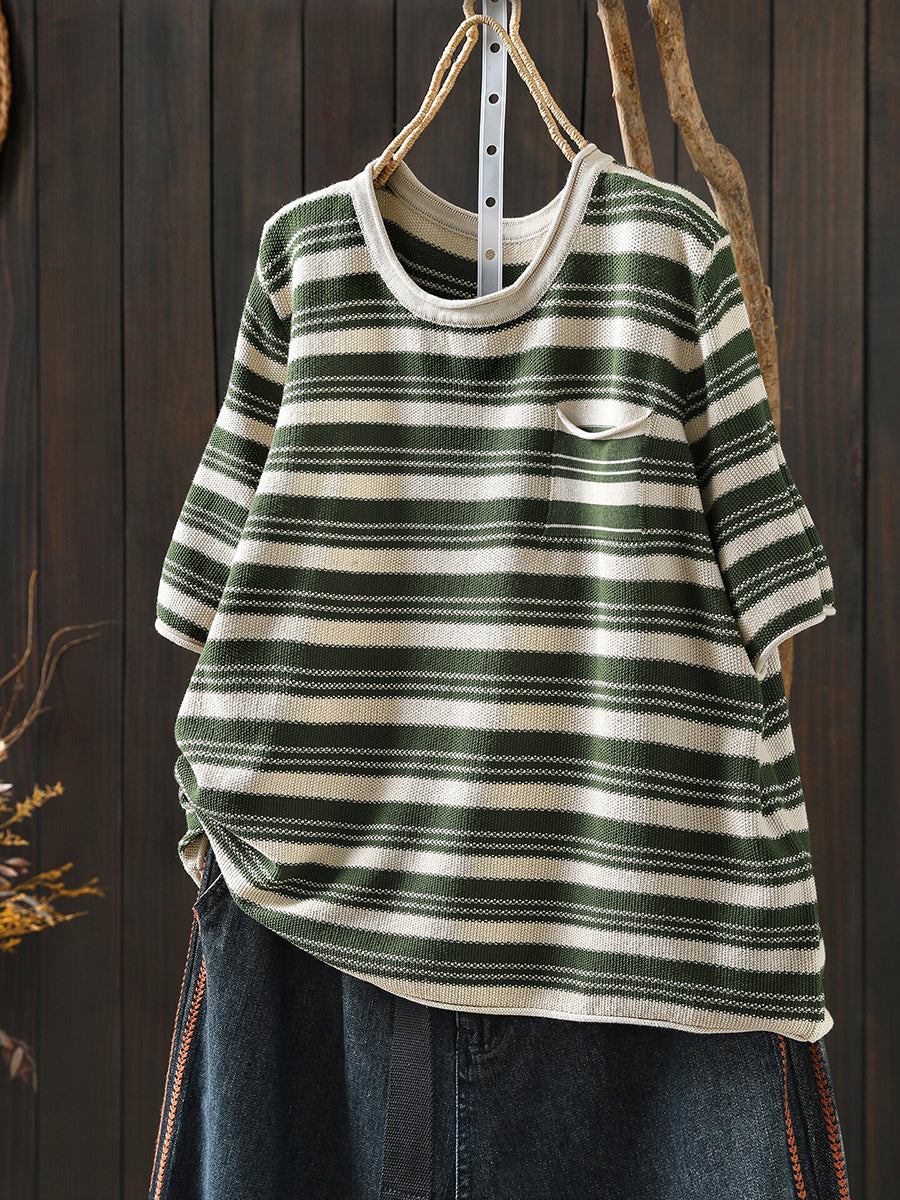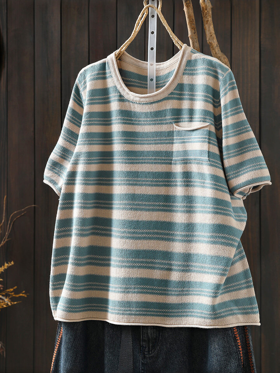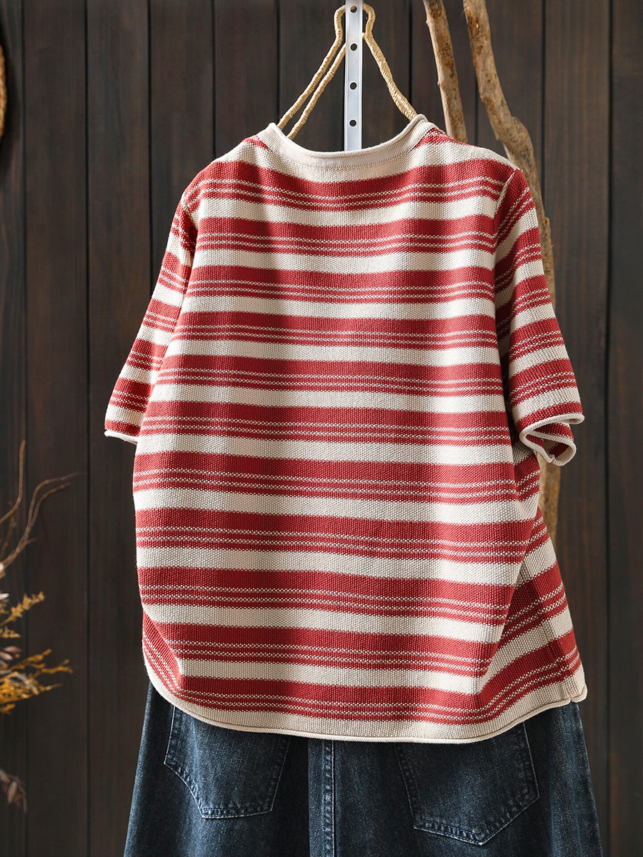レディース サマー カジュアル ストライプ Oネック コットンシャツ