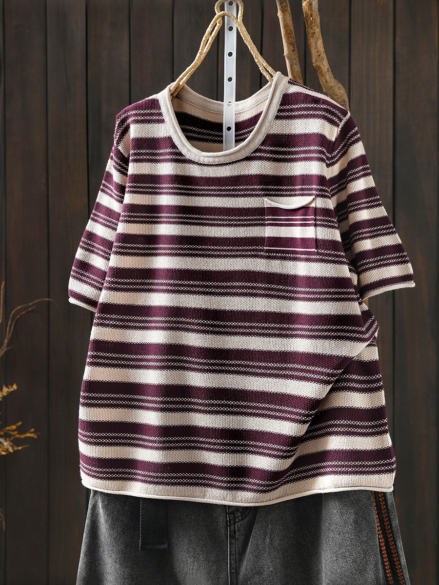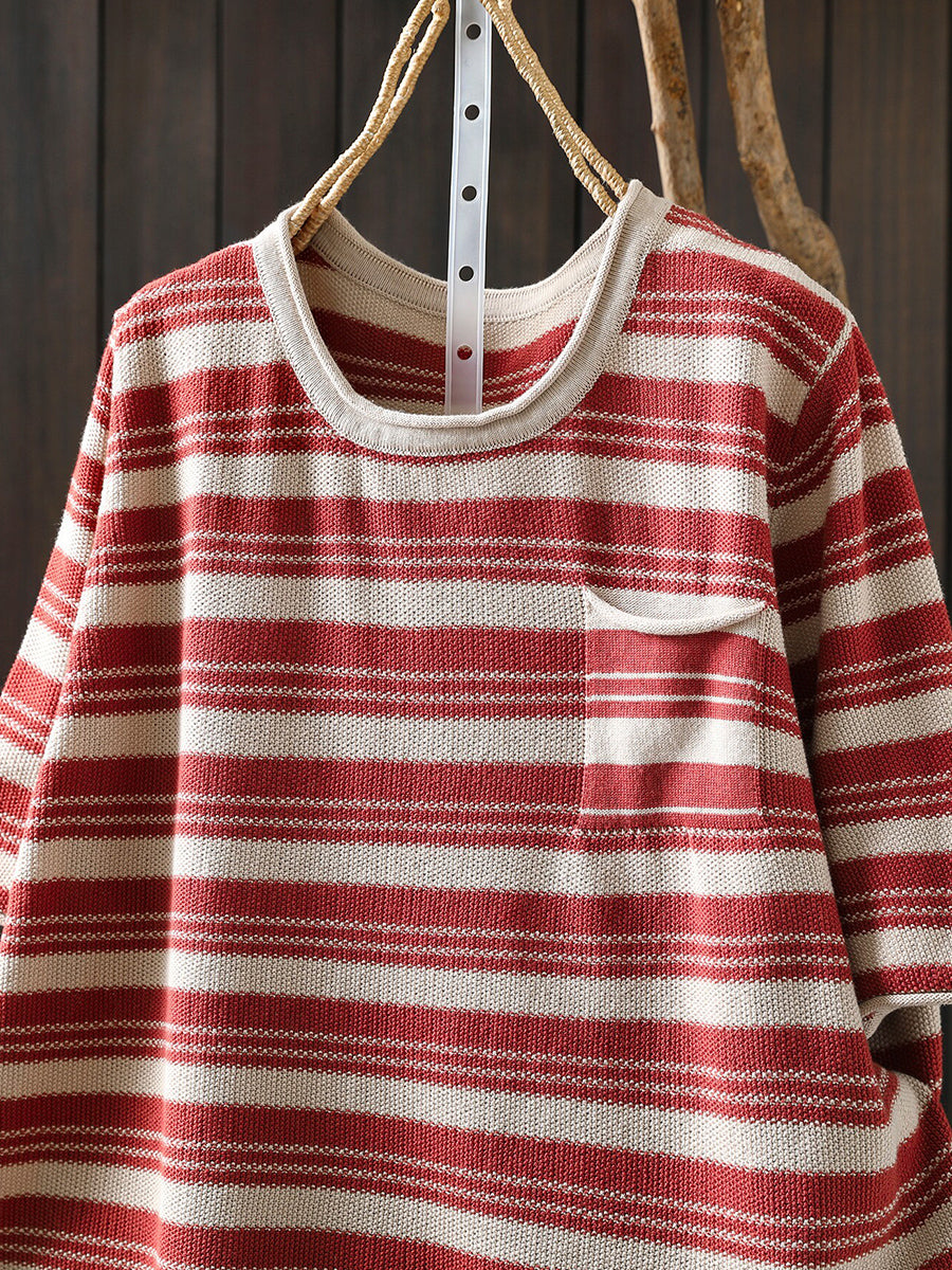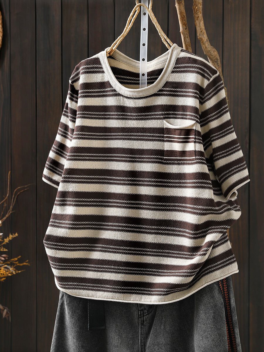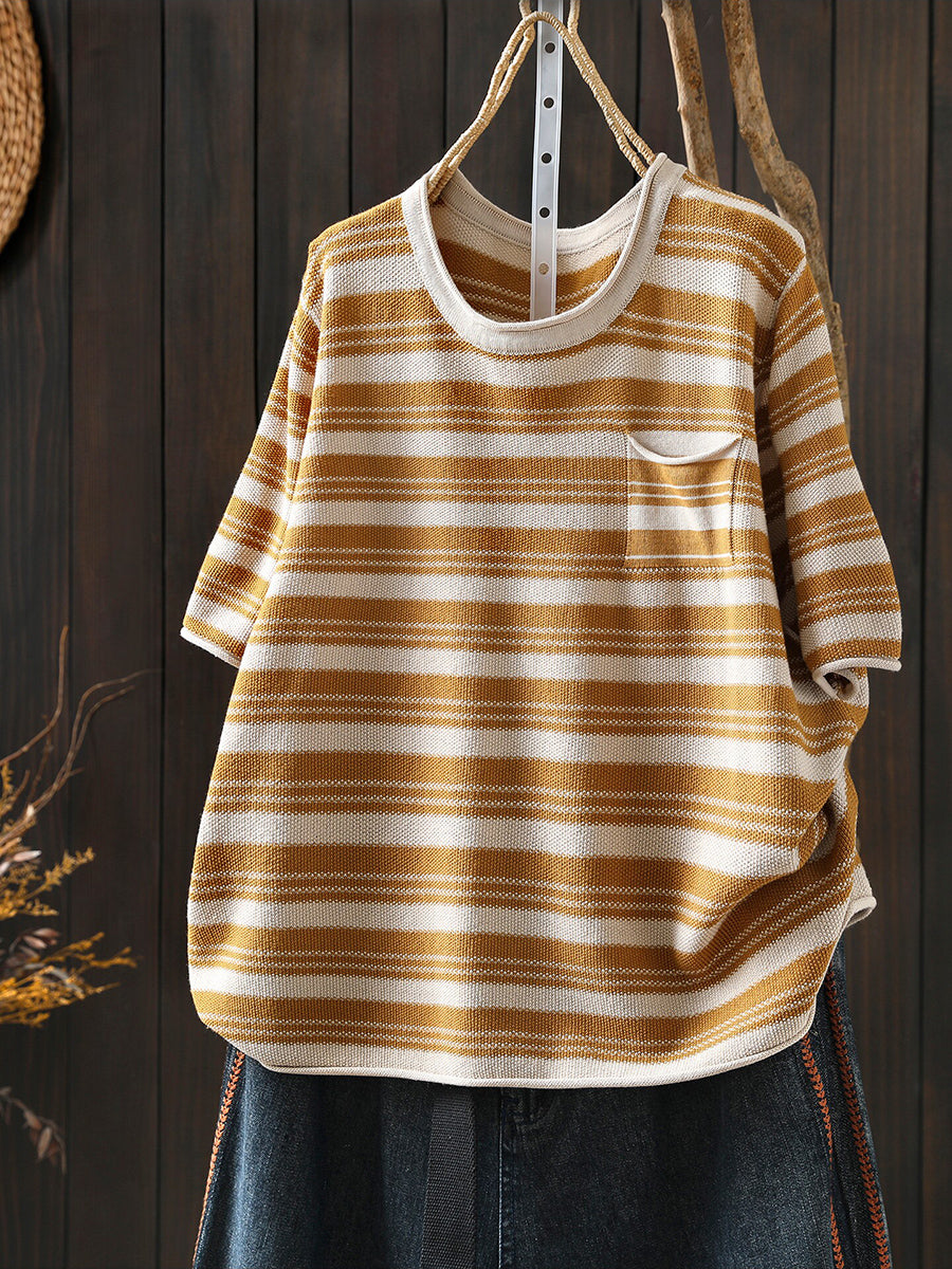 レディース サマー カジュアル ストライプ Oネック コットンシャツ
