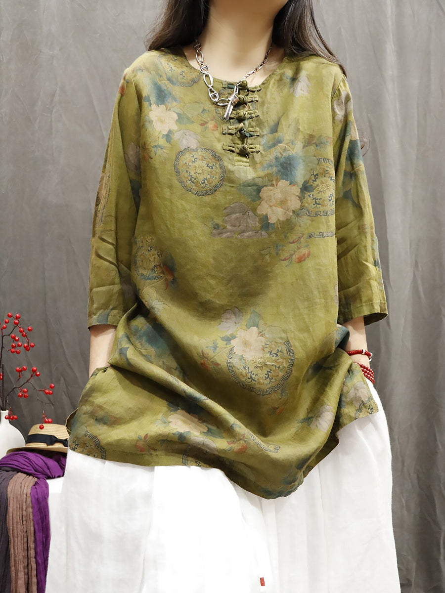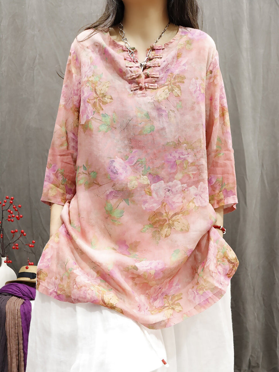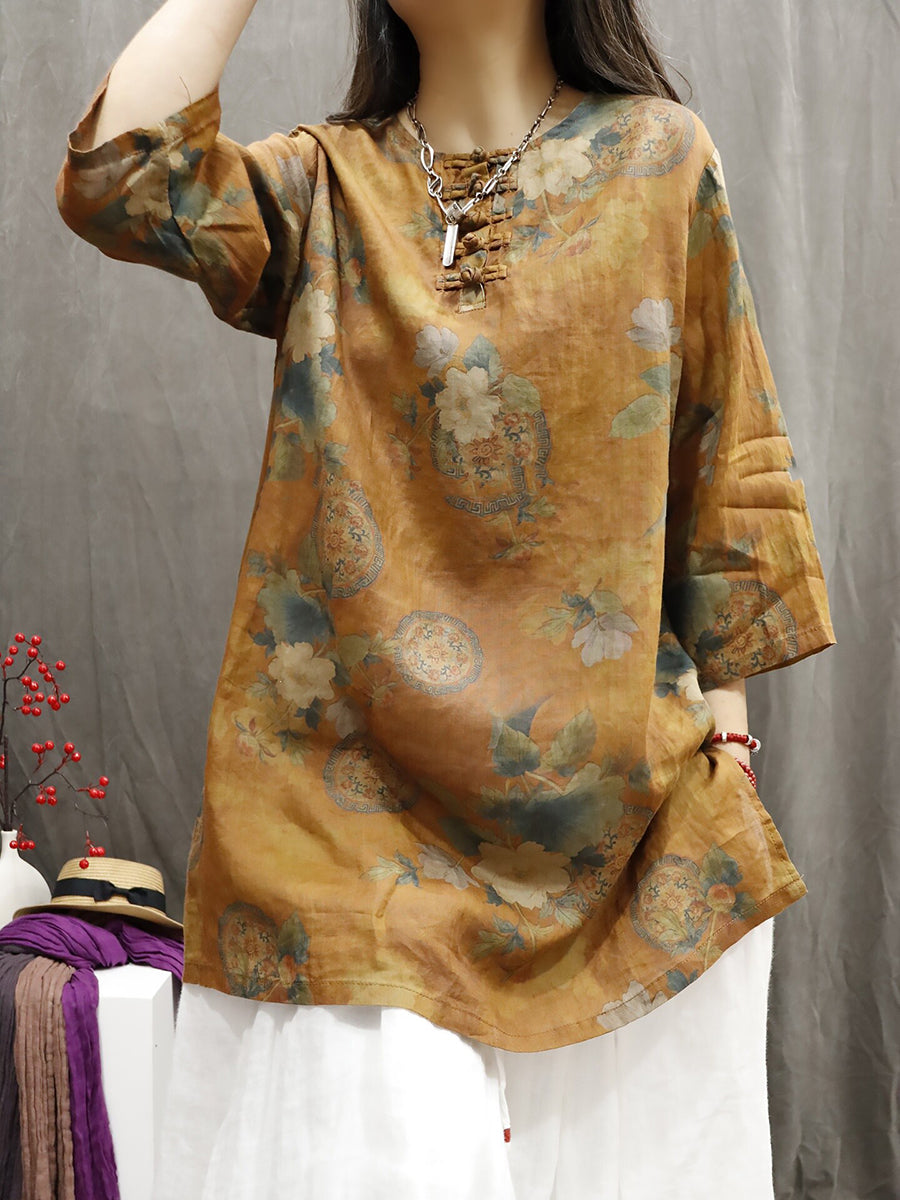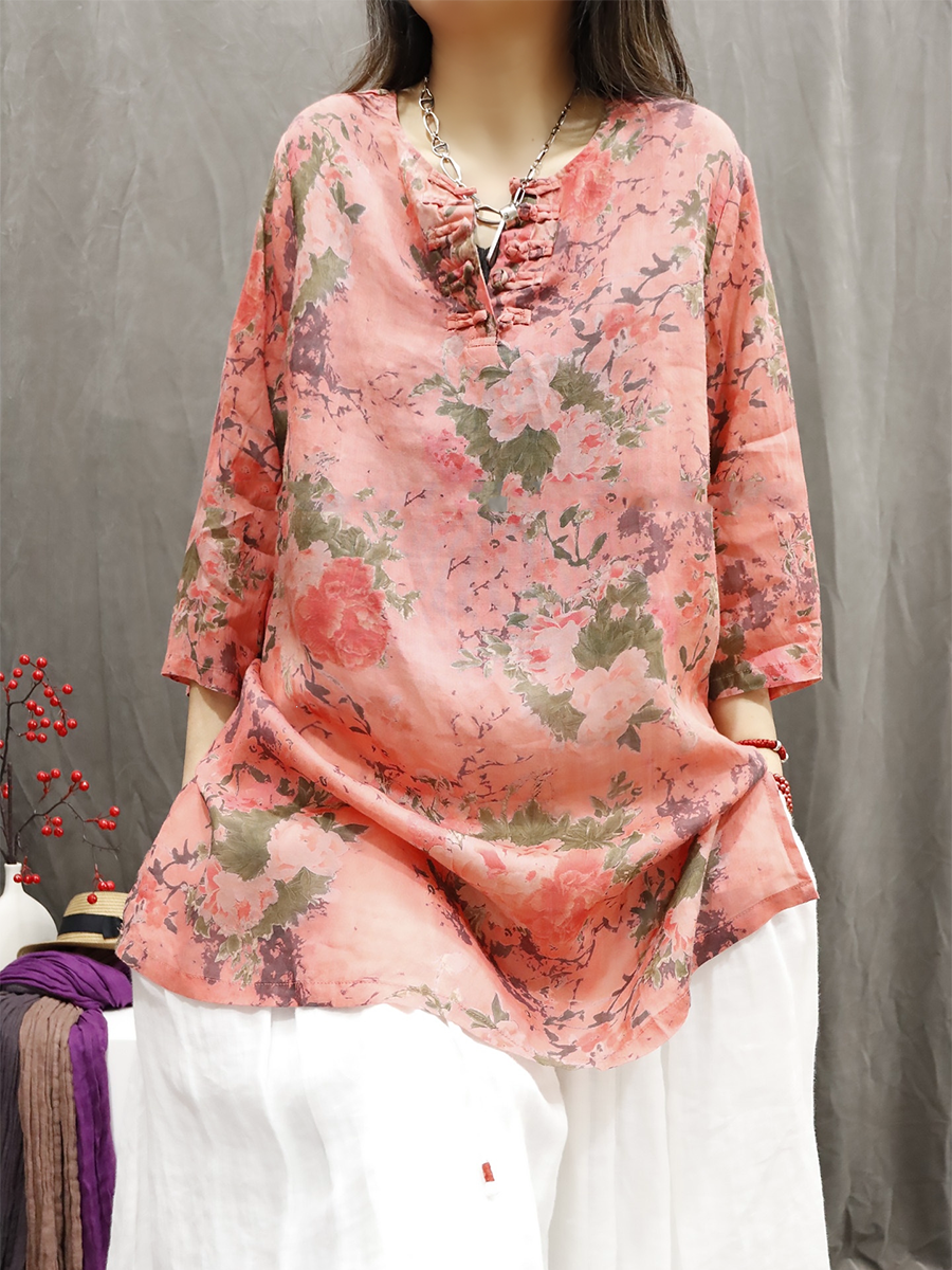 レディース サマー エスニックフラワー Oネック 100%ラミーシャツ
