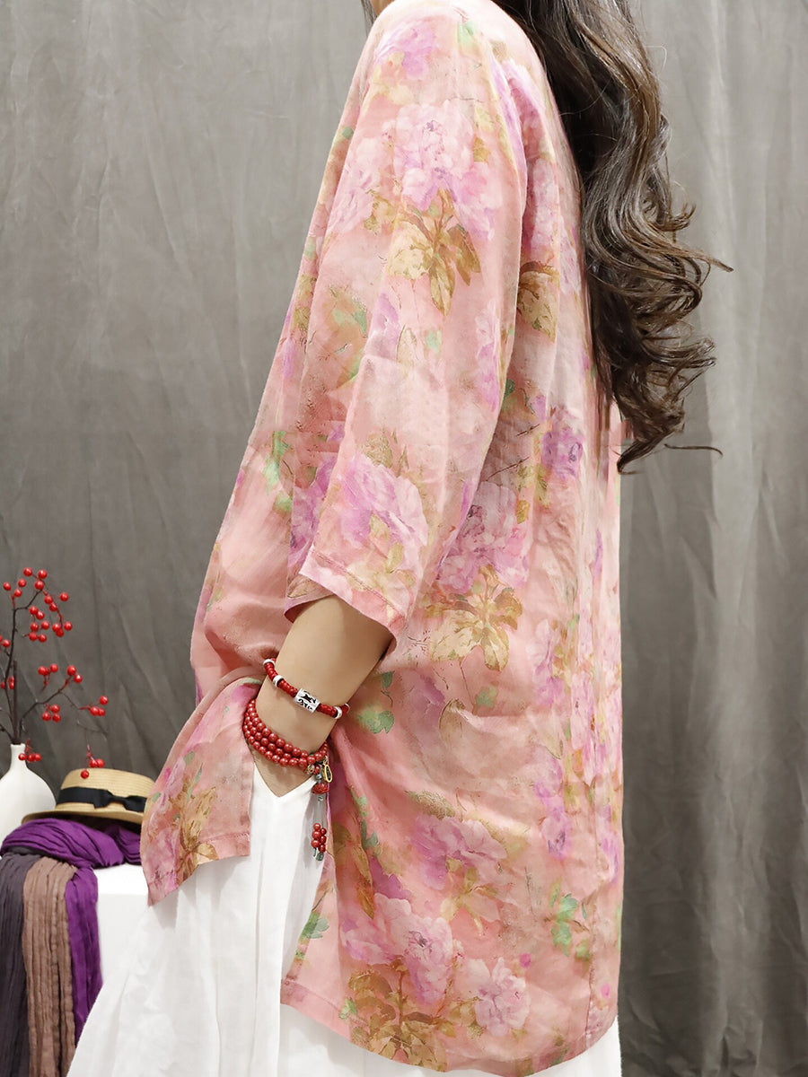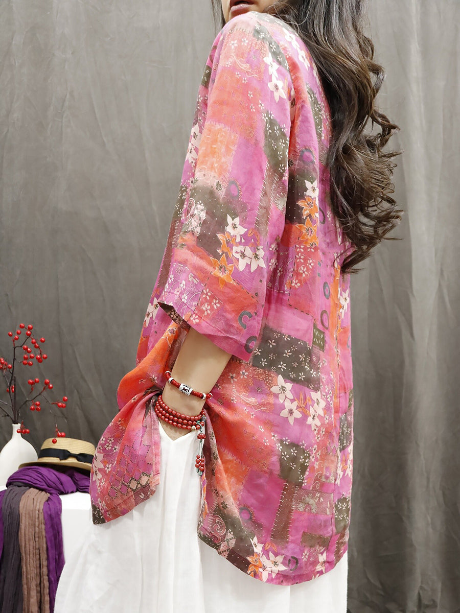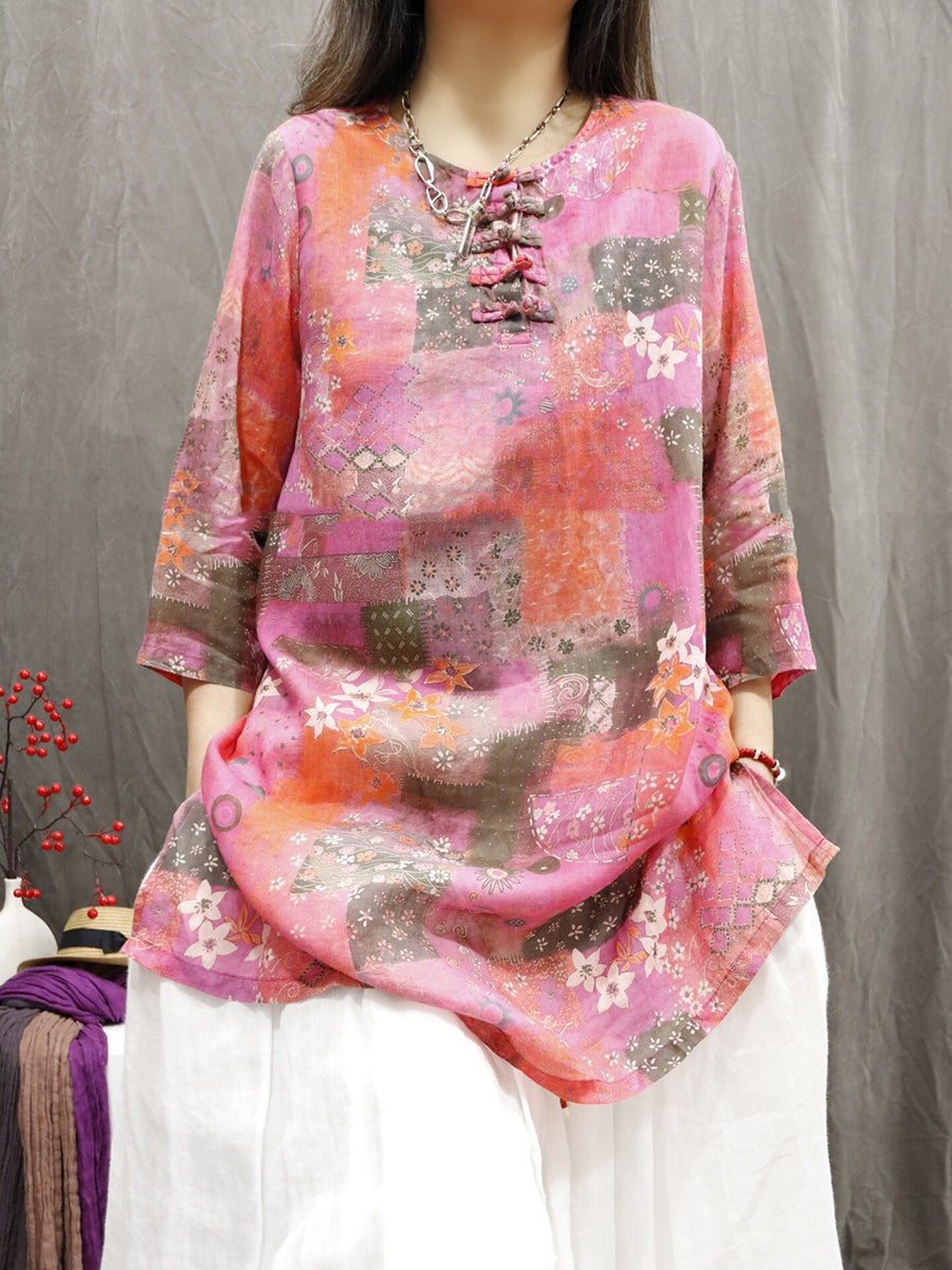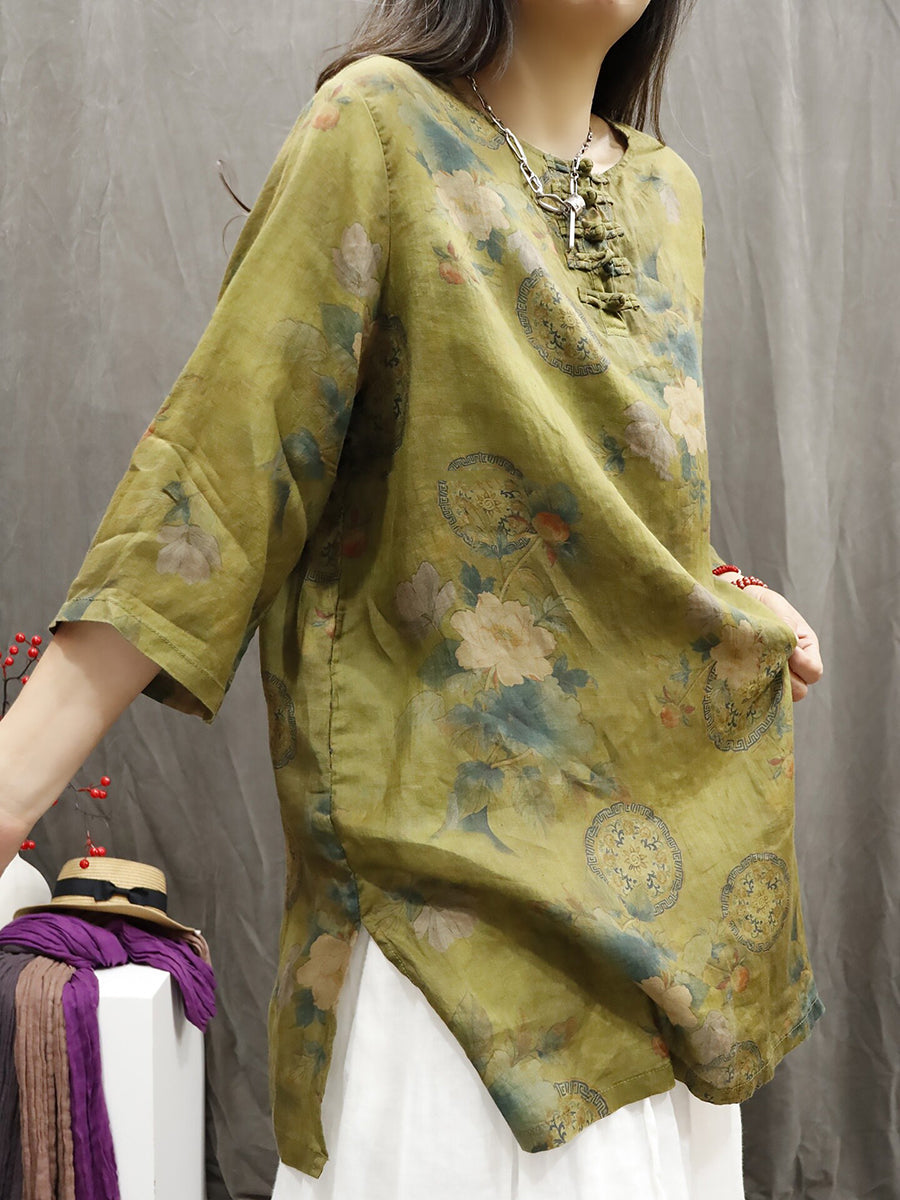 レディース サマー エスニックフラワー Oネック 100%ラミーシャツ