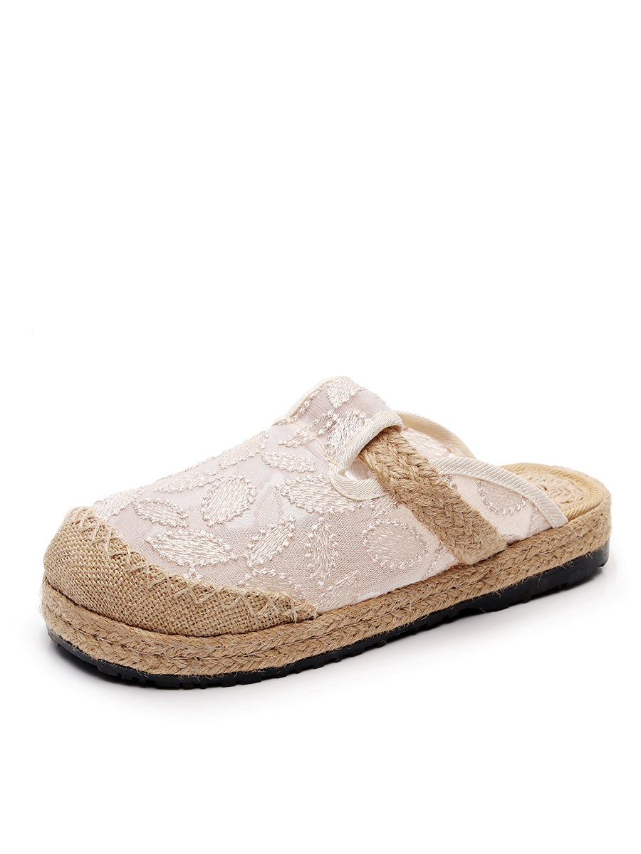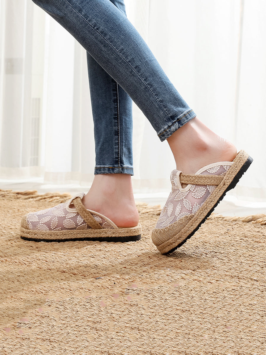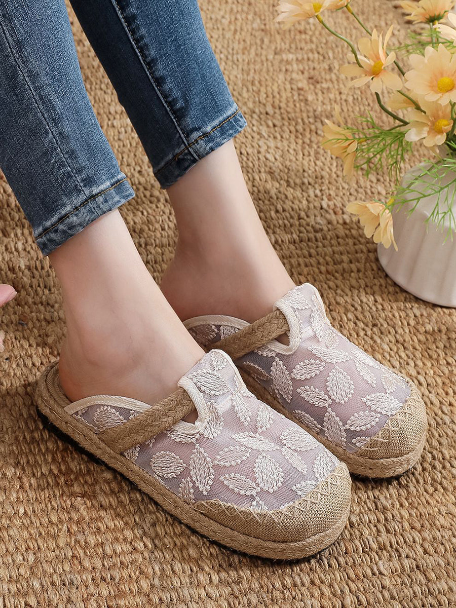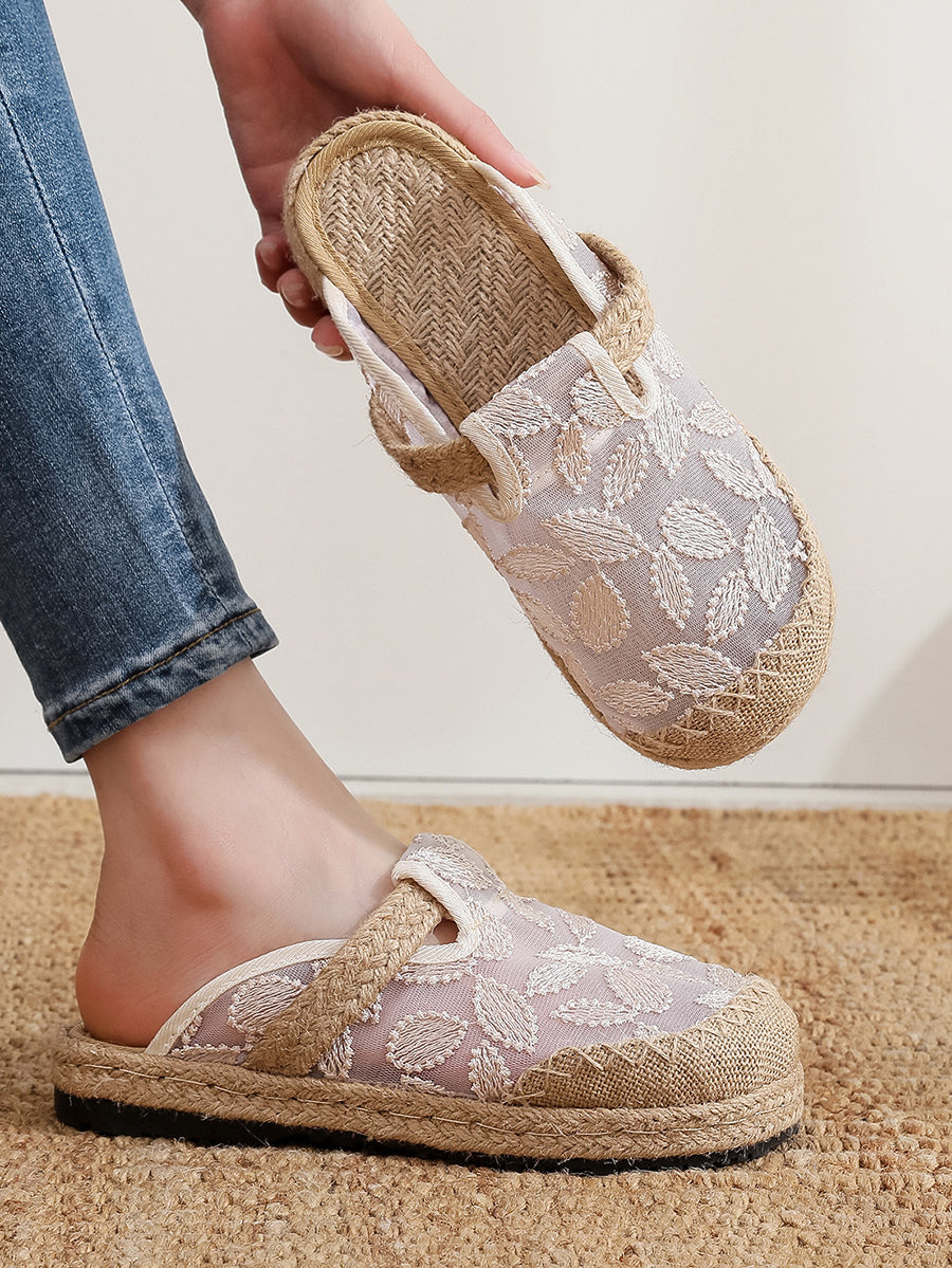 レディース 夏用 エスニック リーフ柄 メッシュ リネン スリッパ