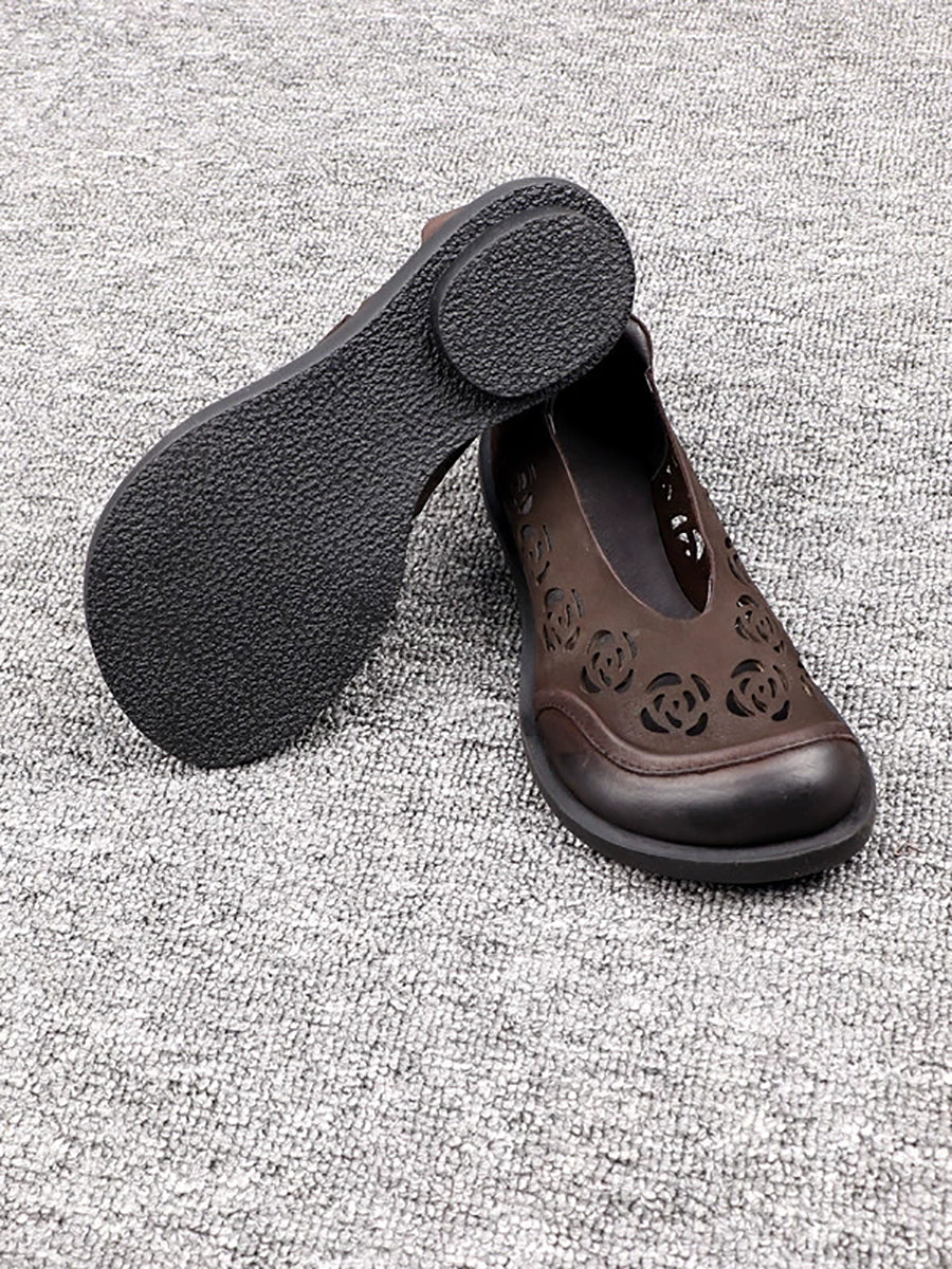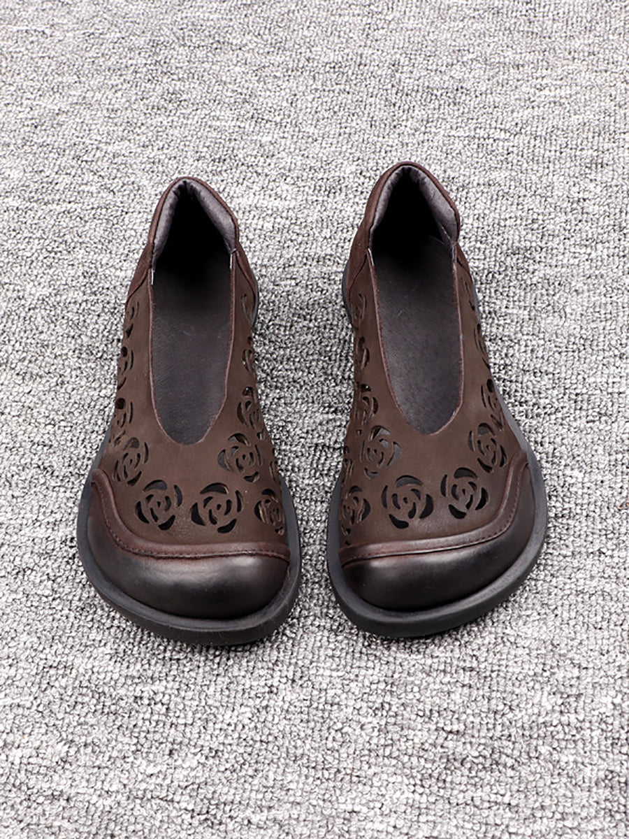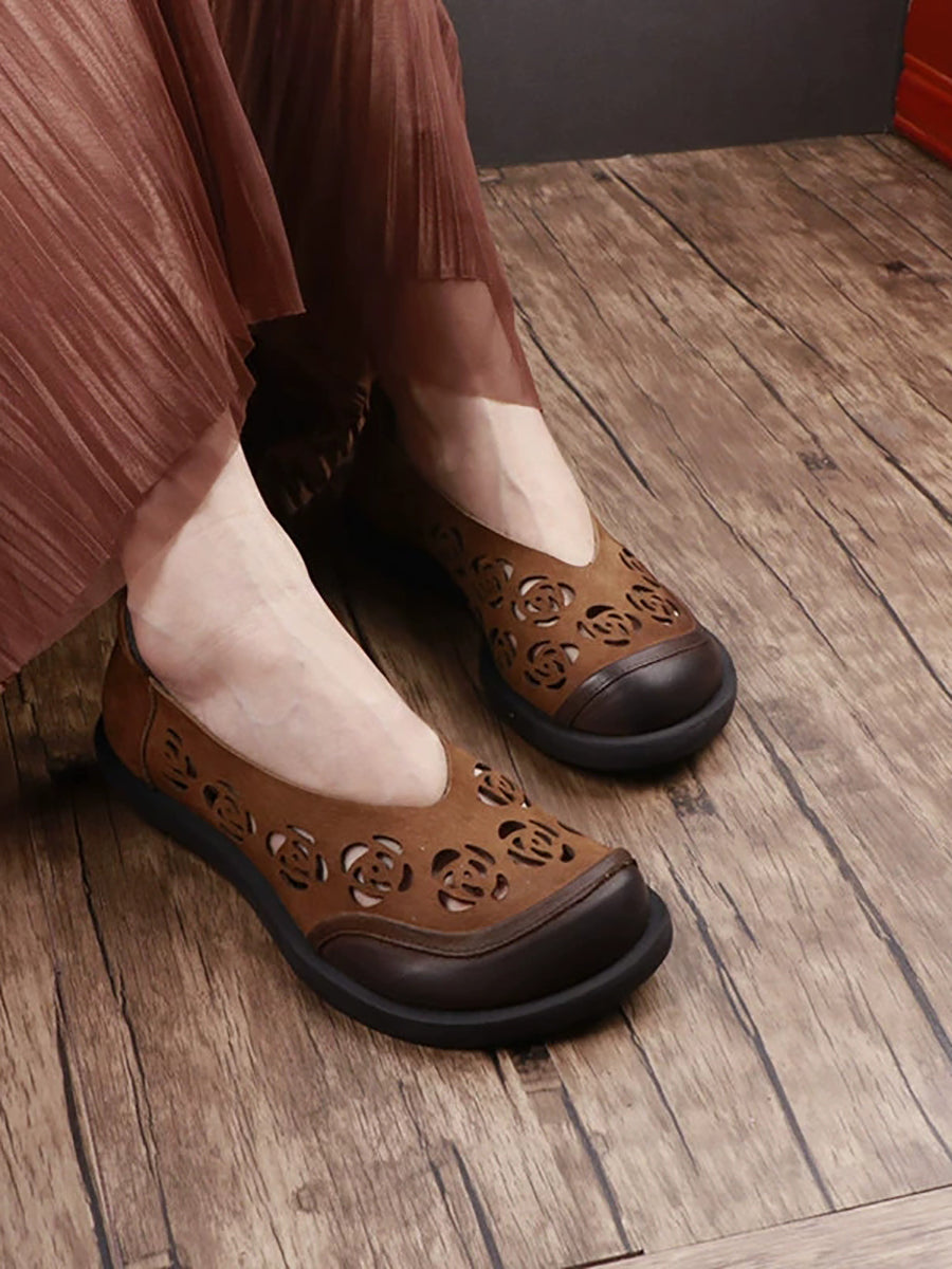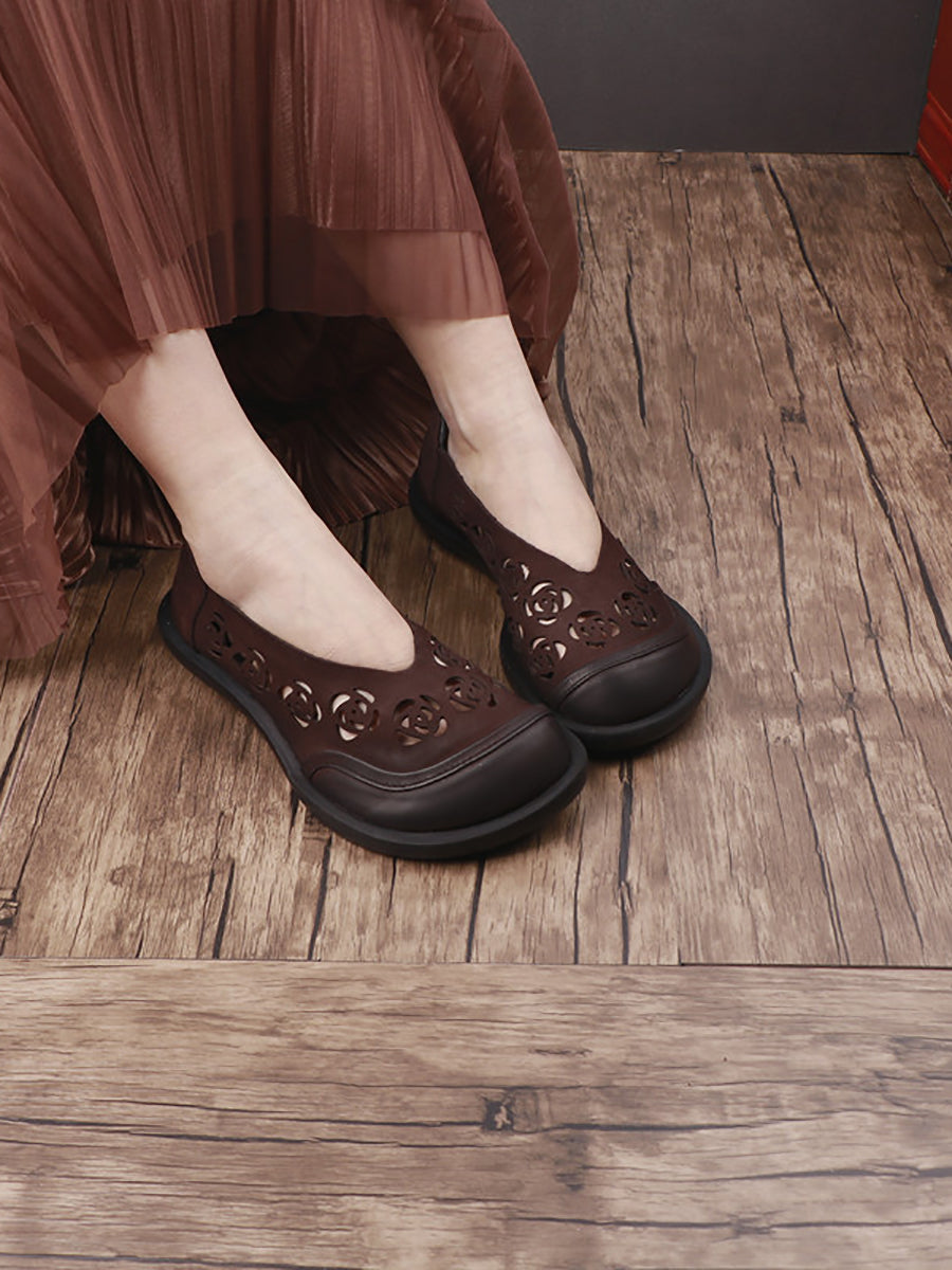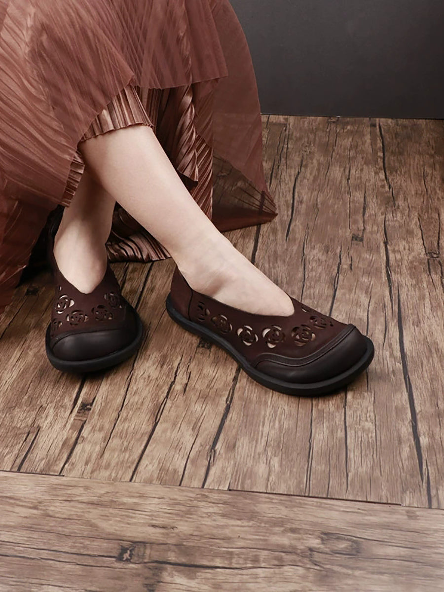 レディース 夏用 本革 くり抜きフラットシューズ