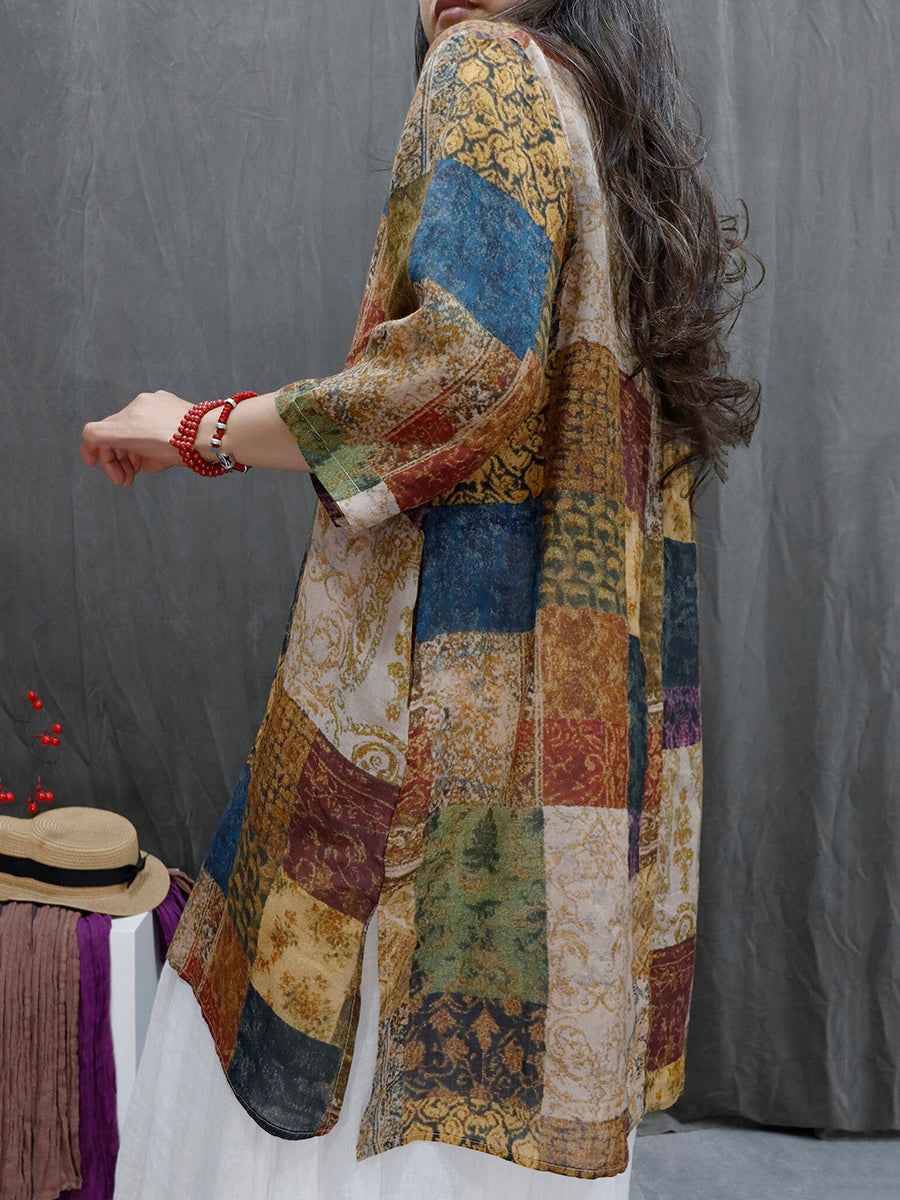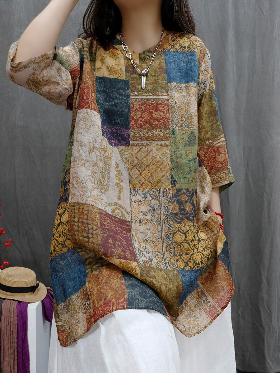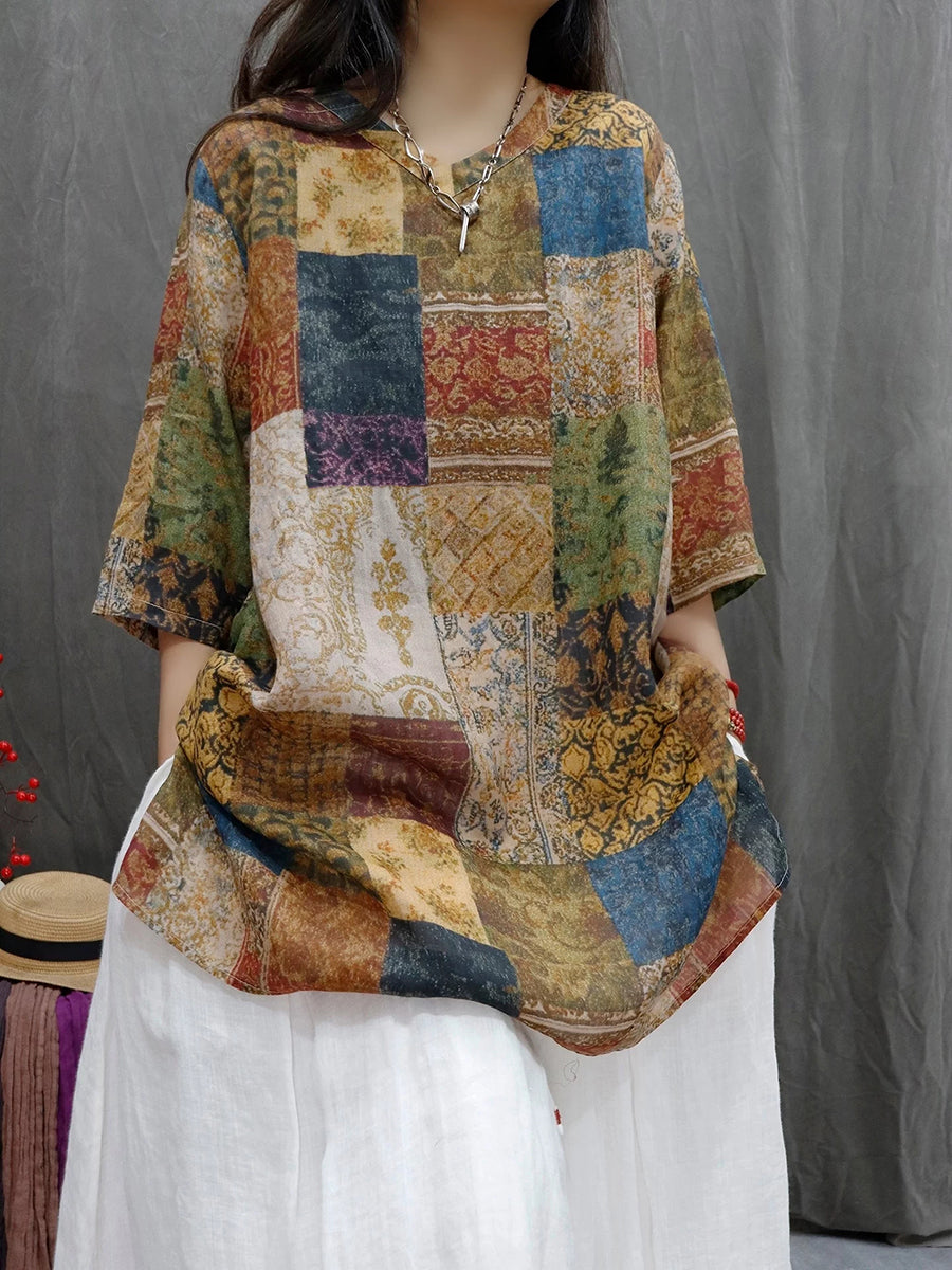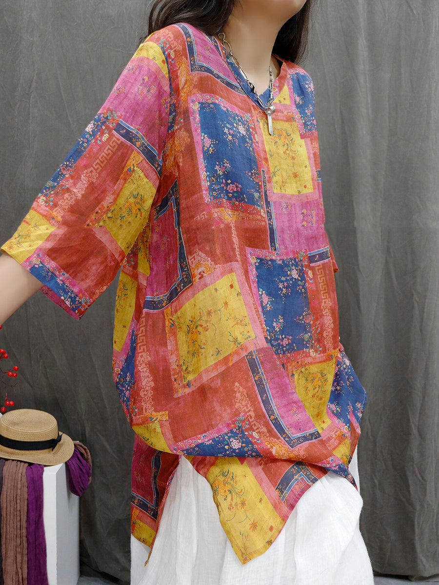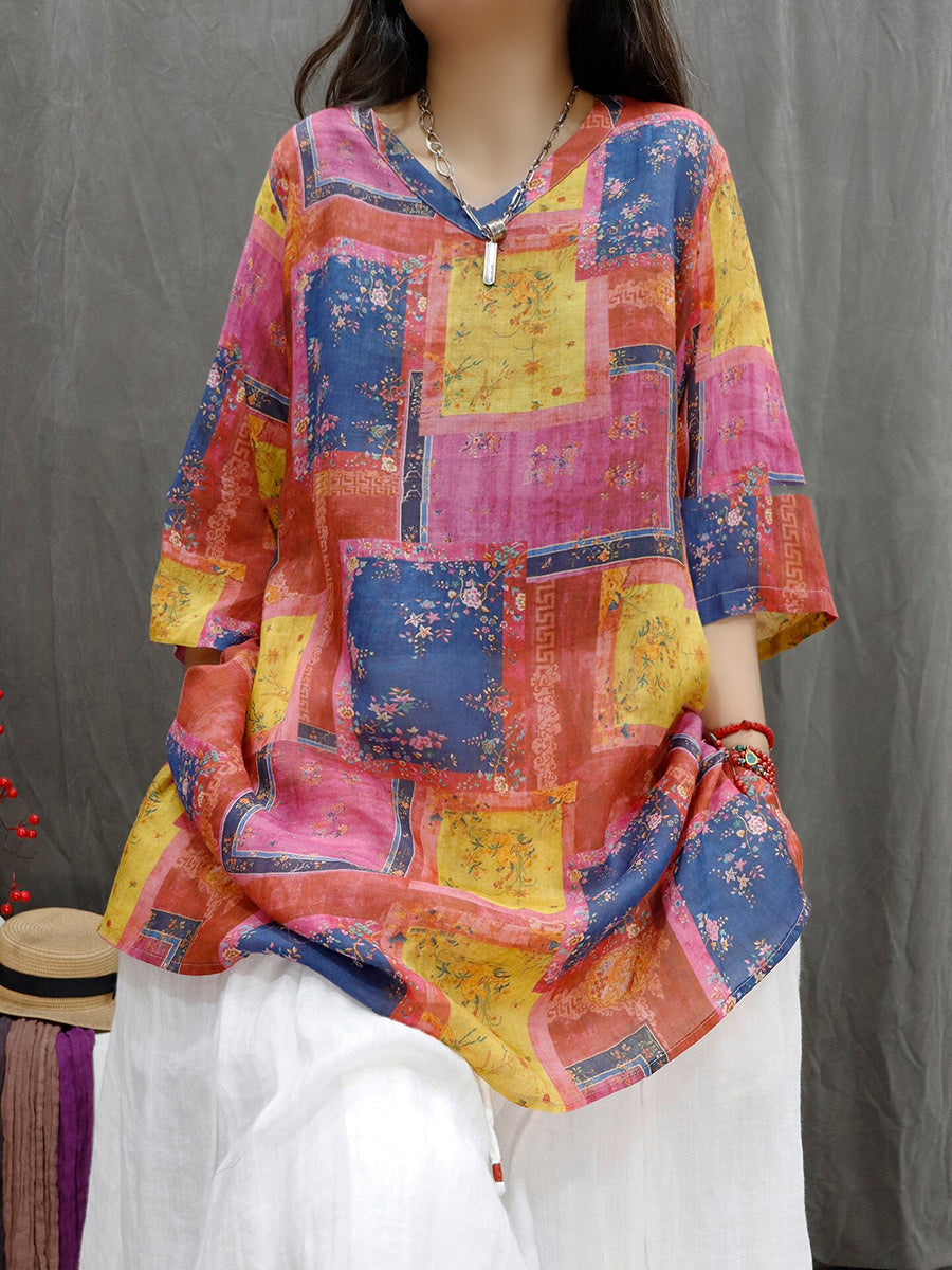 レディース サマー パッチワーク Vネック 100%ラミー ブラウス
