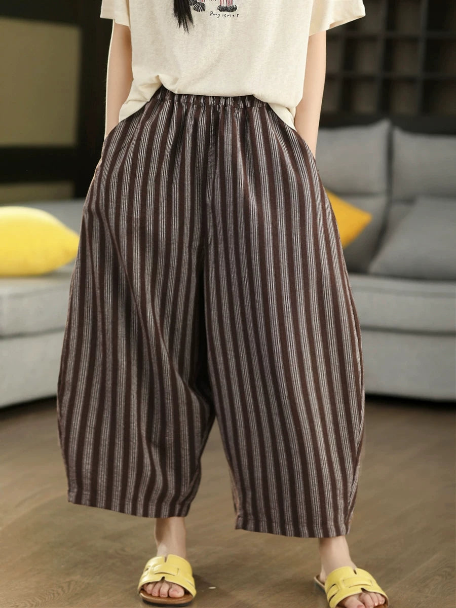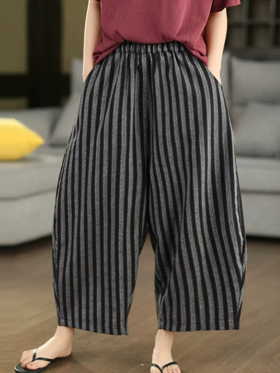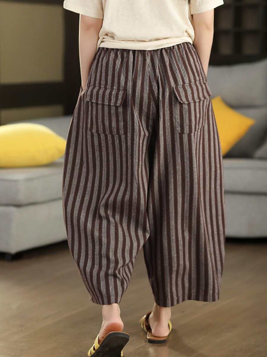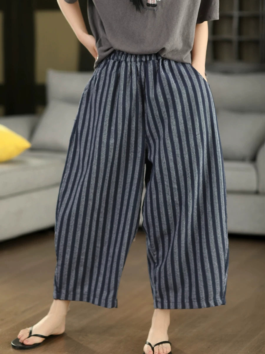 レディース 夏用 レトロストライプ 100%リネン ハーレムパンツ