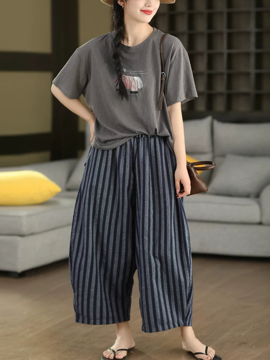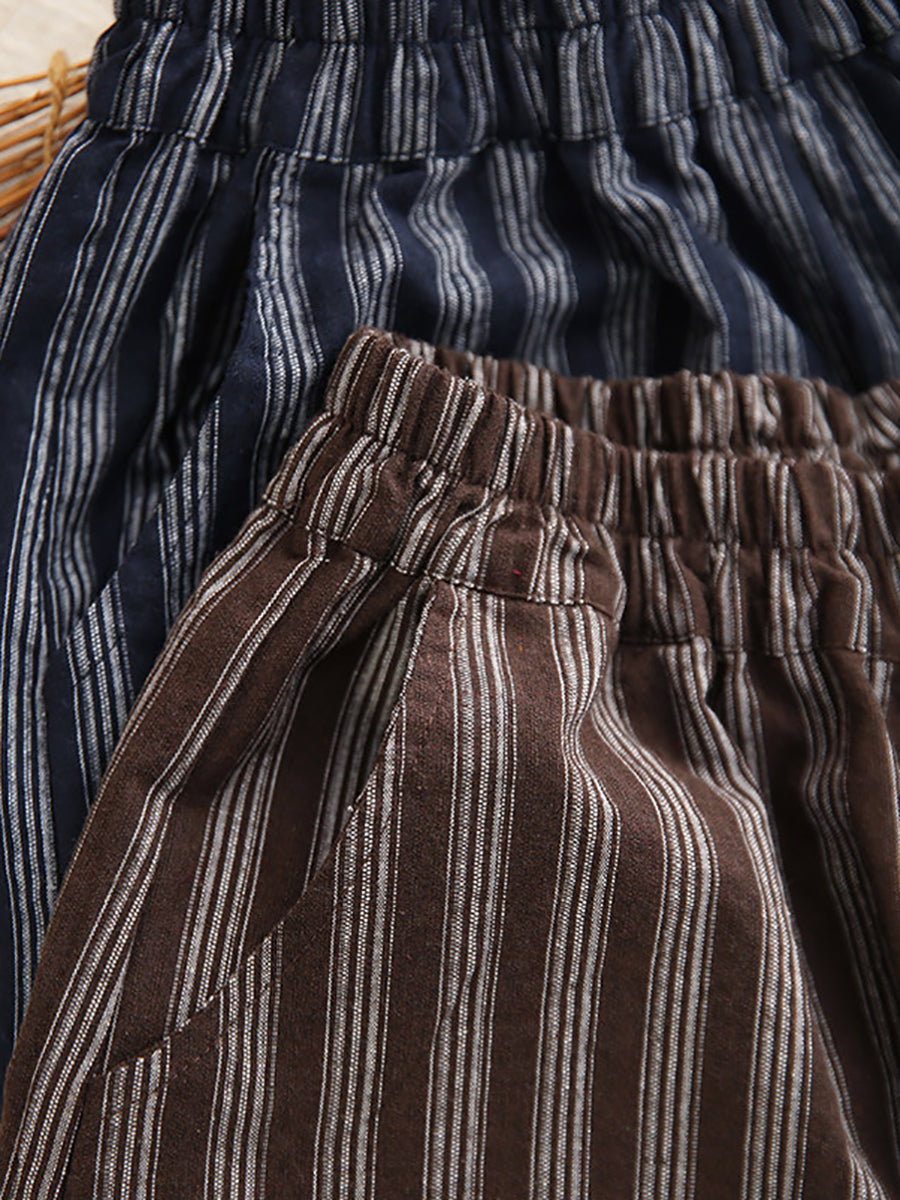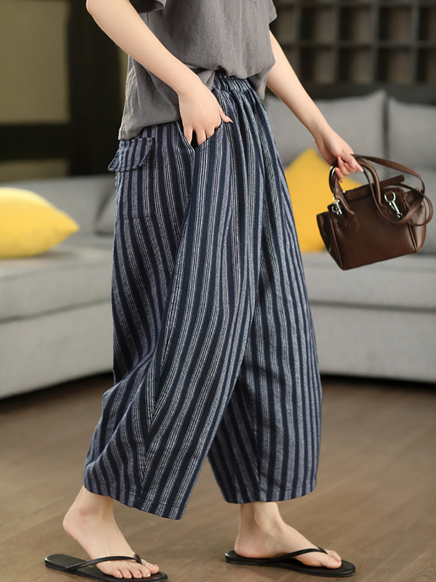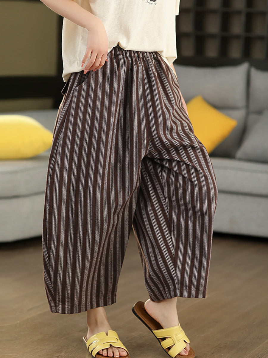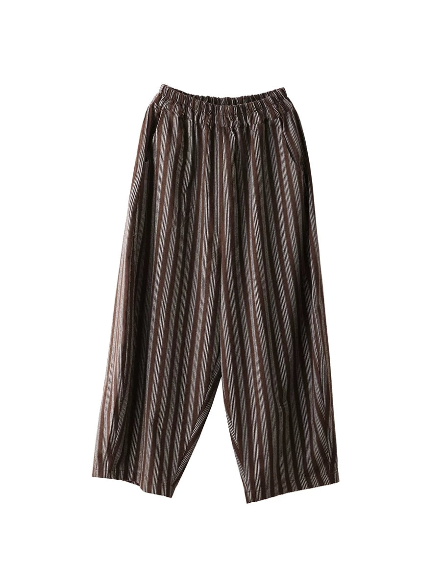 レディース 夏用 レトロストライプ 100%リネン ハーレムパンツ