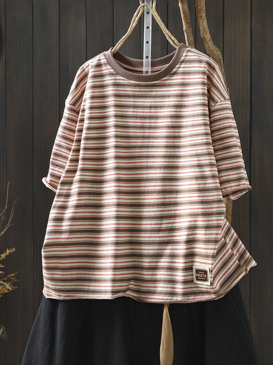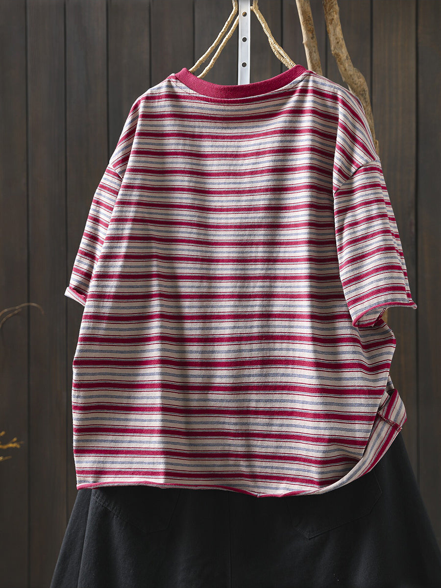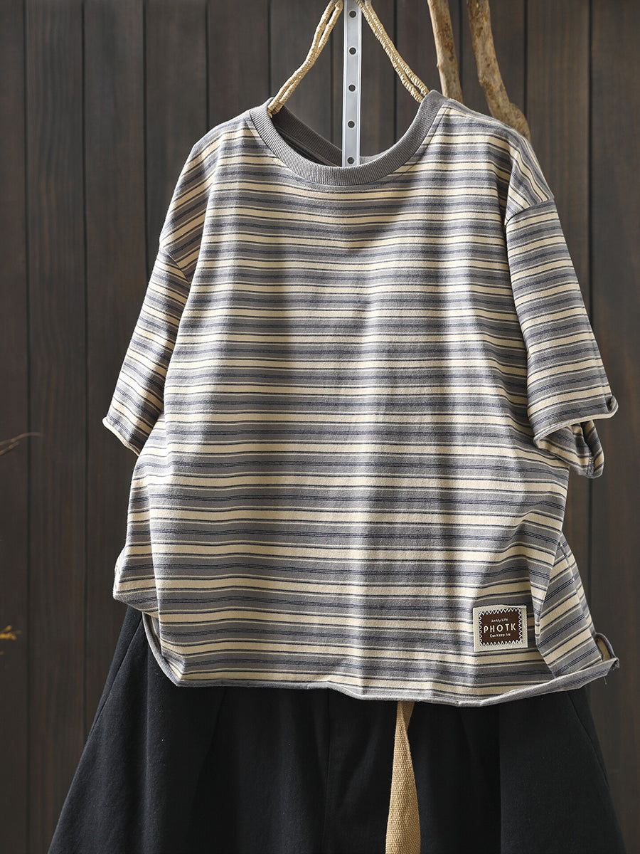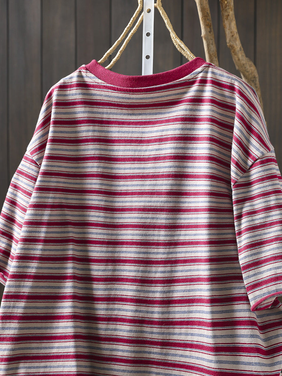 レディース サマー ストライプ Oネック 100%コットンシャツ