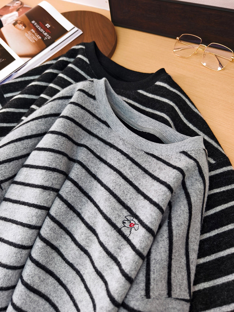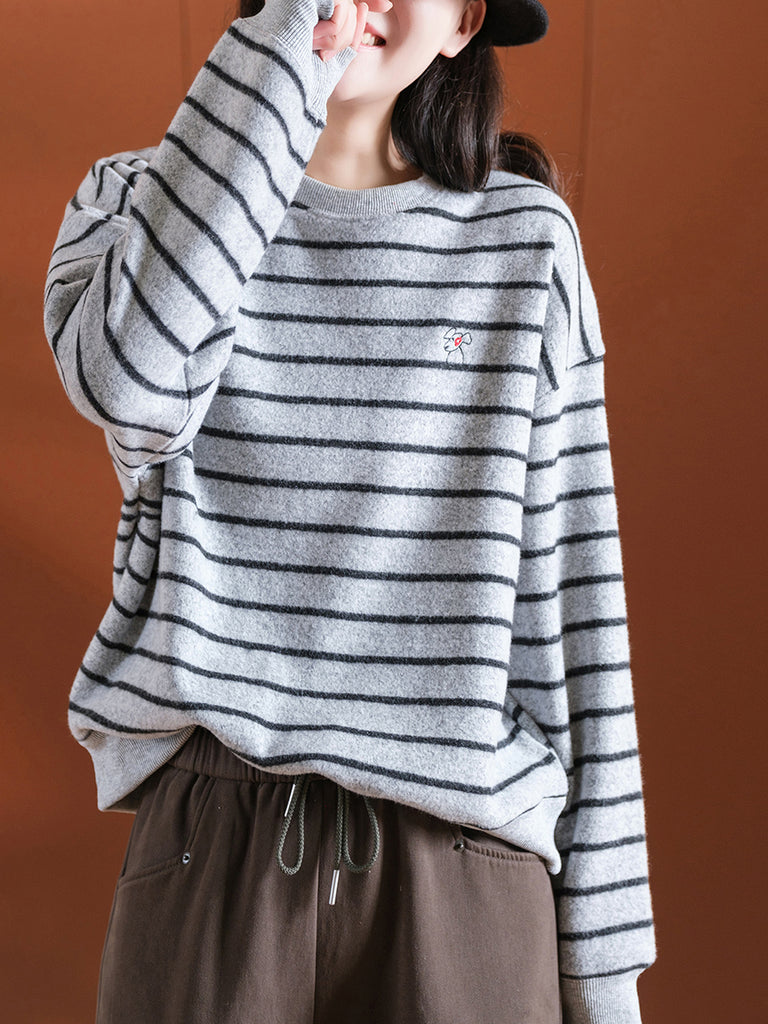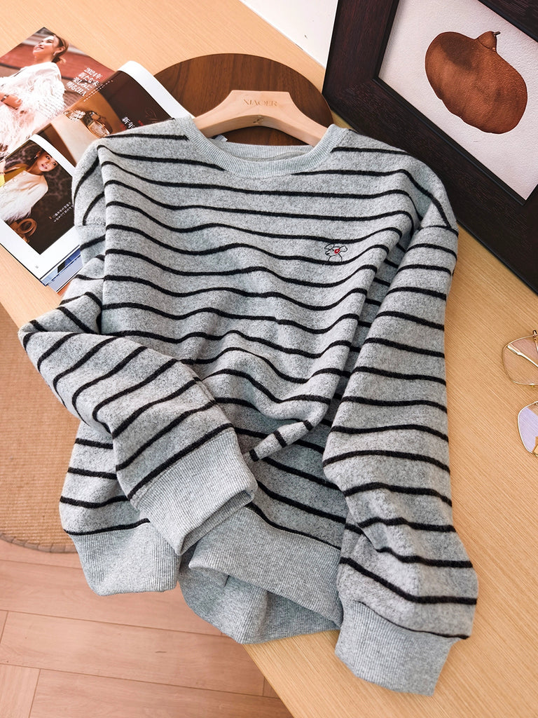 レディース ヴィンテージ 秋 ストライプ フリース裏地 Oネック ブラウス