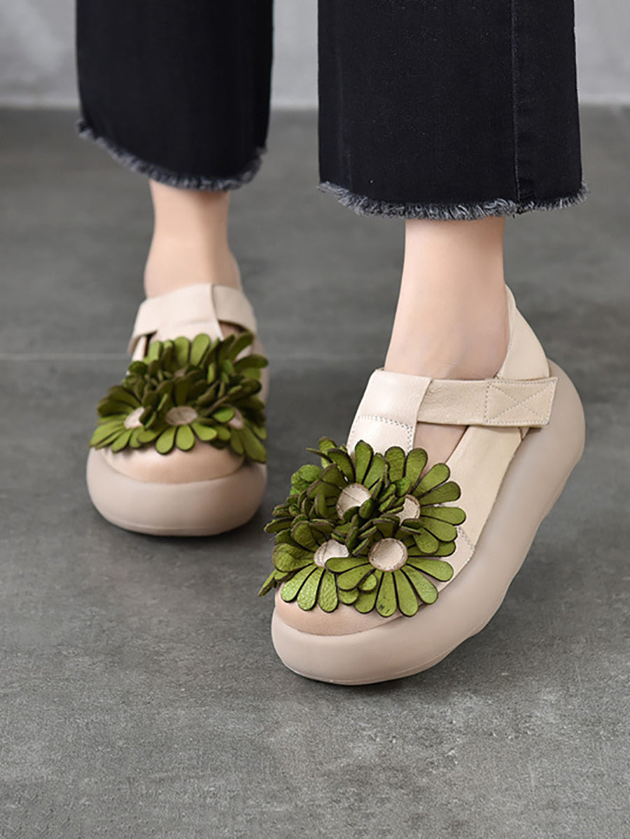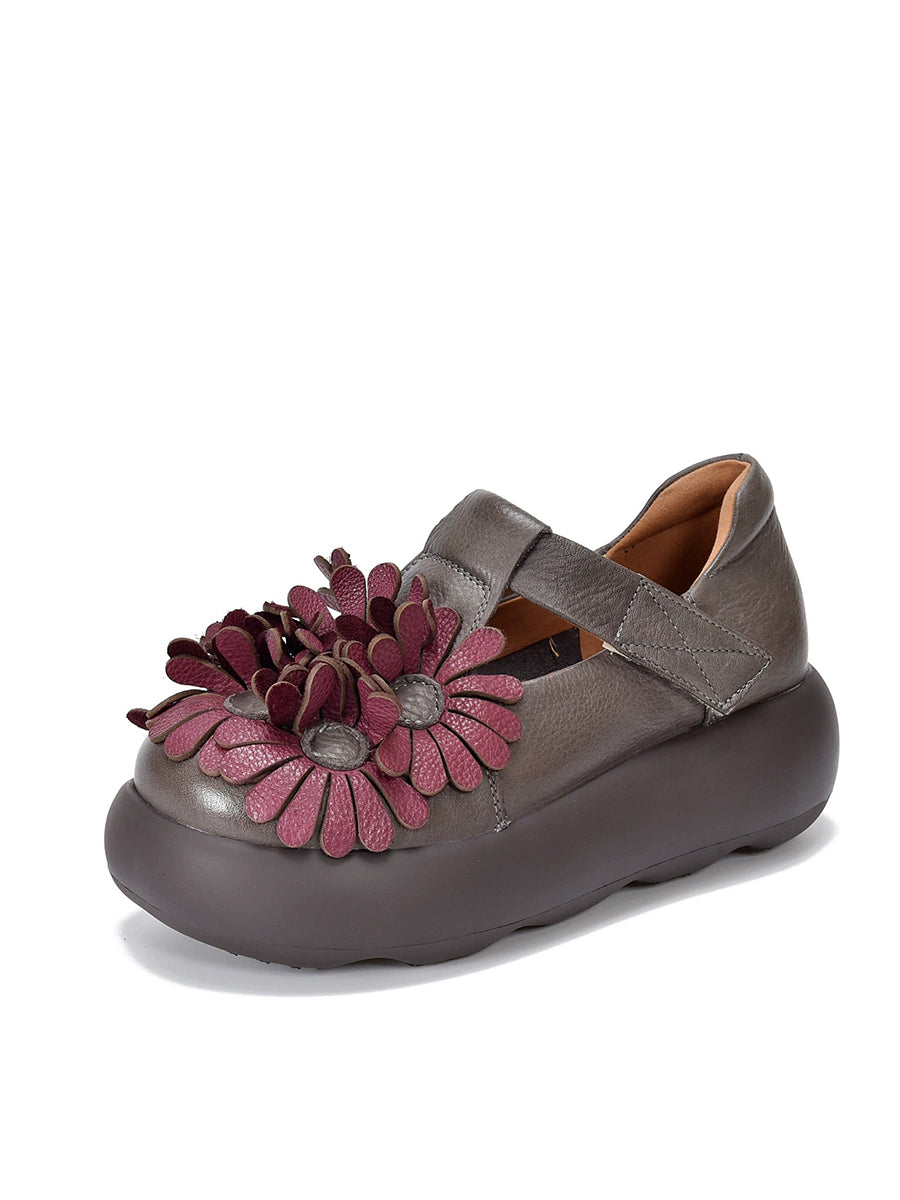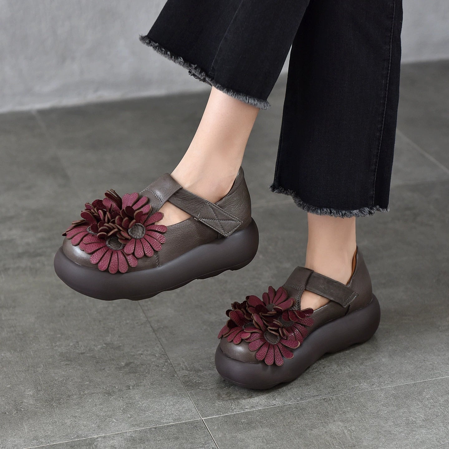 レディース ヴィンテージ 本革 フラワー プラットフォーム シューズ