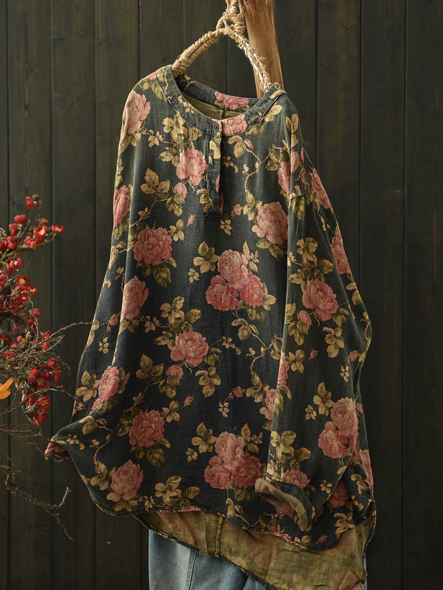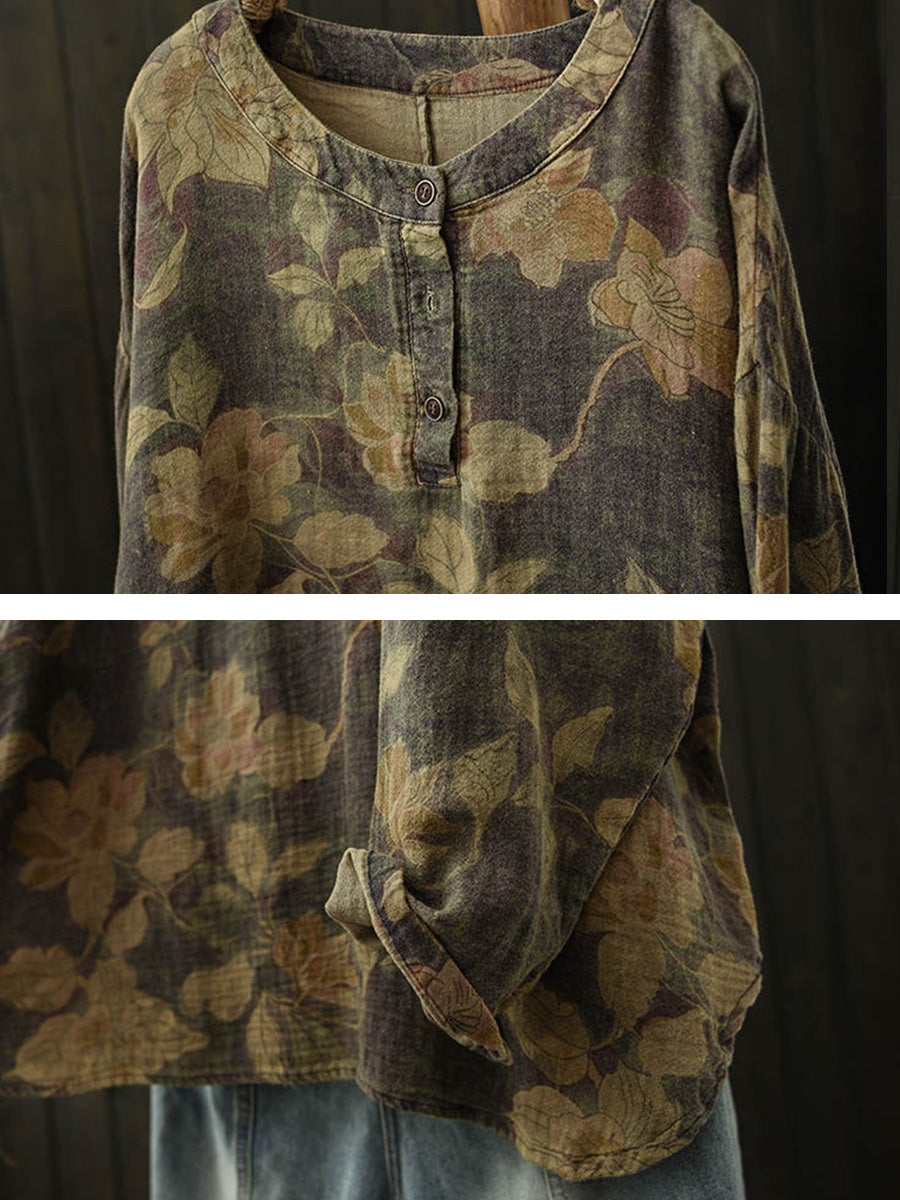 レディース ヴィンテージ スプリングフラワー Oネック コットンブラウス