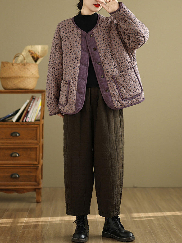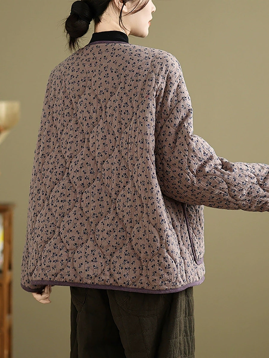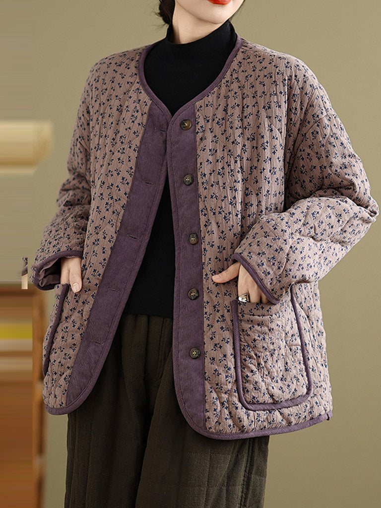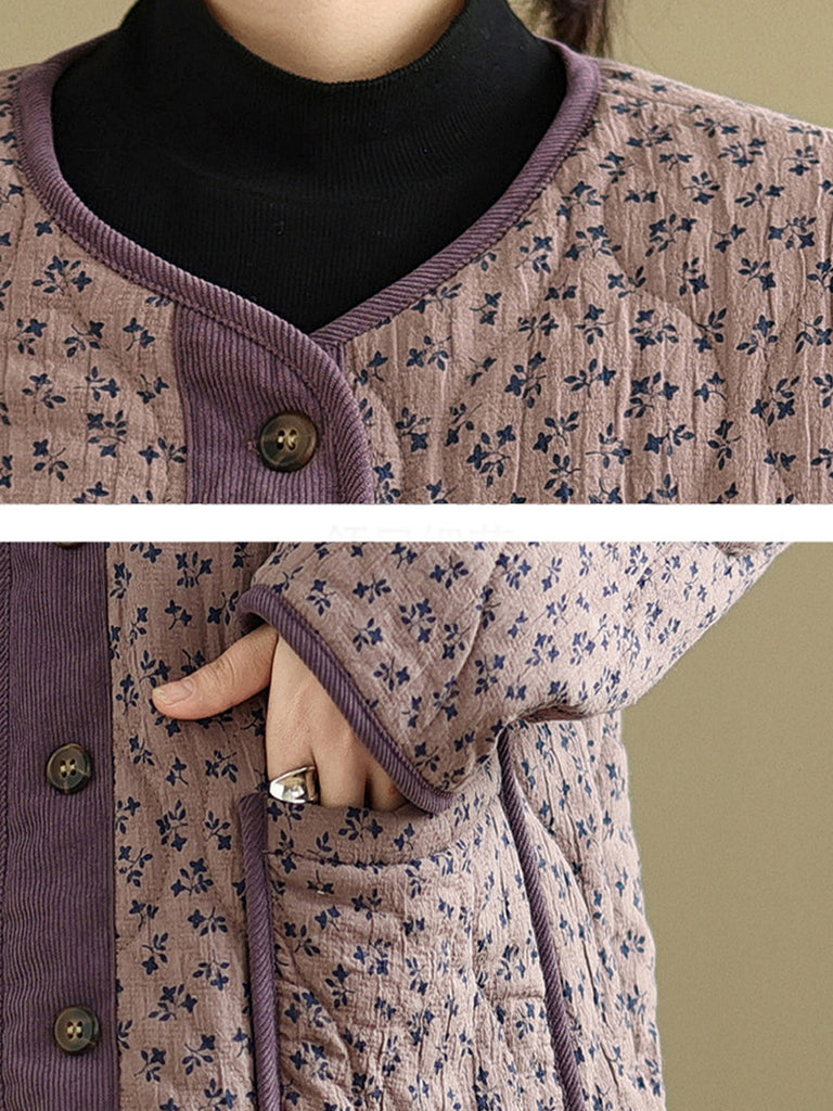 レディース ヴィンテージ 冬 花柄 Oネック パッド入りコート