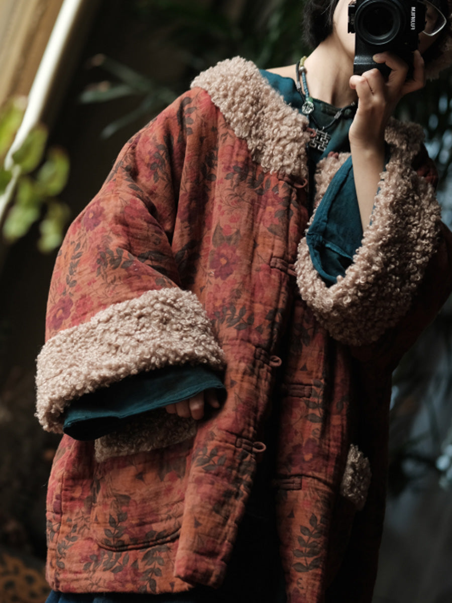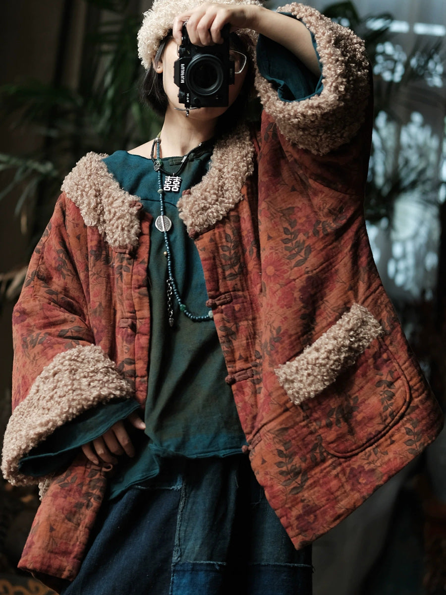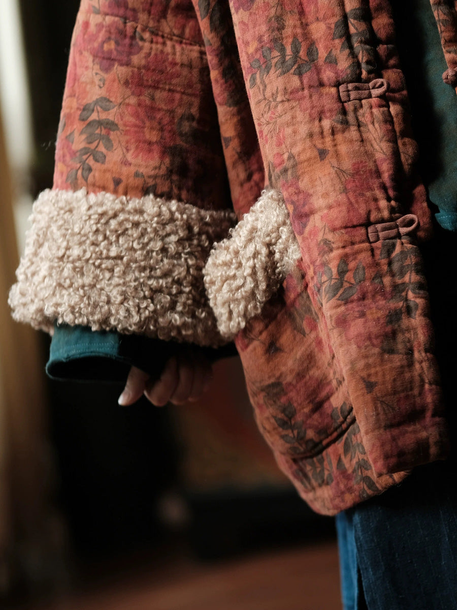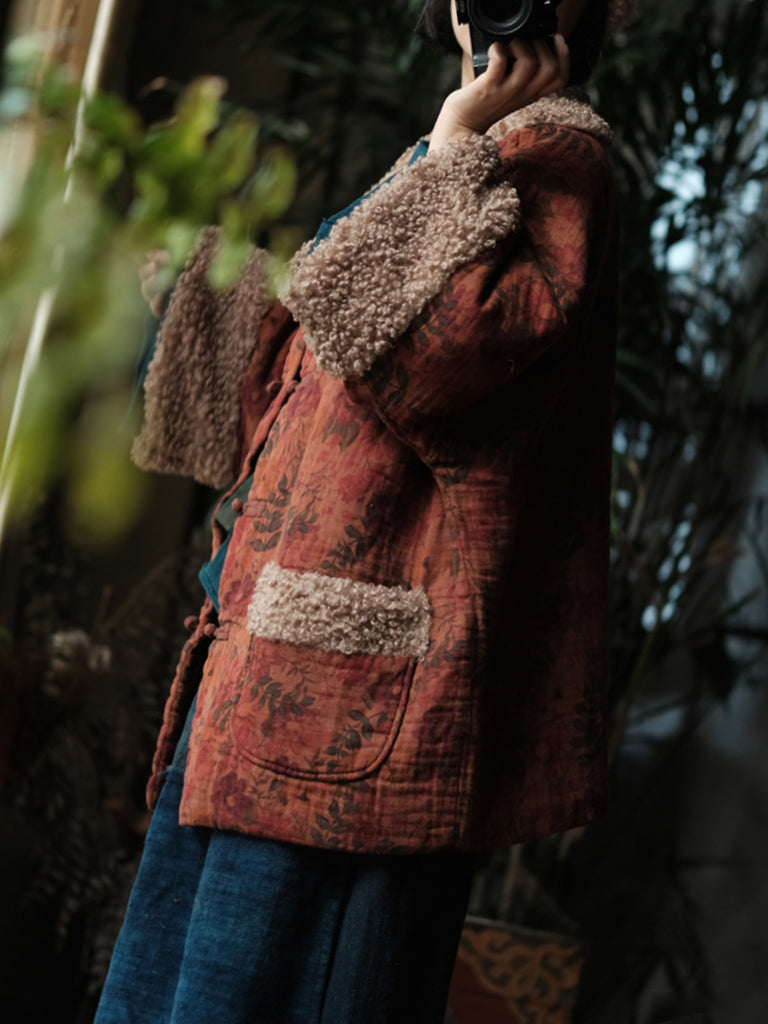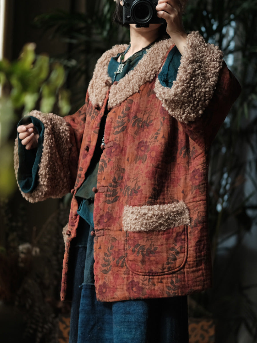 レディース ヴィンテージ ウィンター フラワー フリース スプライス コットン Oネック コート