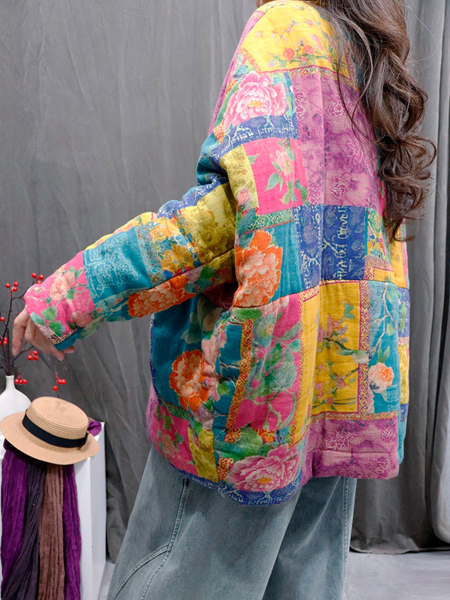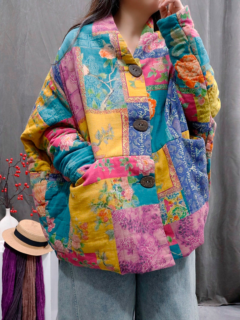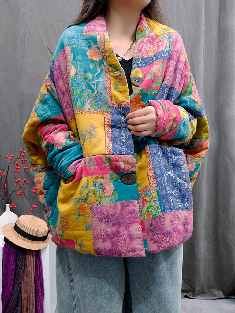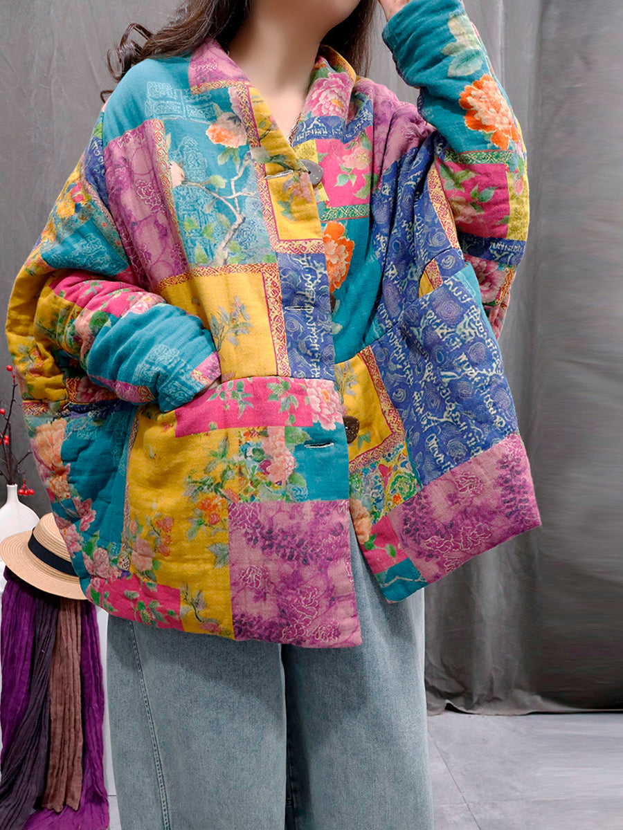 レディース ヴィンテージ ウィンター フラワー パッチワーク Vネック コットンコート