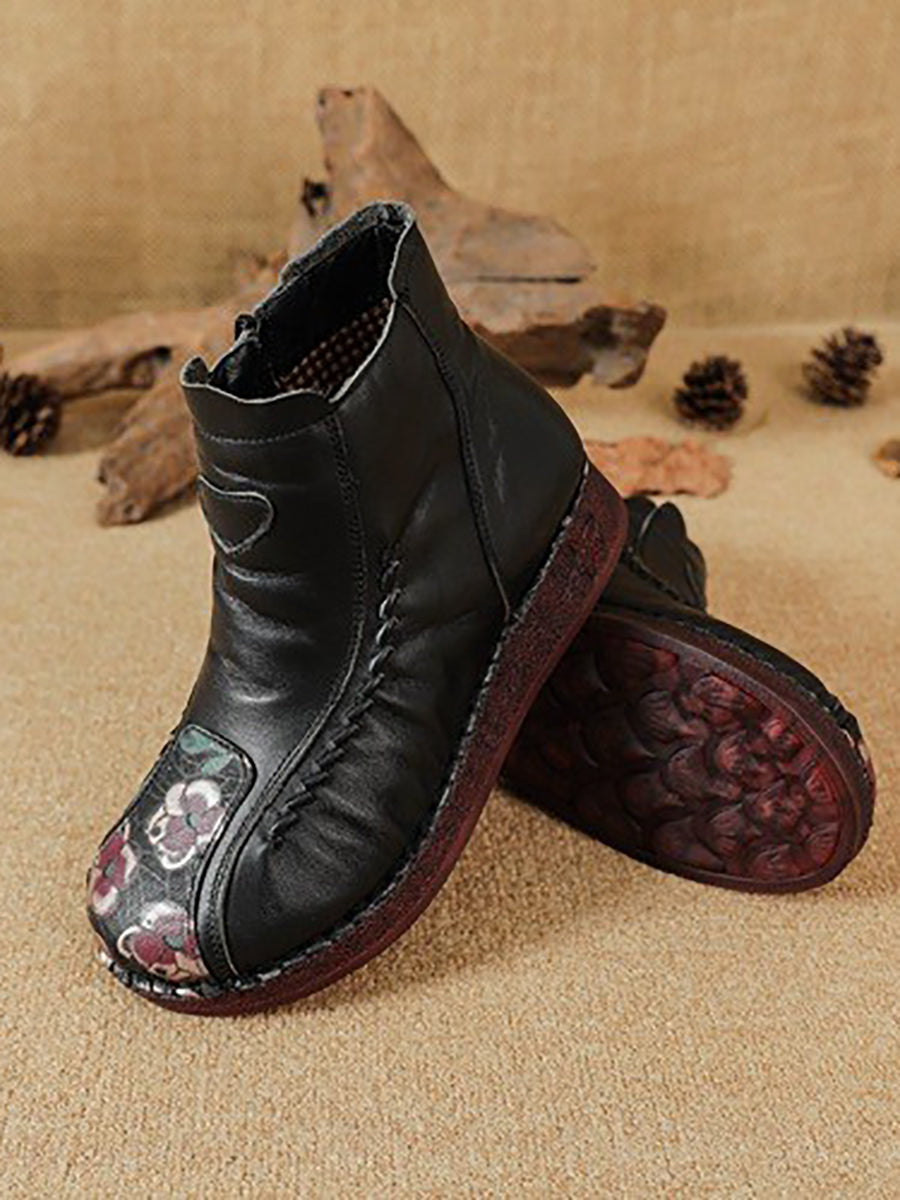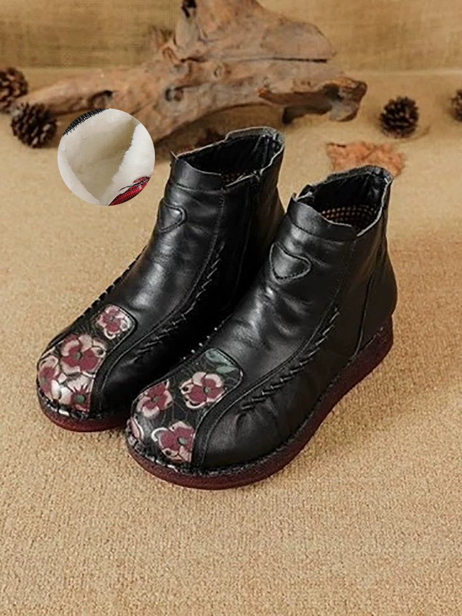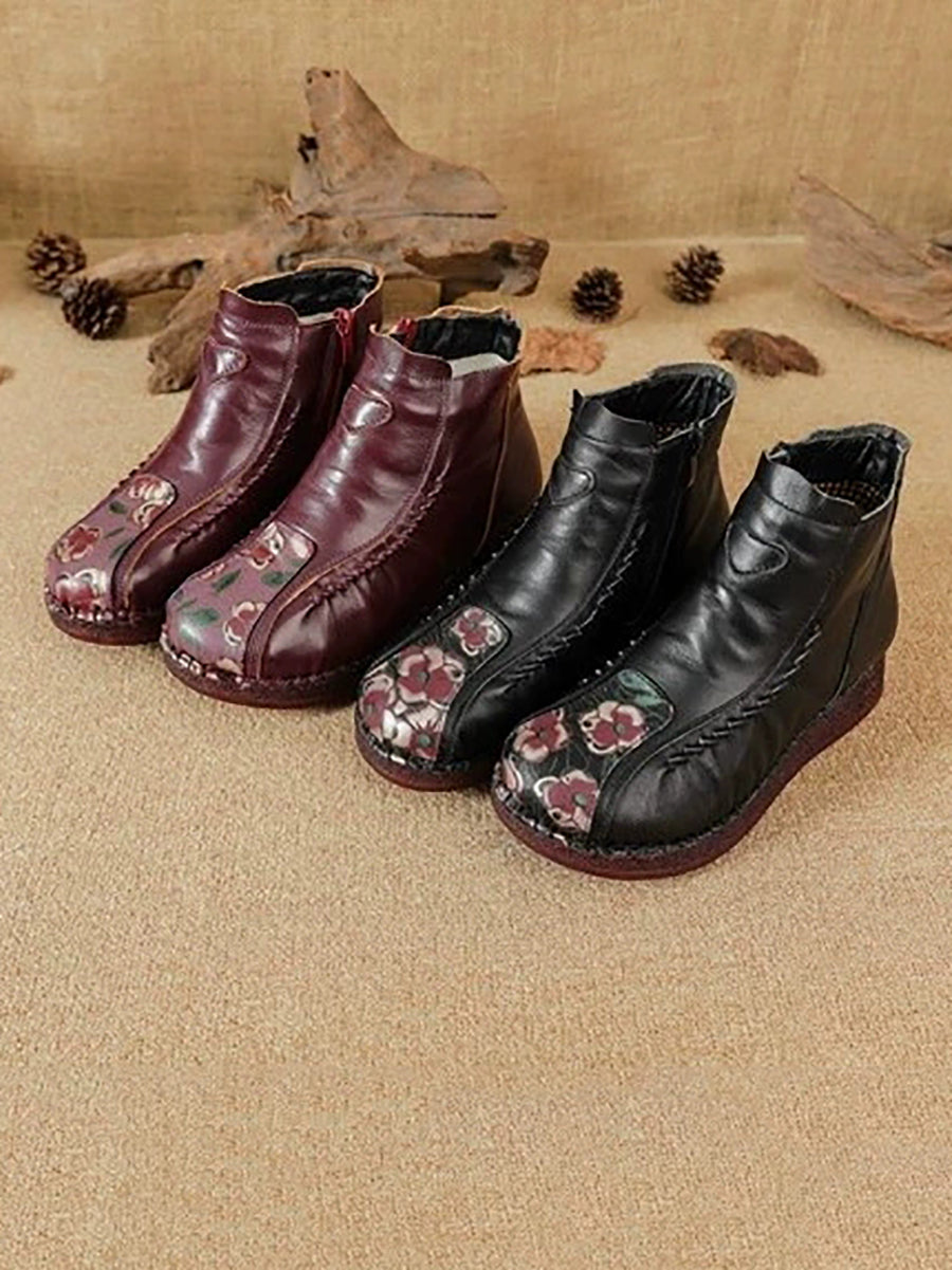 レディース 冬用 アーティスティックフラワーレザー スプライスアンクルブーツ
