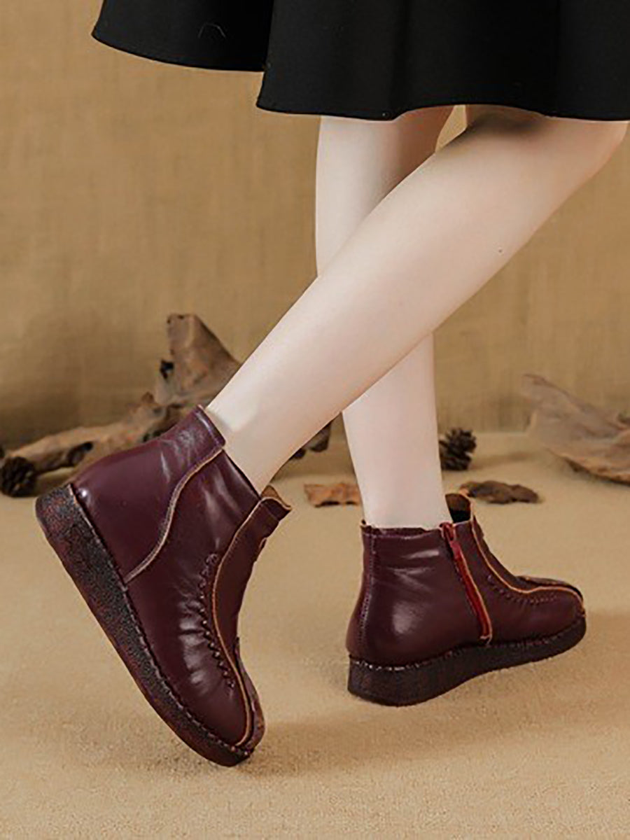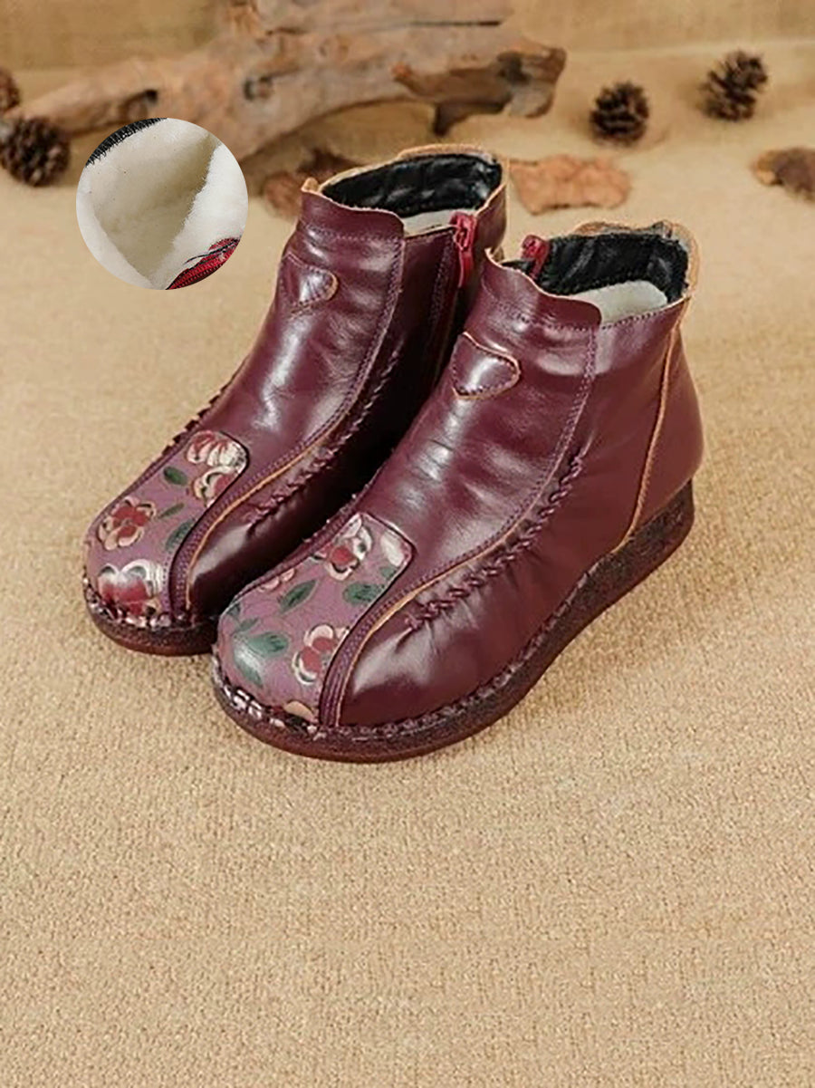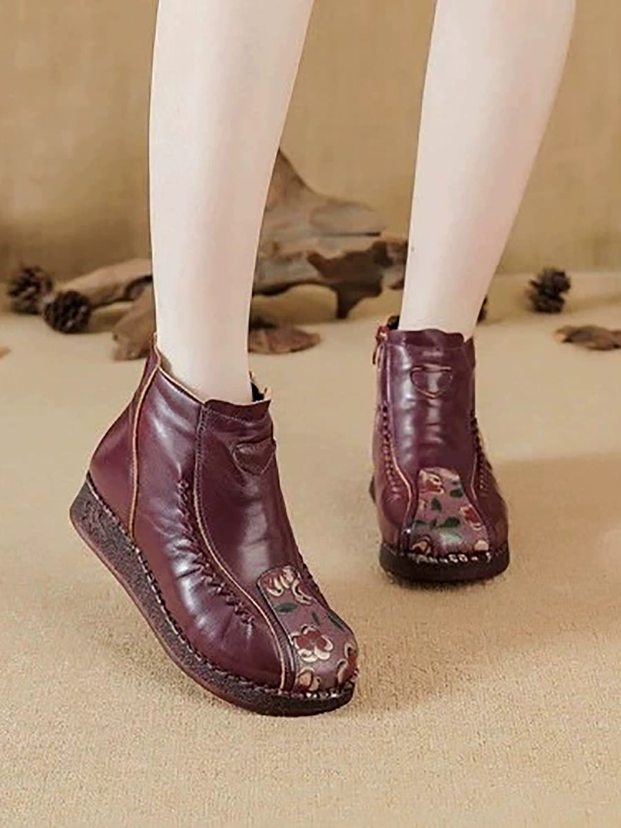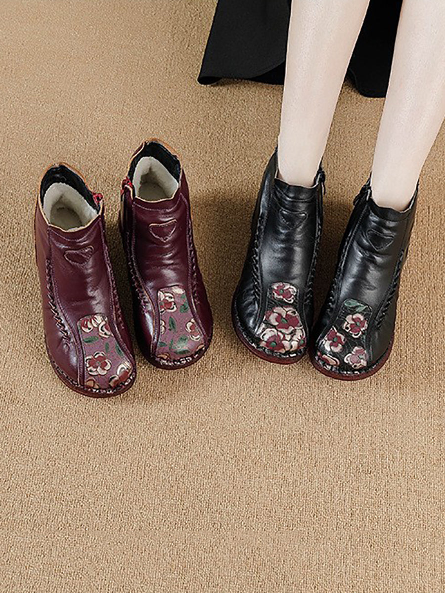 レディース 冬用 アーティスティックフラワーレザー スプライスアンクルブーツ