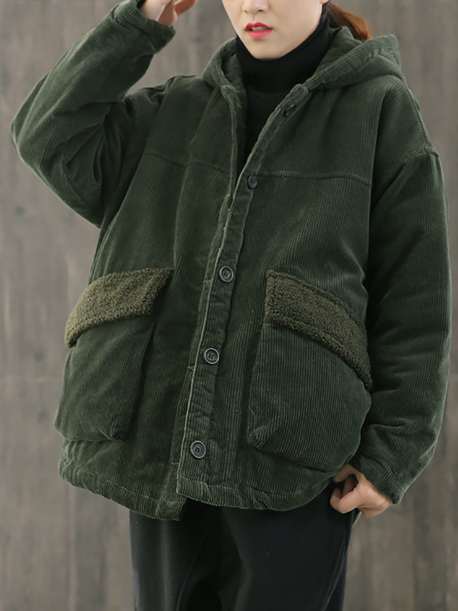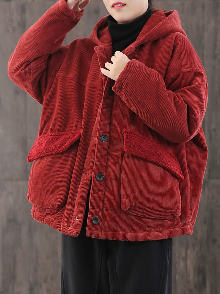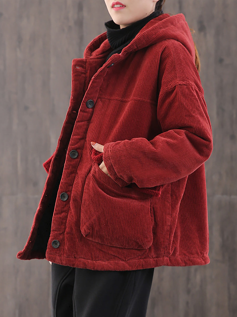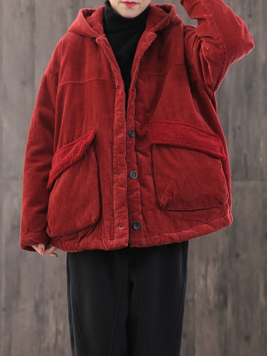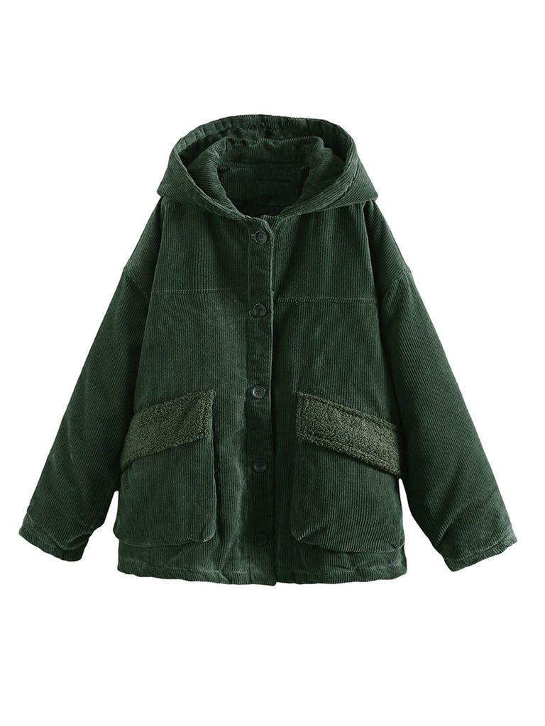レディース 冬 カジュアル ピュアカラー コーデュロイ フード付き パッド入りコート
