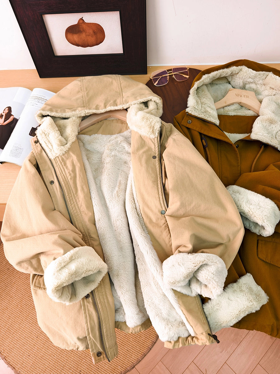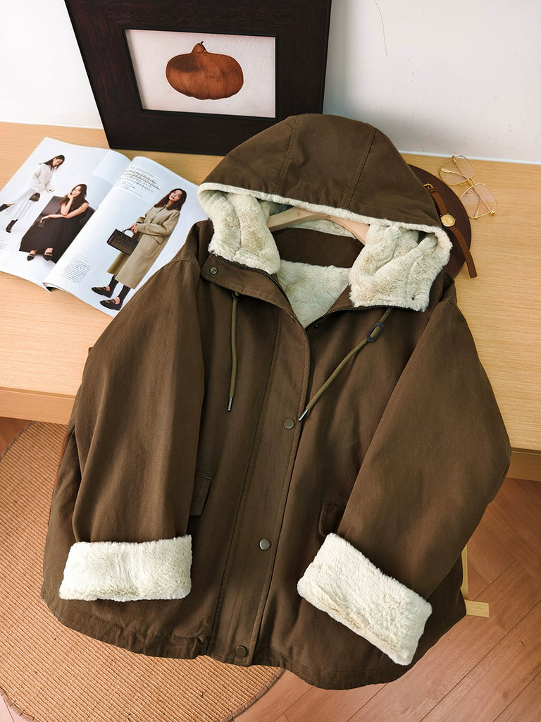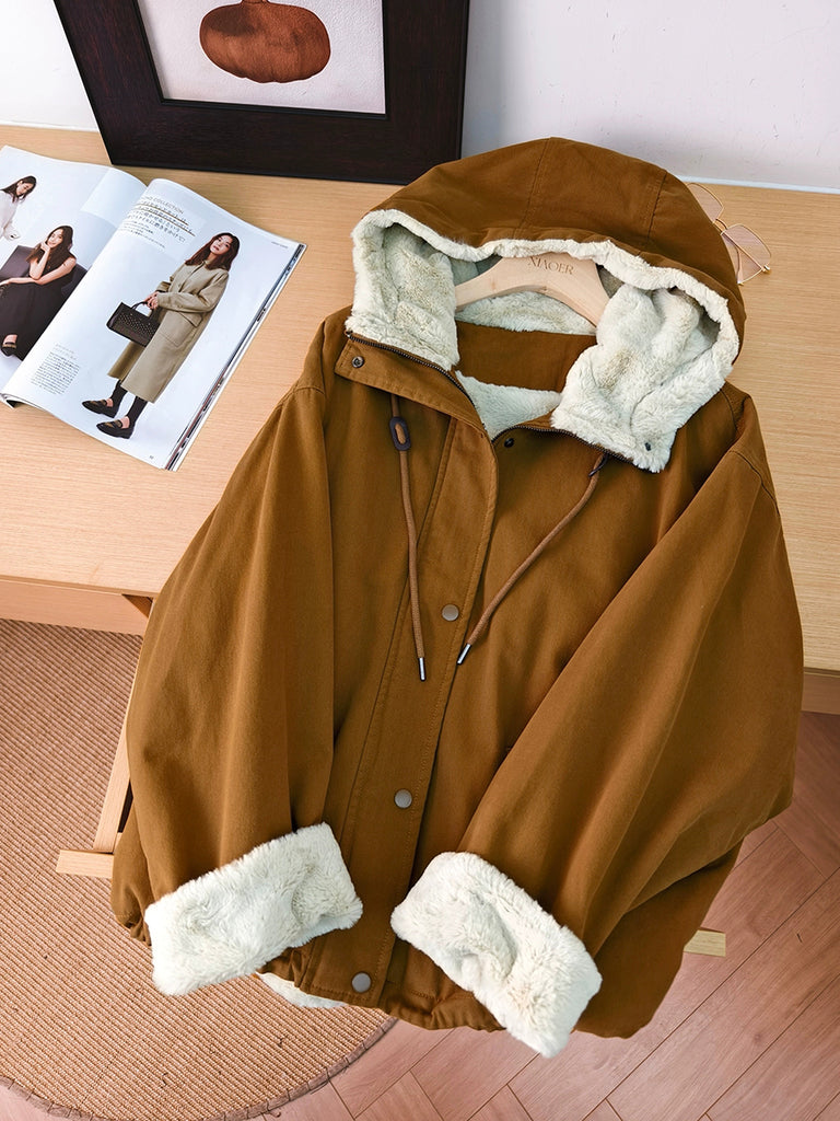 レディース 冬 カジュアル 純色 フリース裏地 フード付きコート