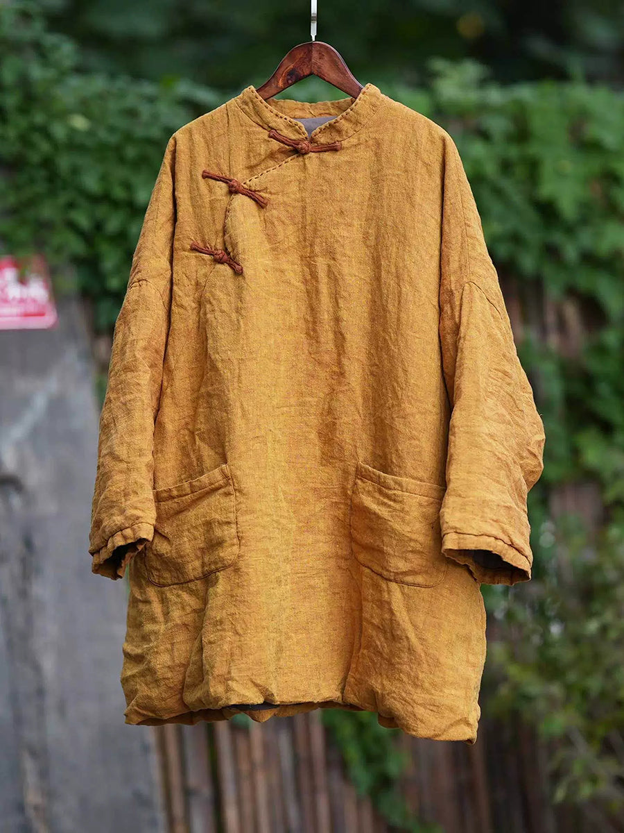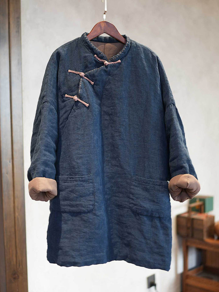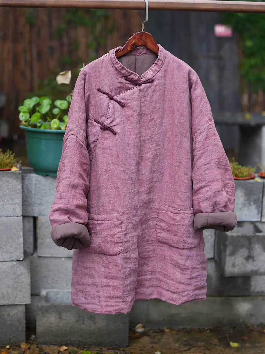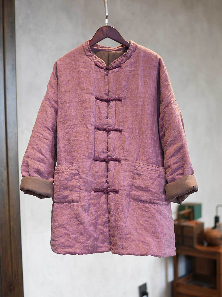 レディース 冬 エスニック ピュアカラー スタンドカラー リネン パッド入りコート