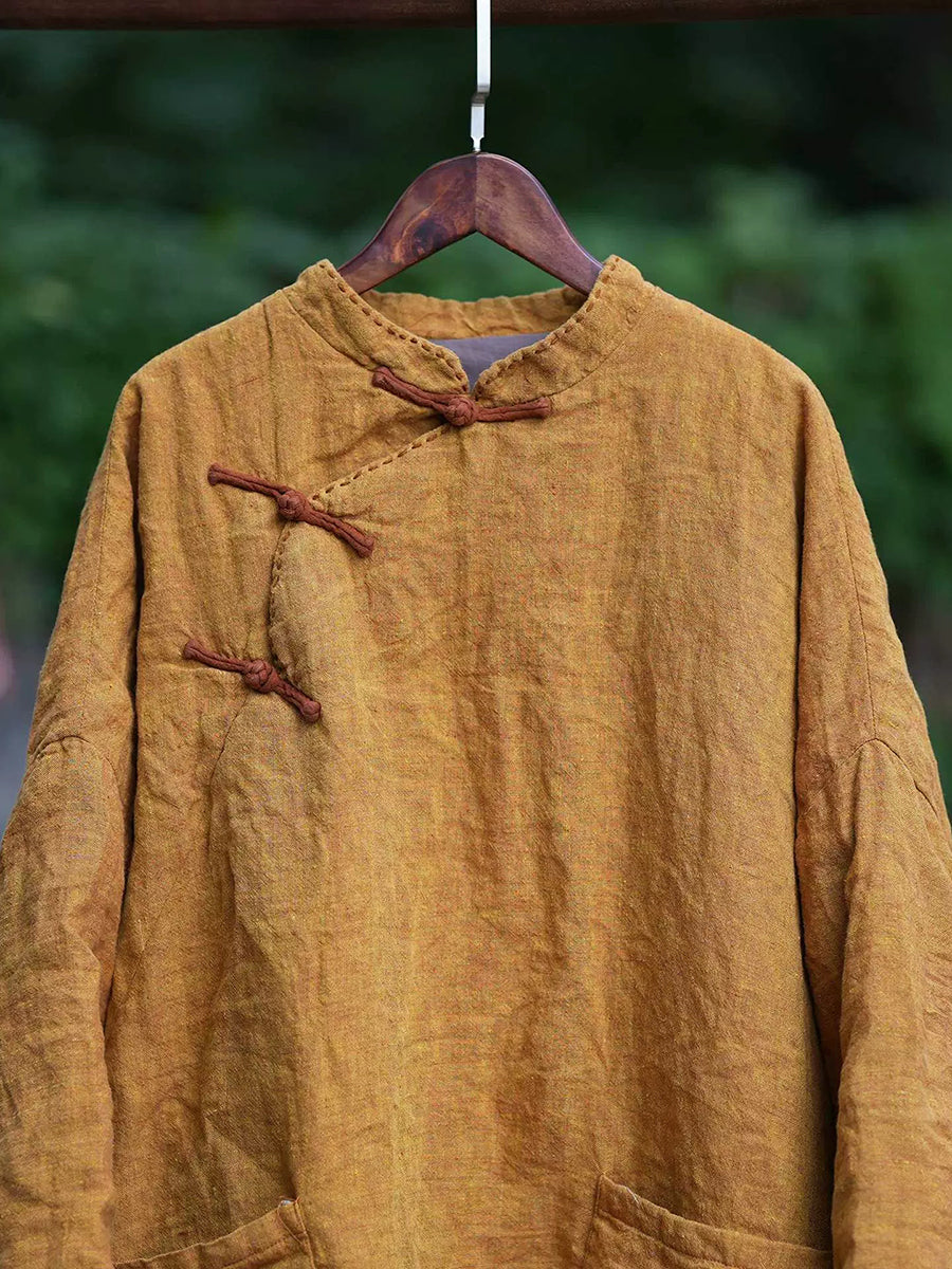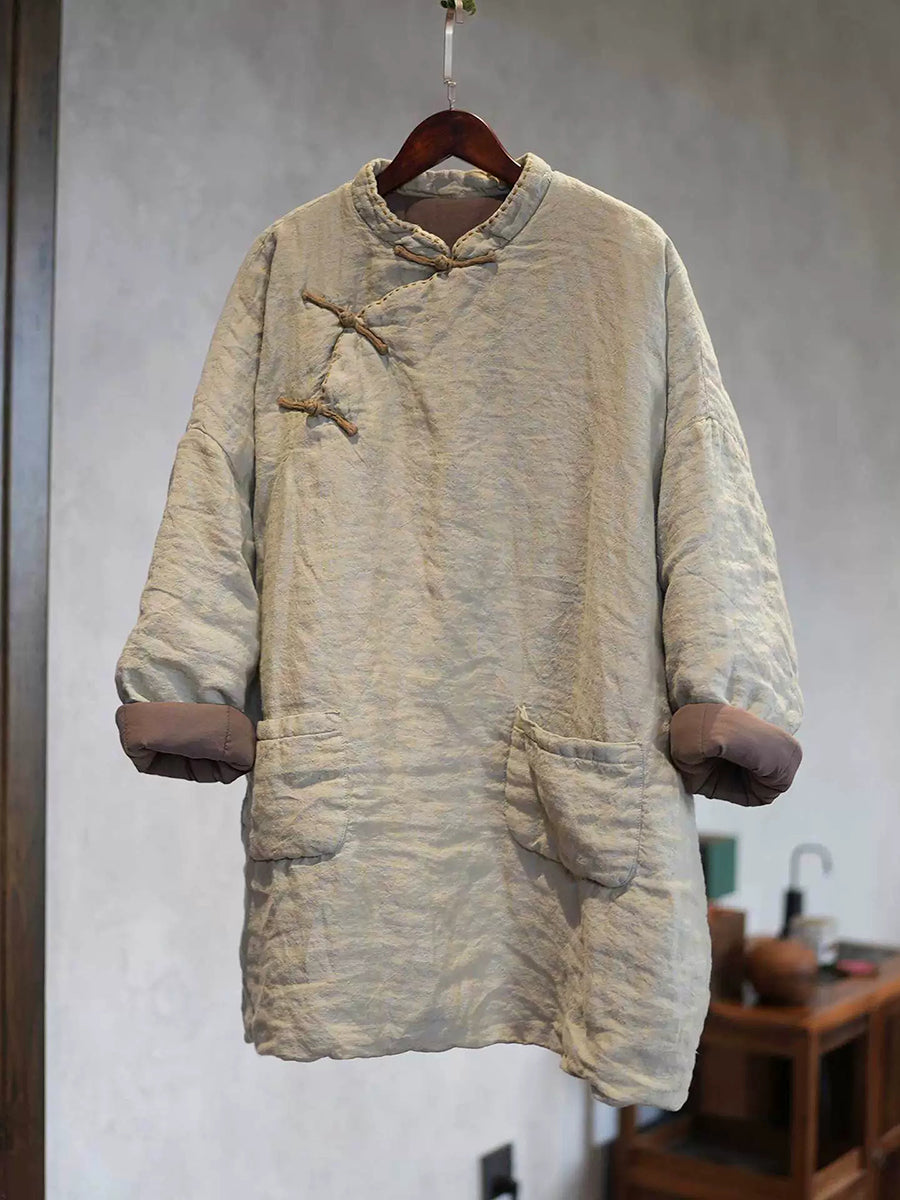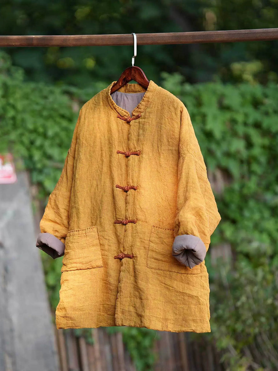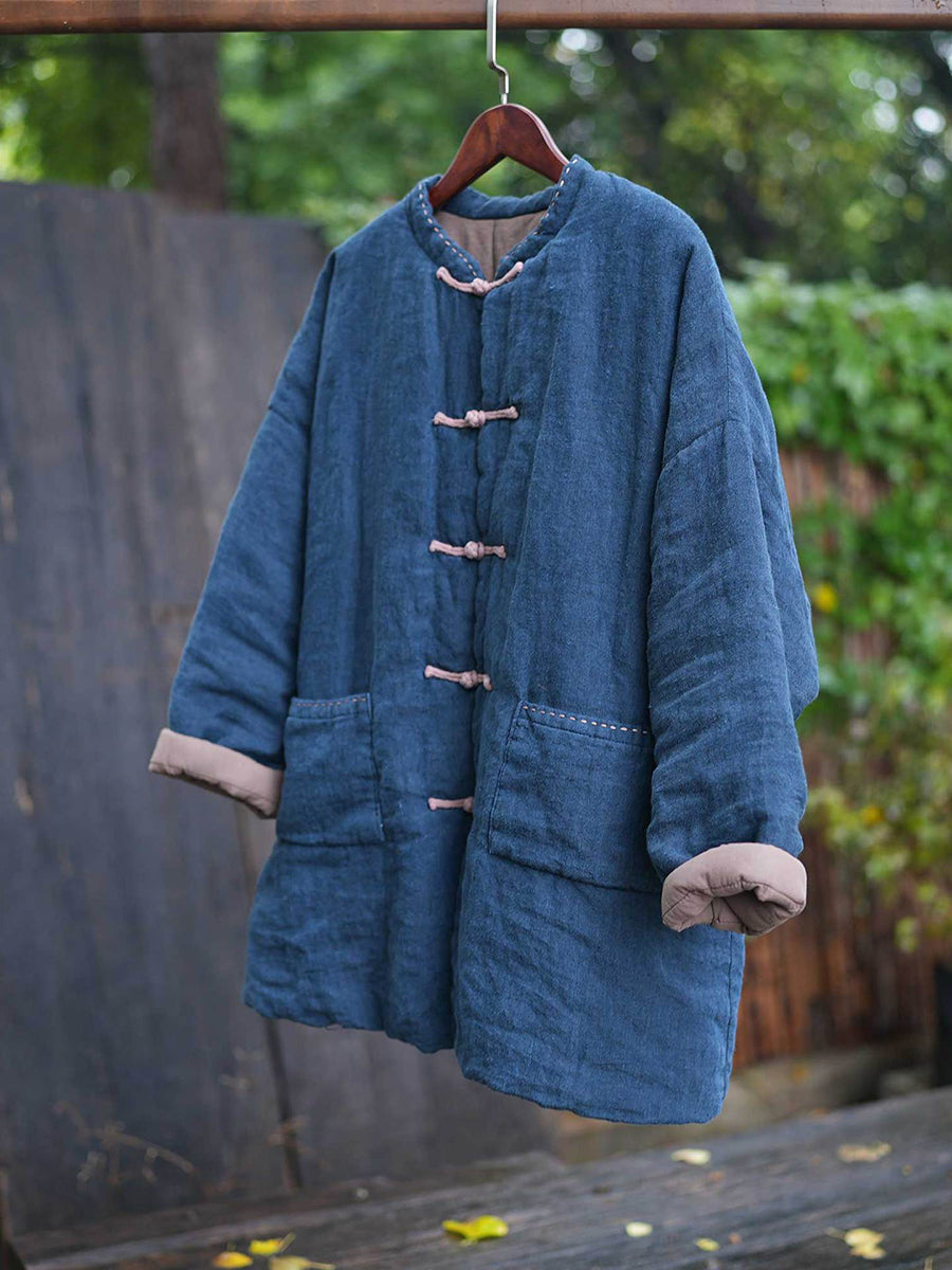 レディース 冬 エスニック ピュアカラー スタンドカラー リネン パッド入りコート