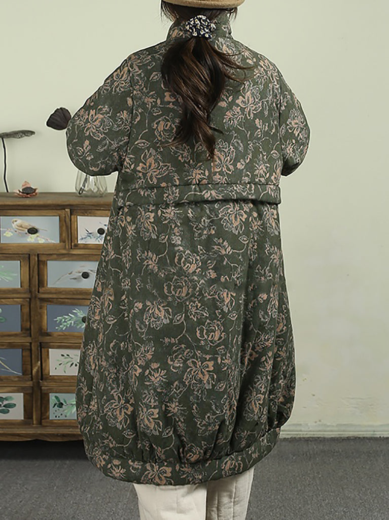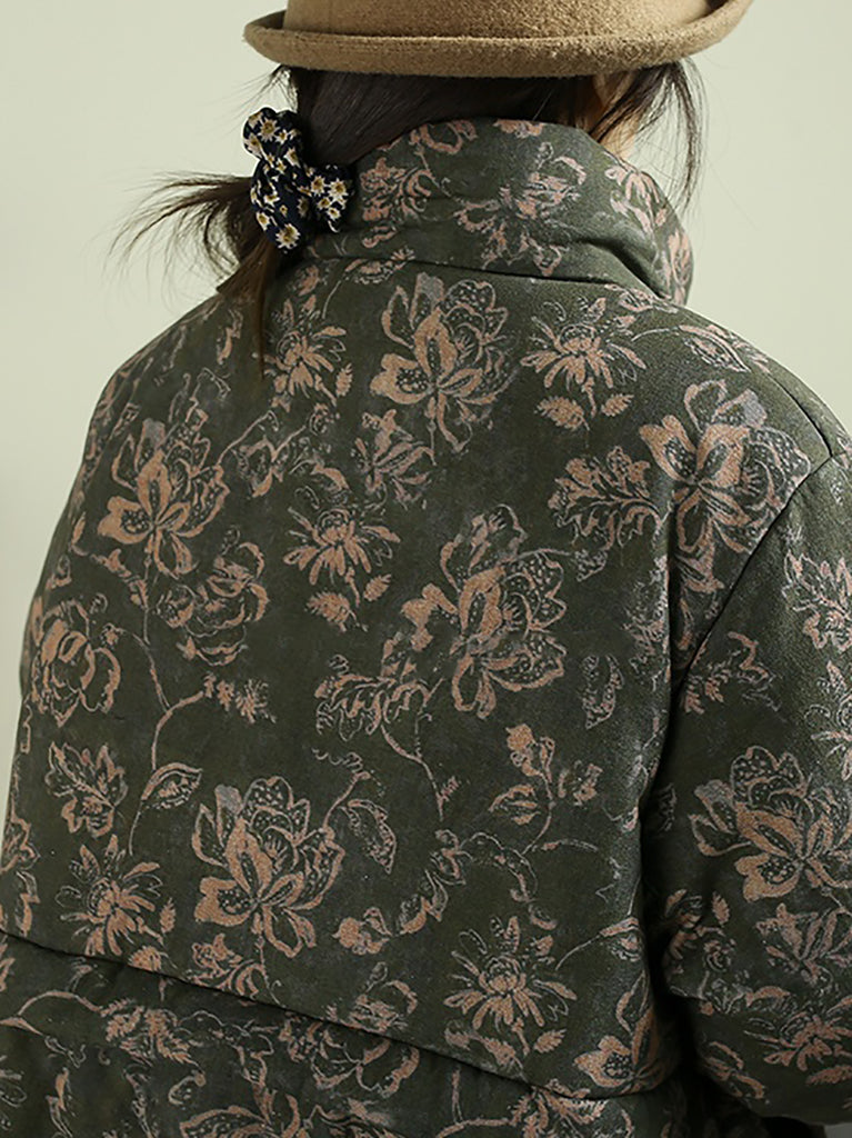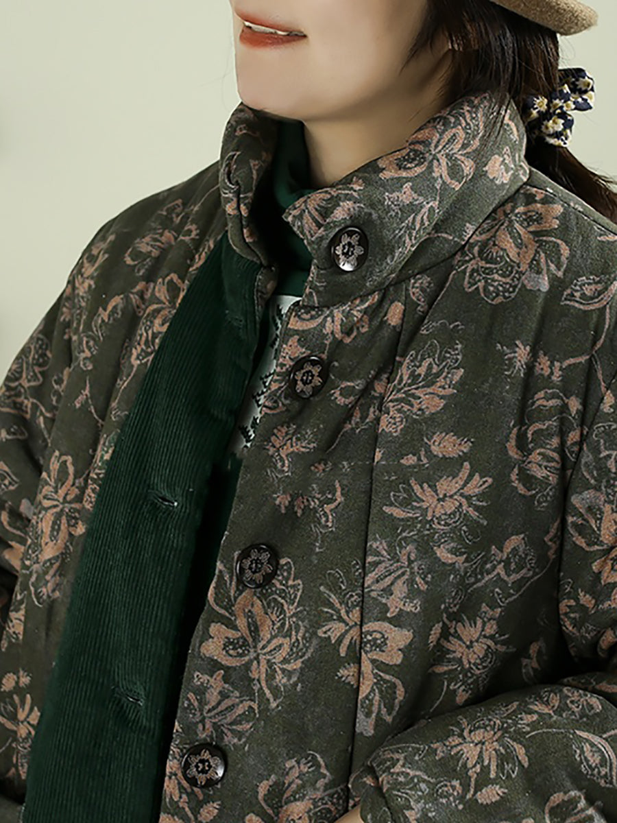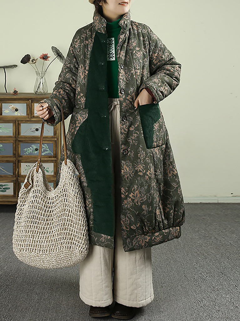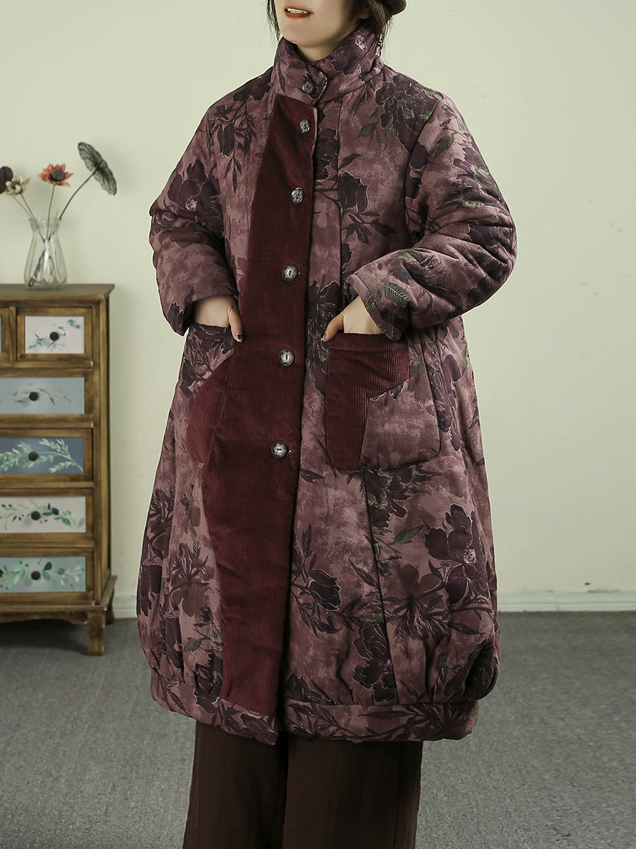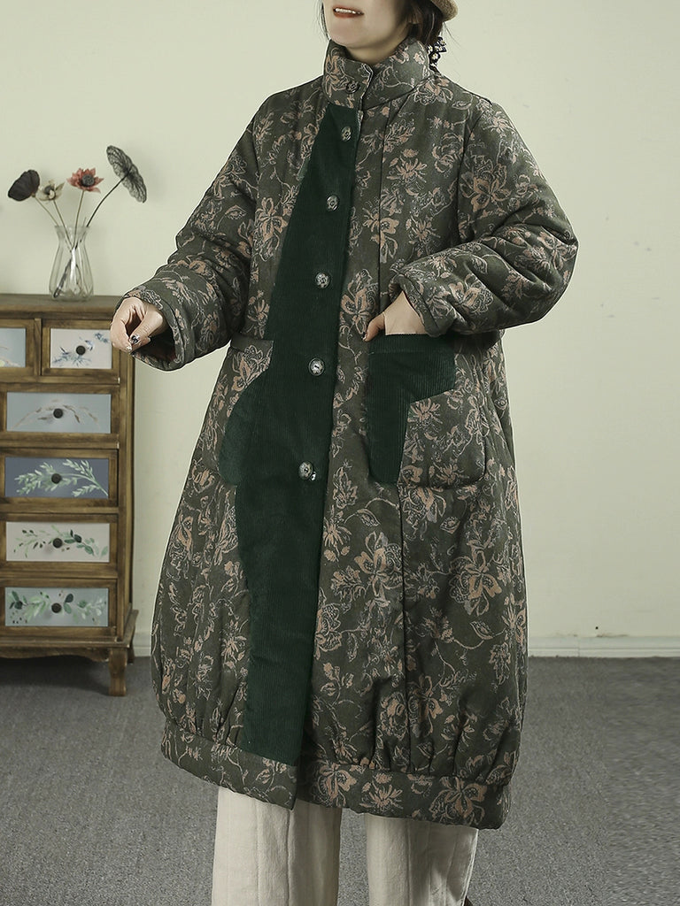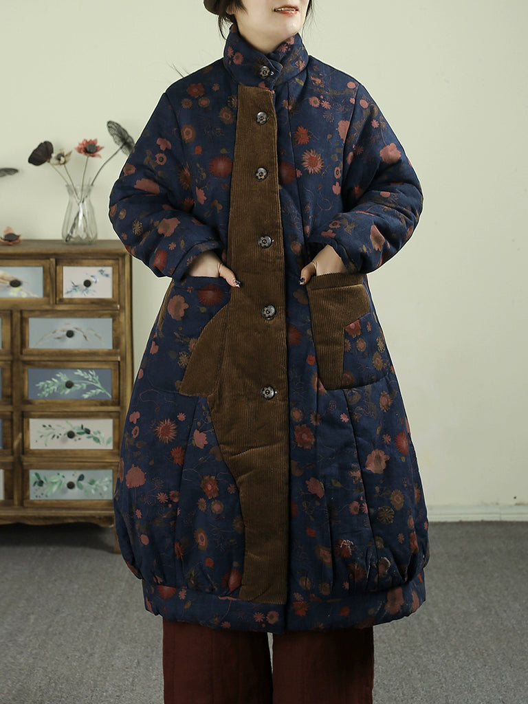 レディース 冬用 フラワーコーデュロイ スプライス スタンドカラー パッド入りコート