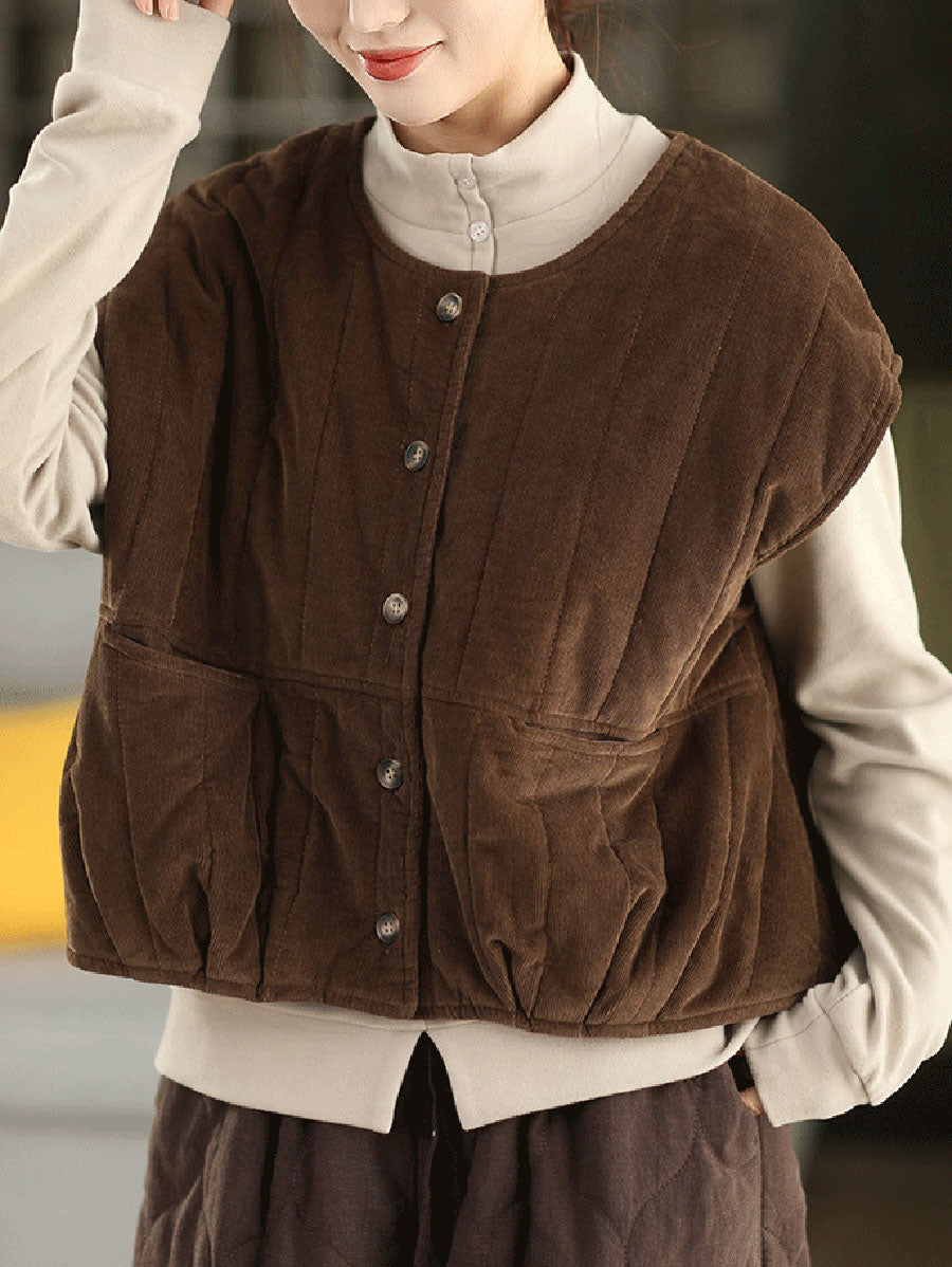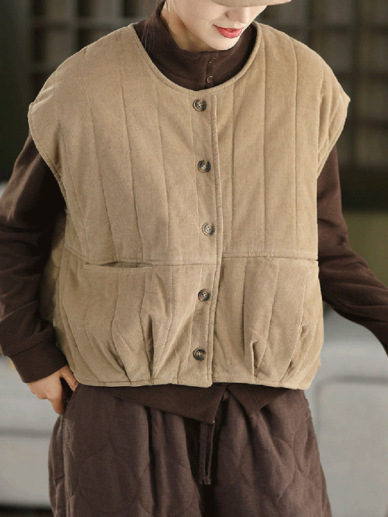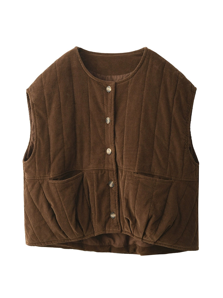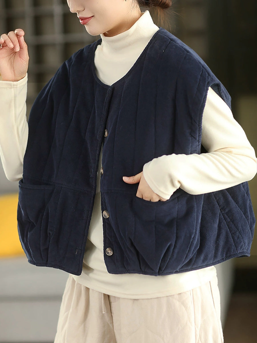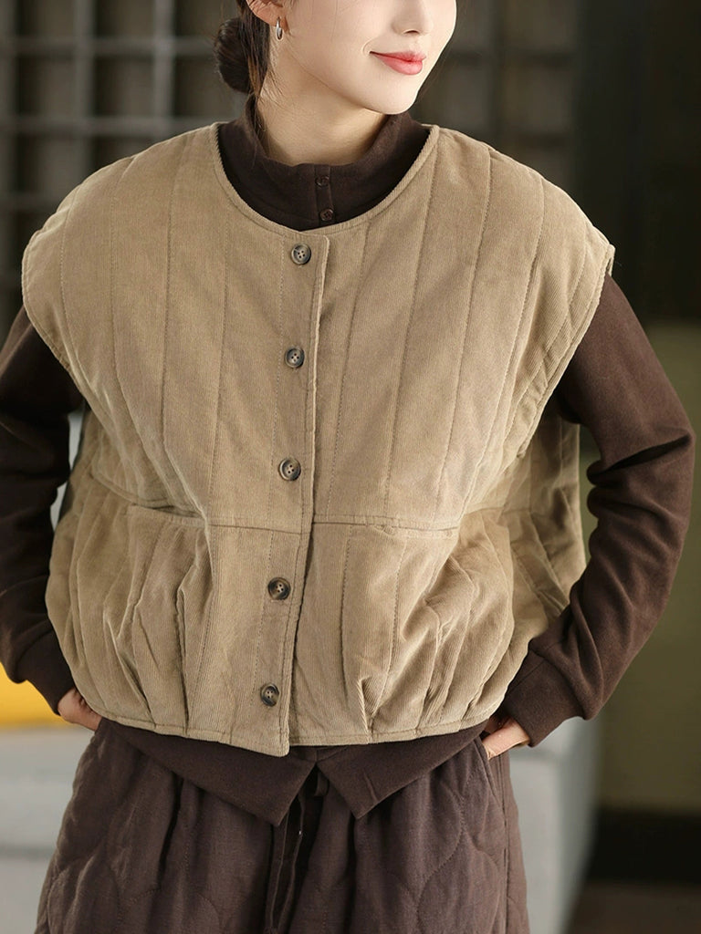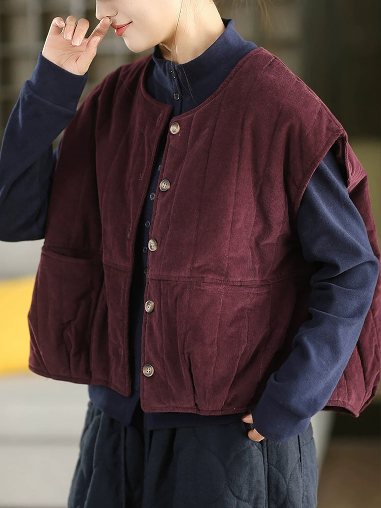 レディース 冬用 ピュアカラー Oネック コーデュロイ パッド入りベスト