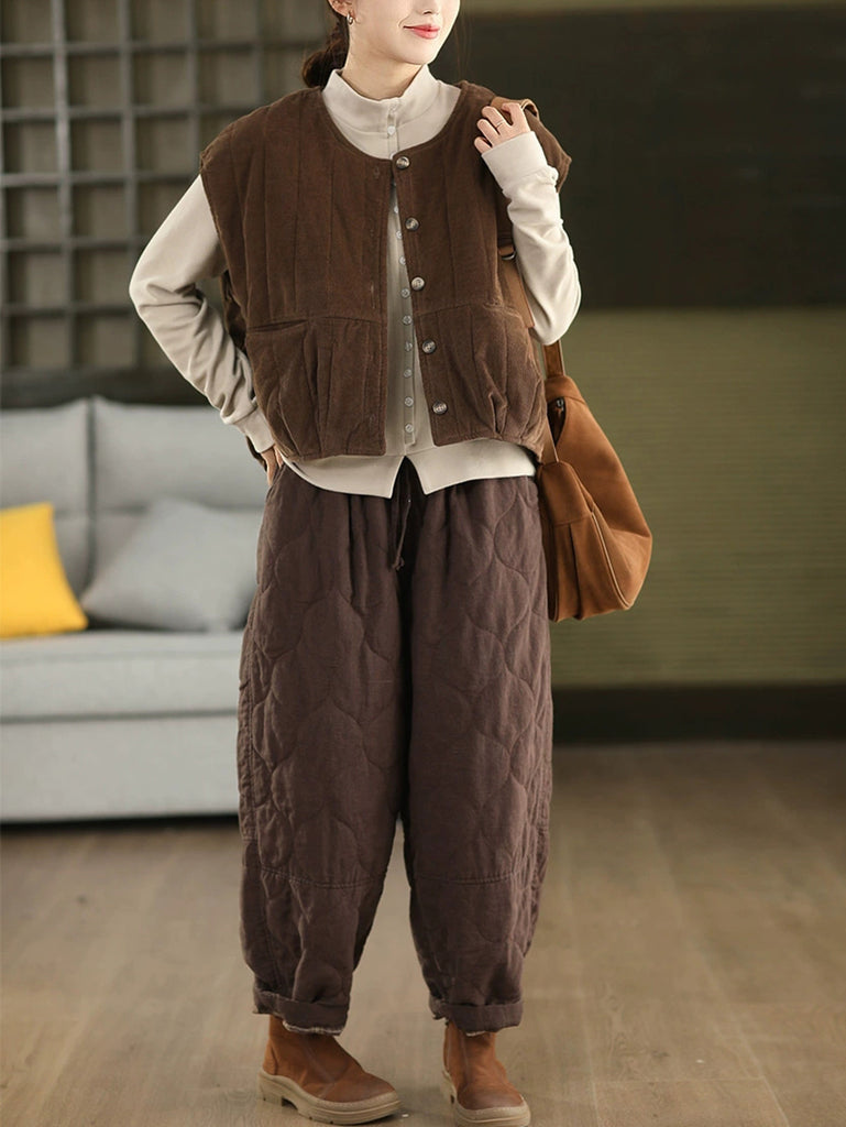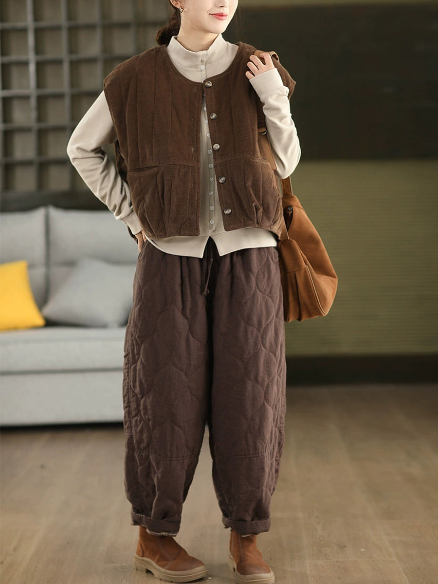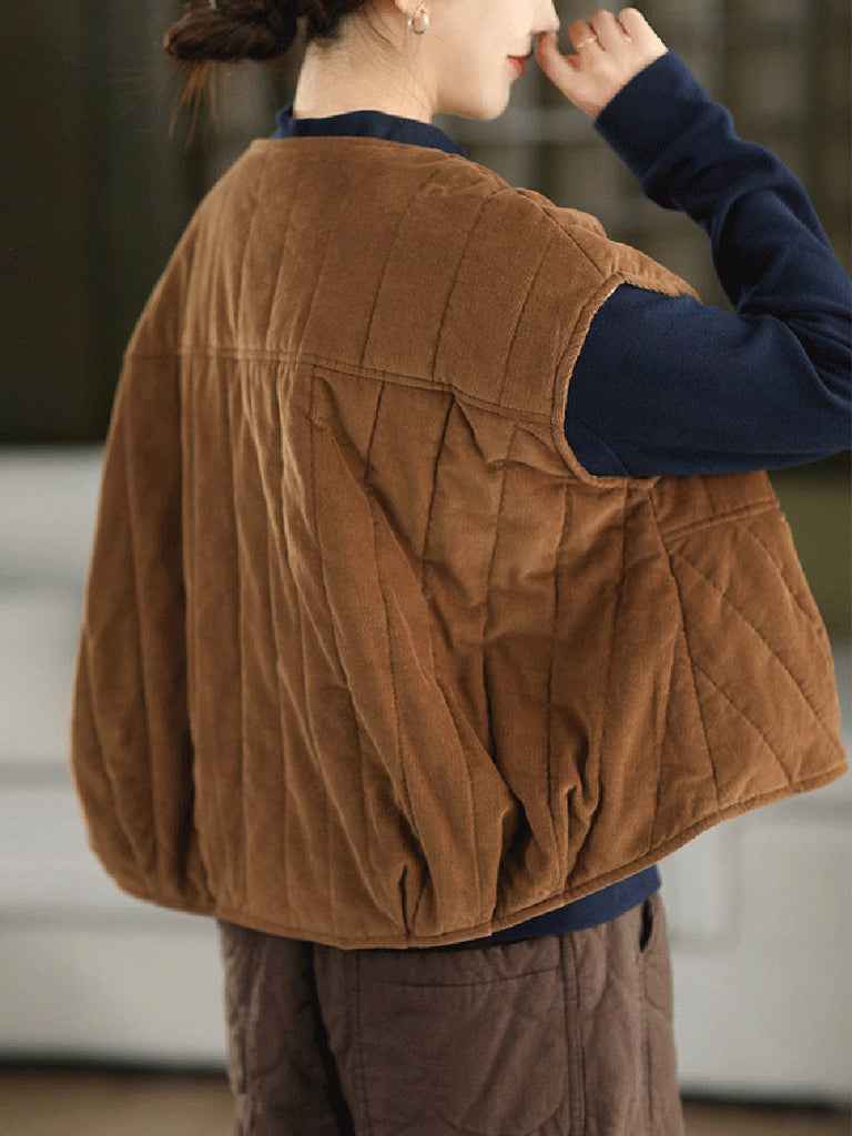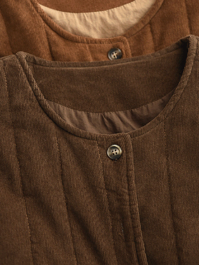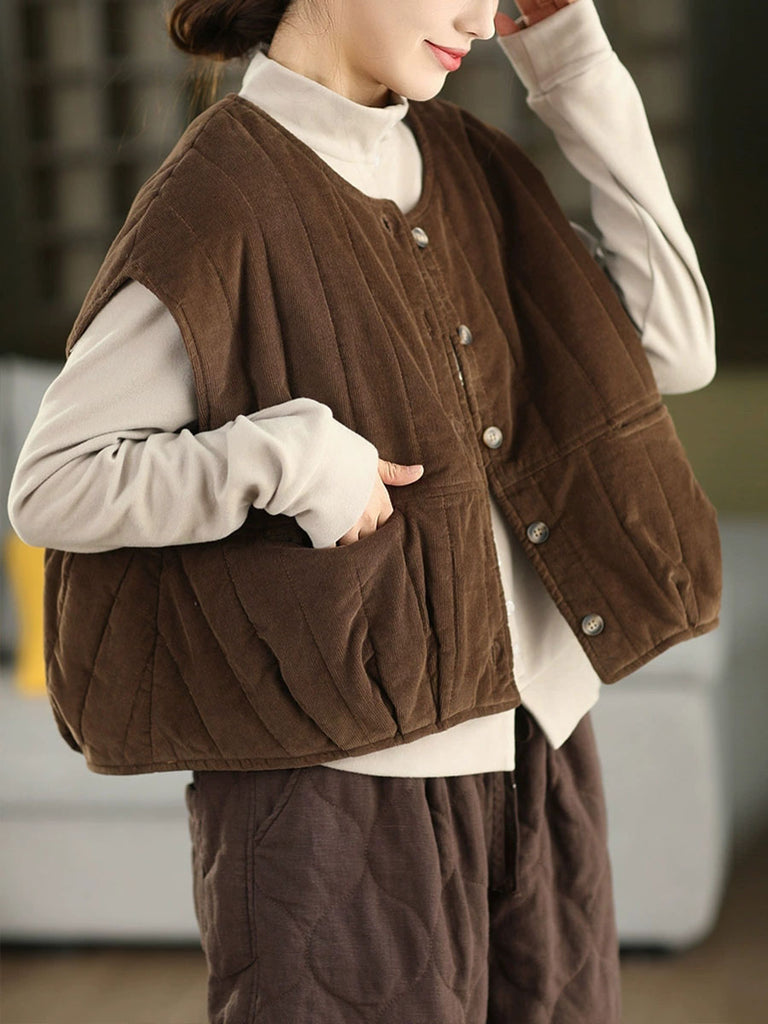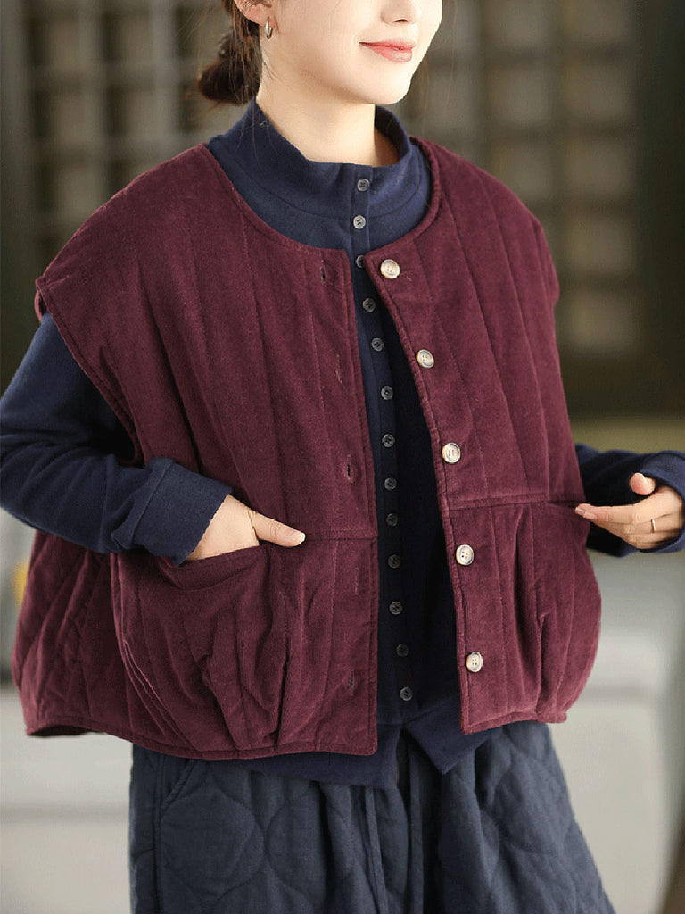 レディース 冬用 ピュアカラー Oネック コーデュロイ パッド入りベスト