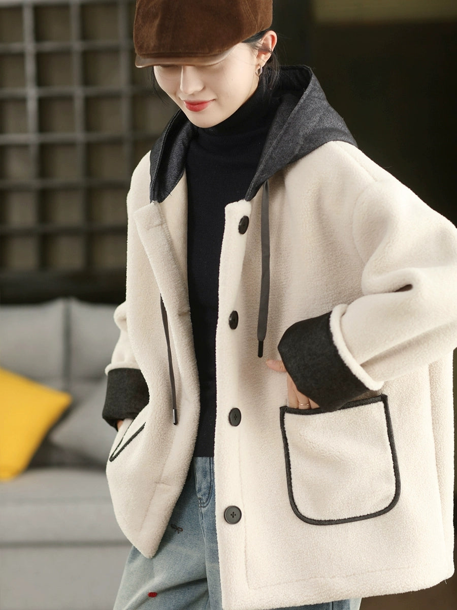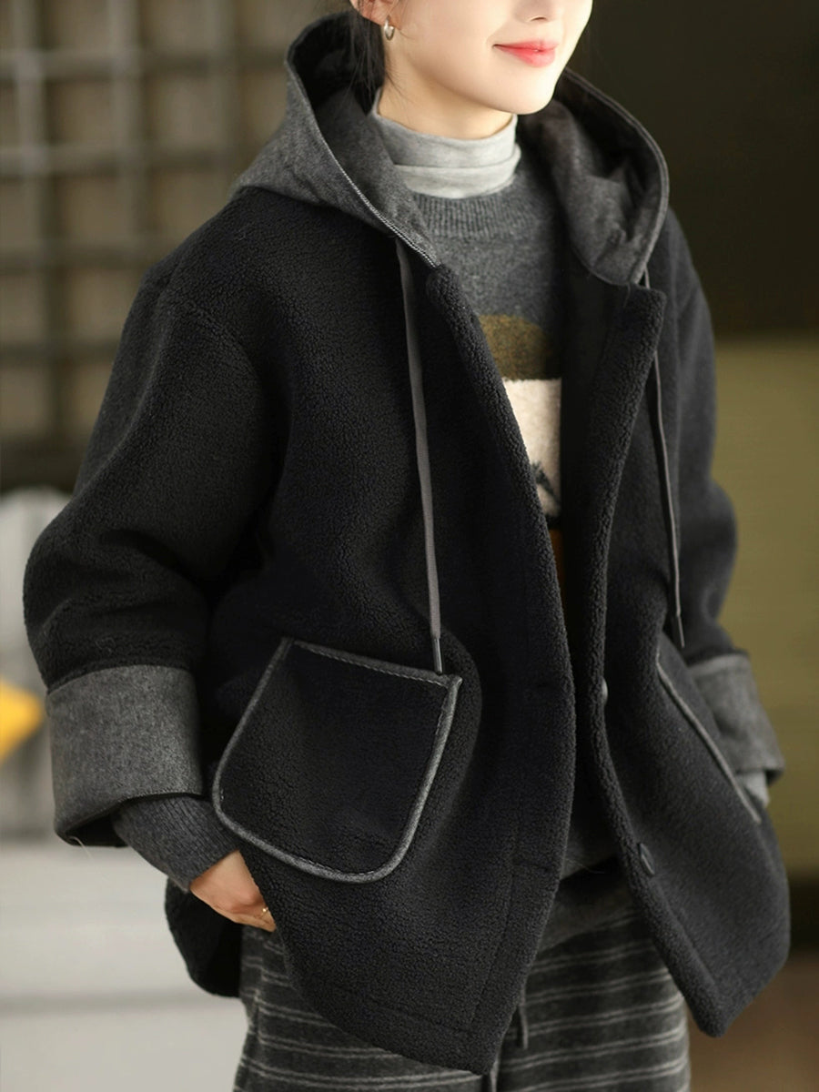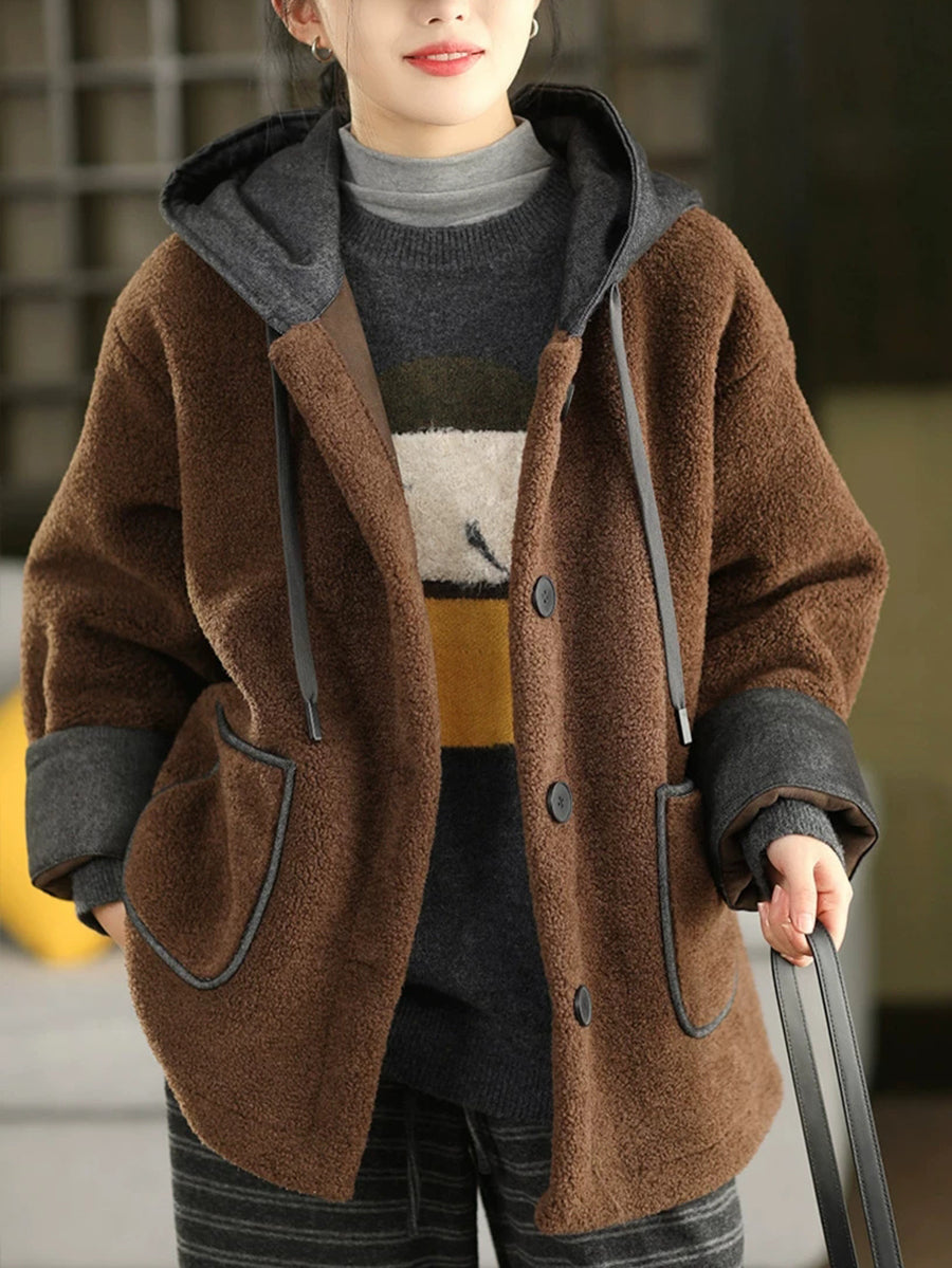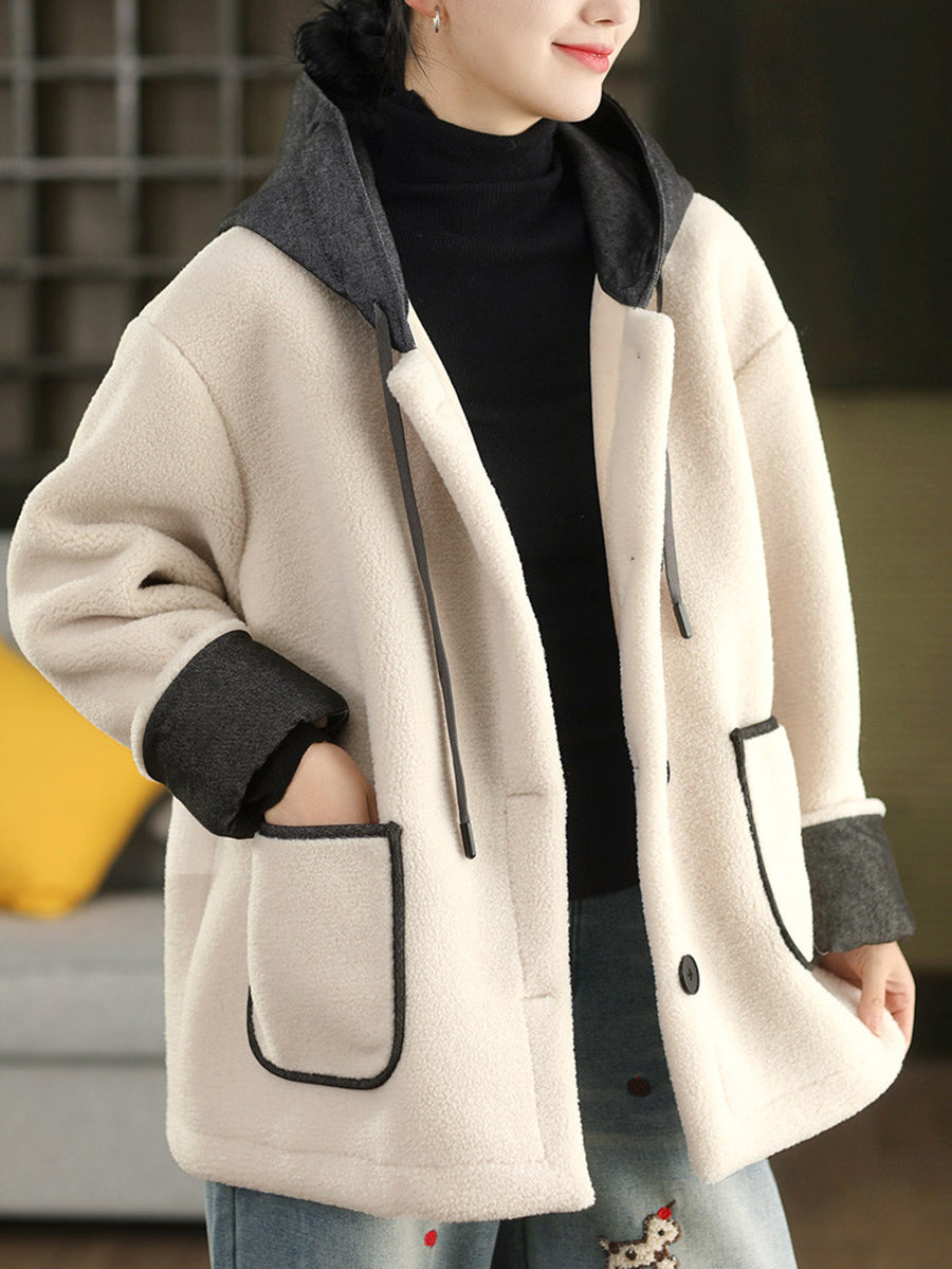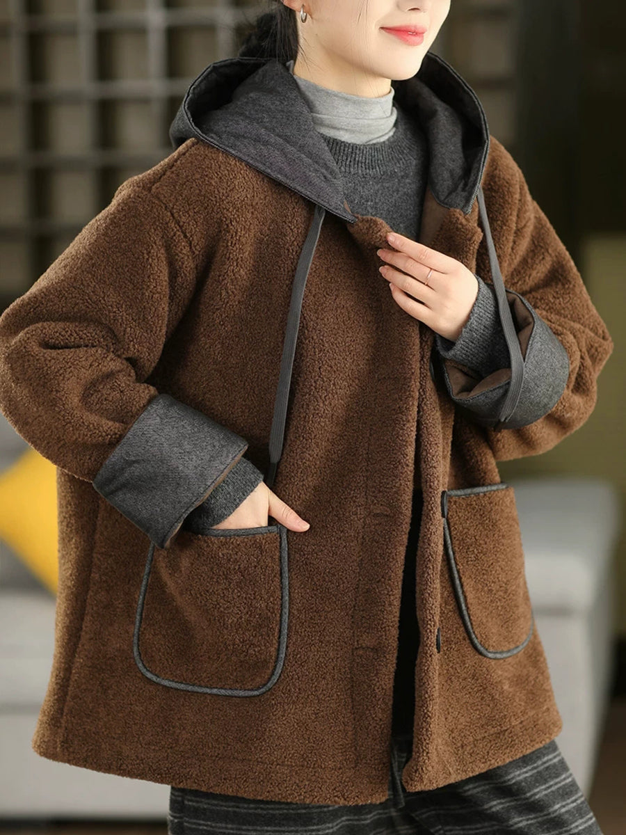 レディース 冬 レトロ カラーブロック フード付き フリース コート