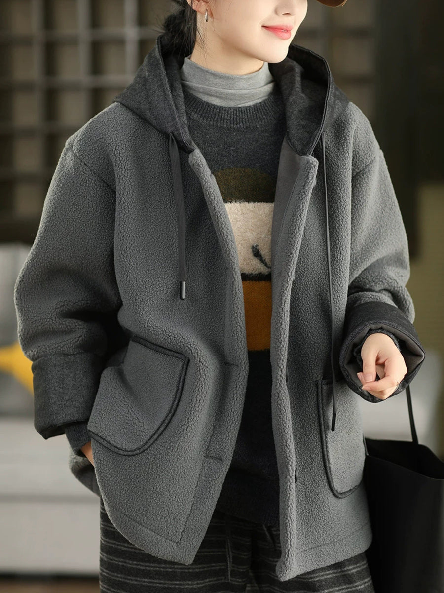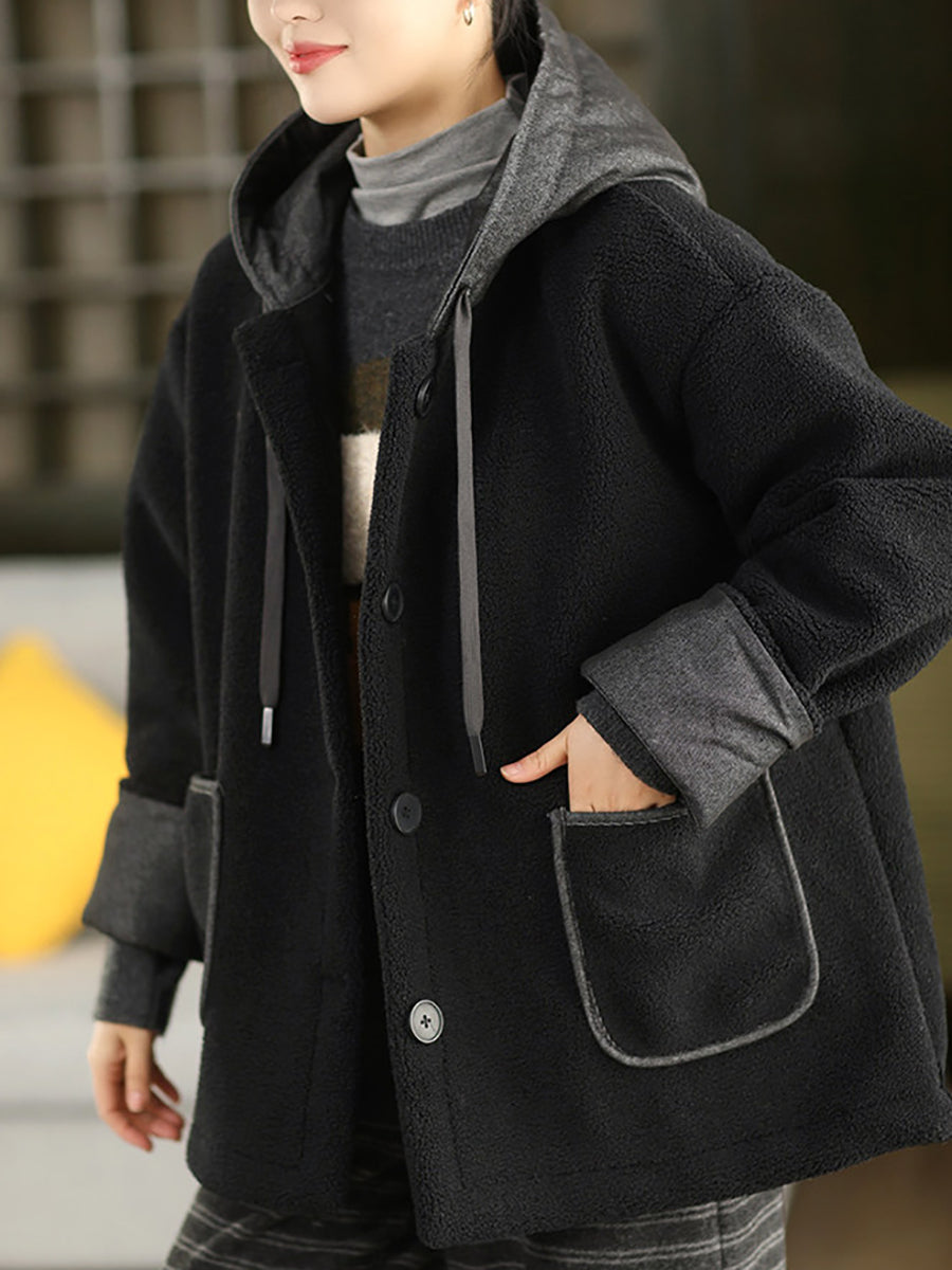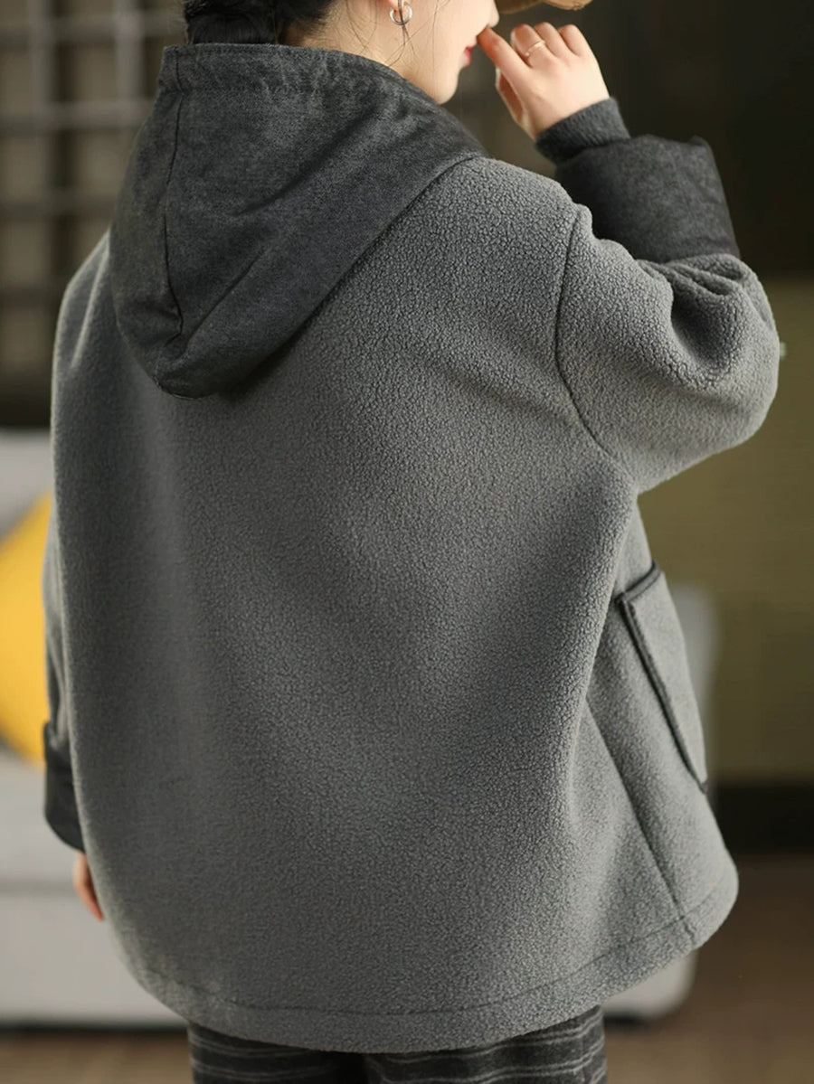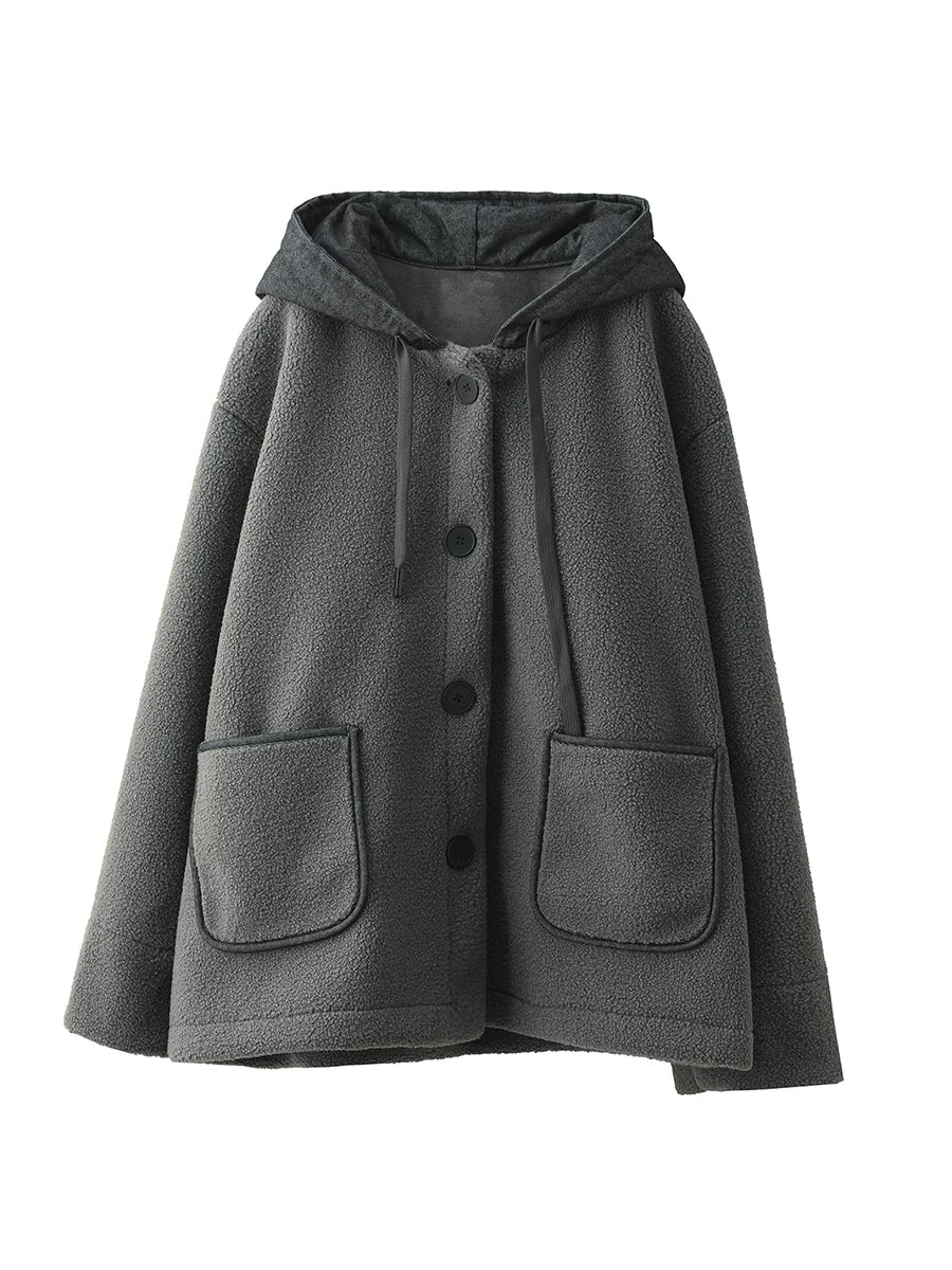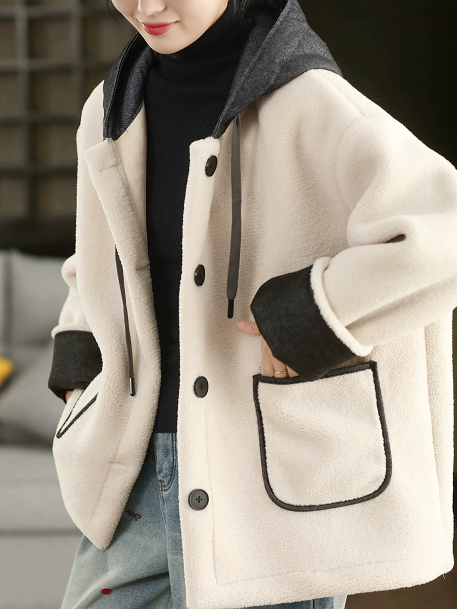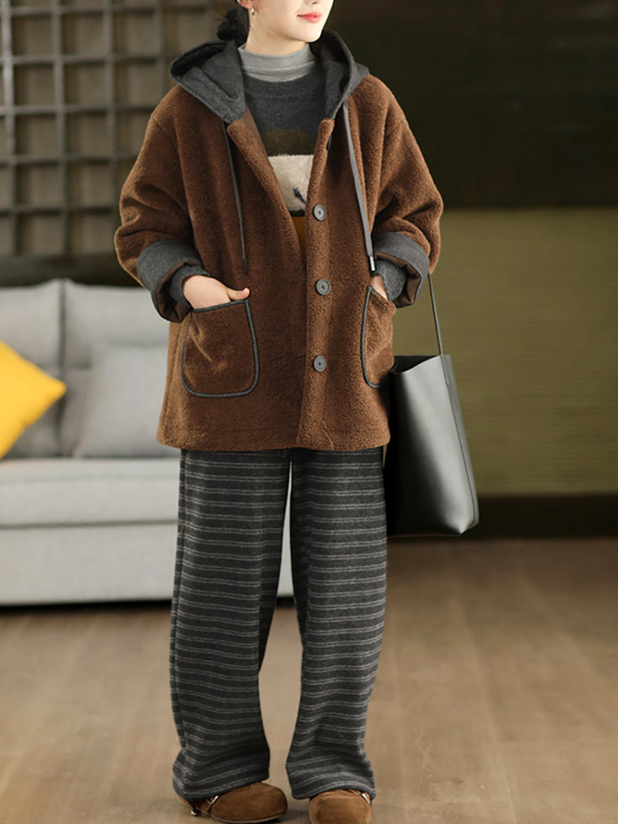 レディース 冬 レトロ カラーブロック フード付き フリース コート