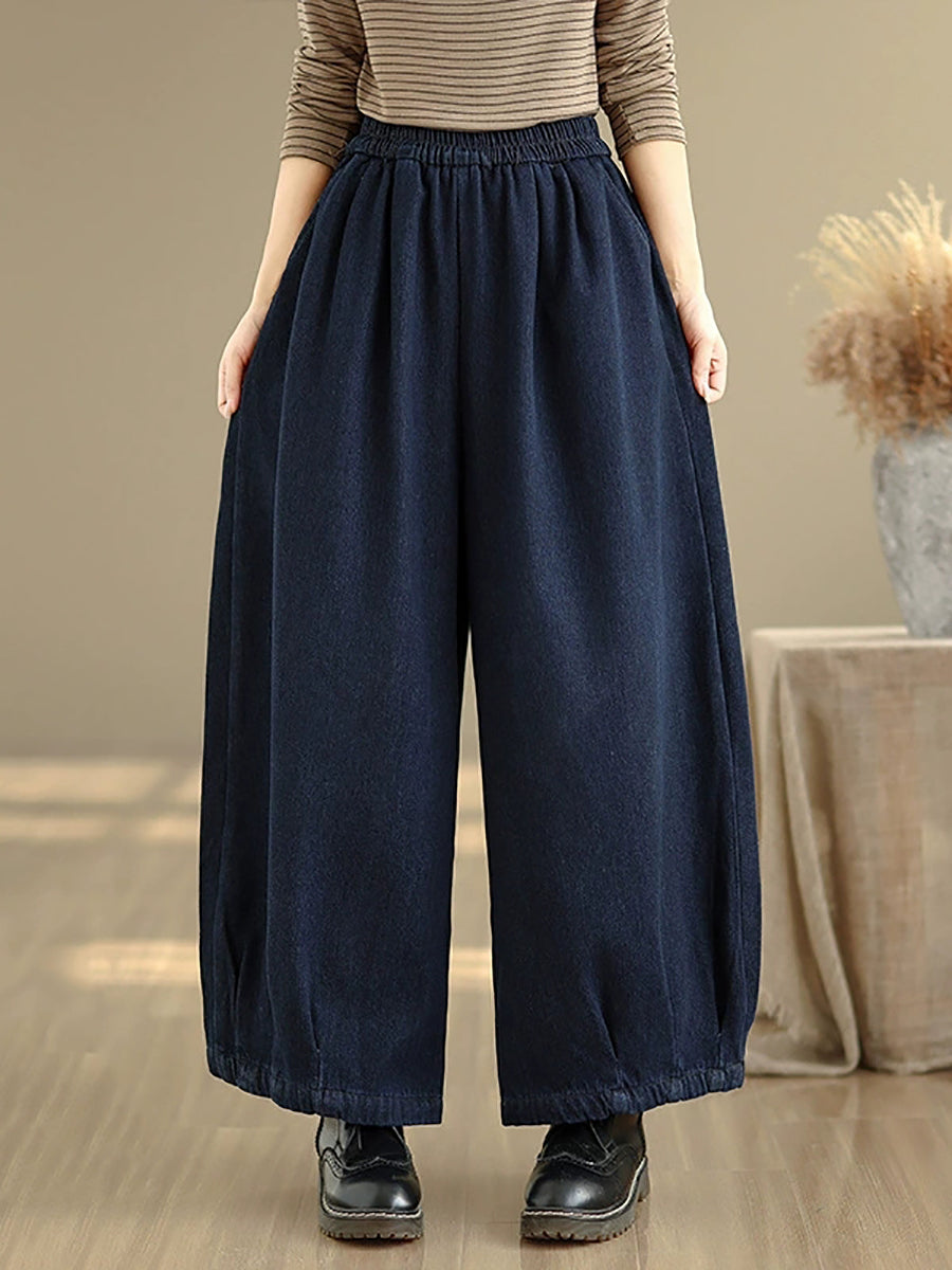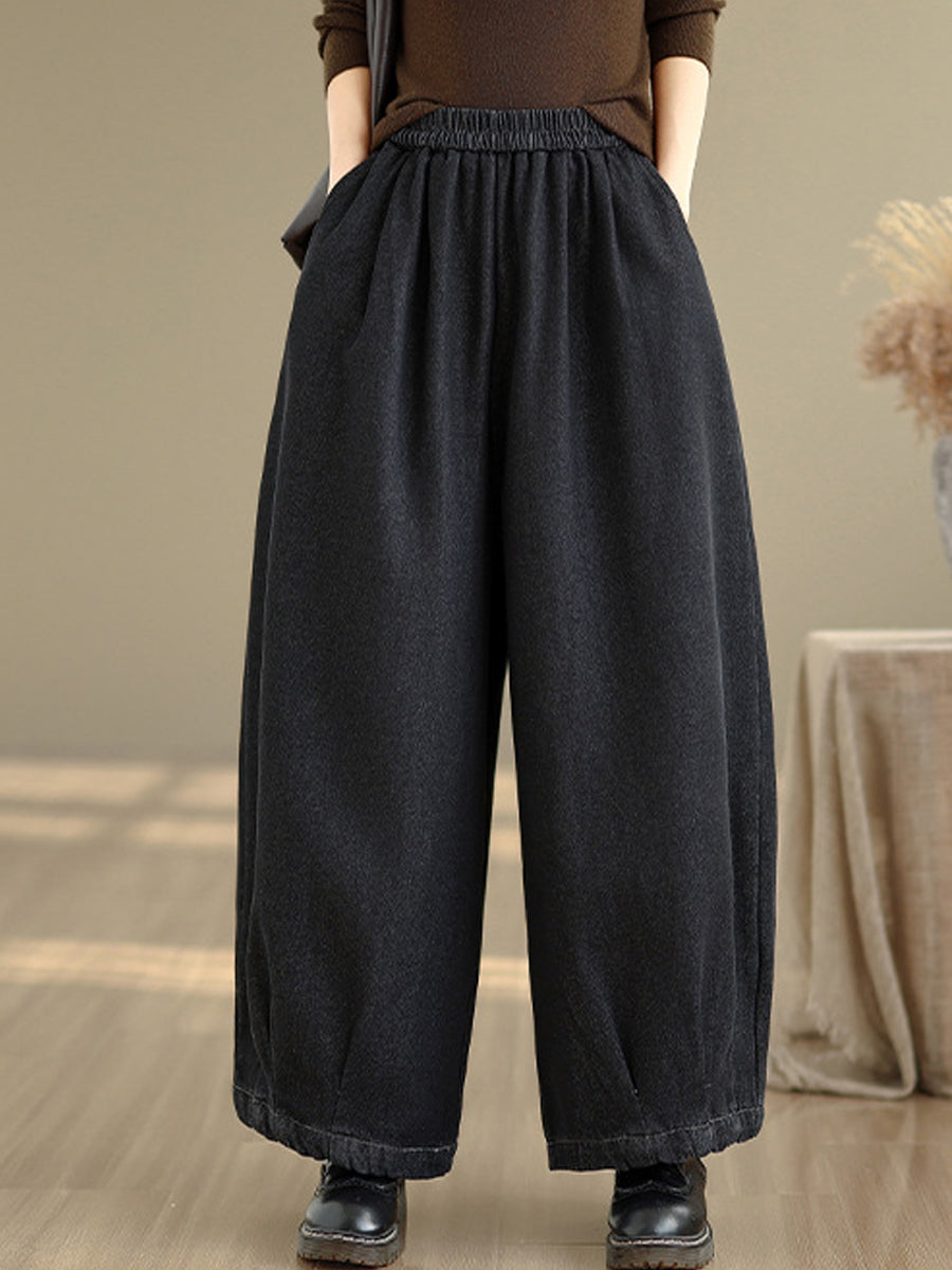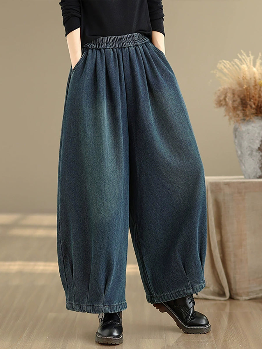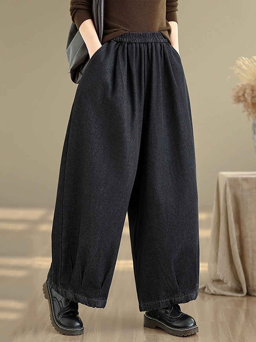 レディース 冬 レトロ デニム フリース裏地 ワイドレッグパンツ