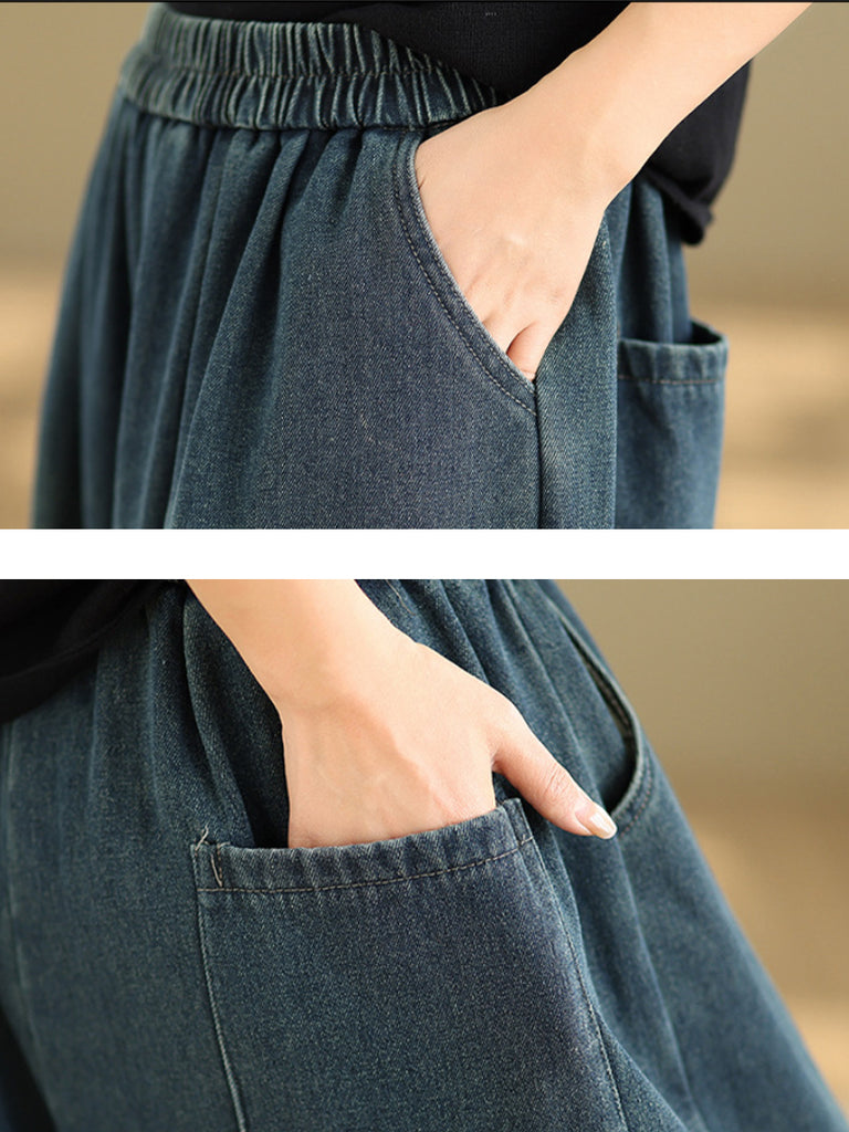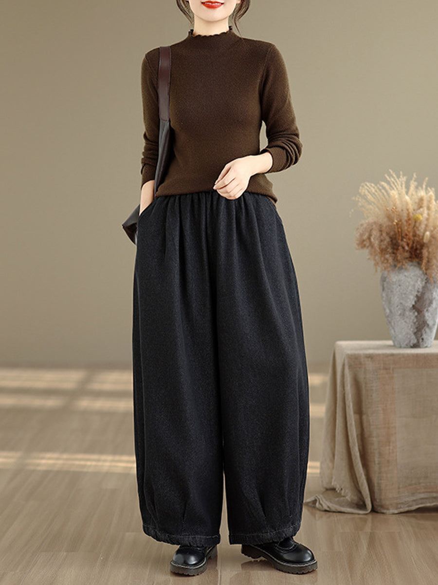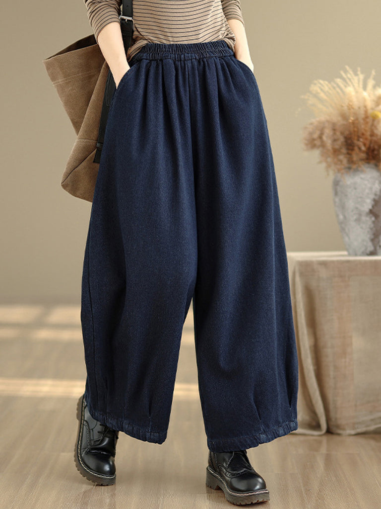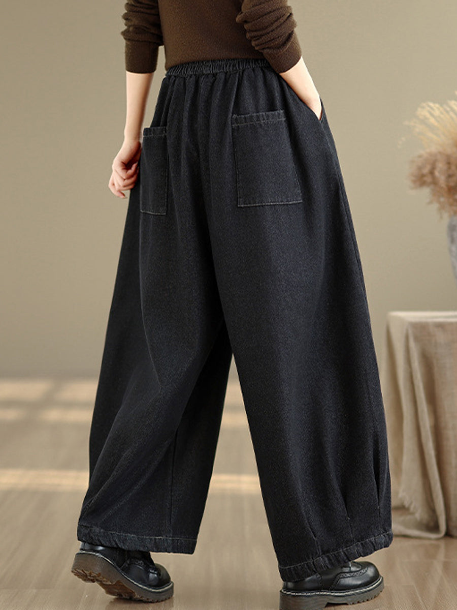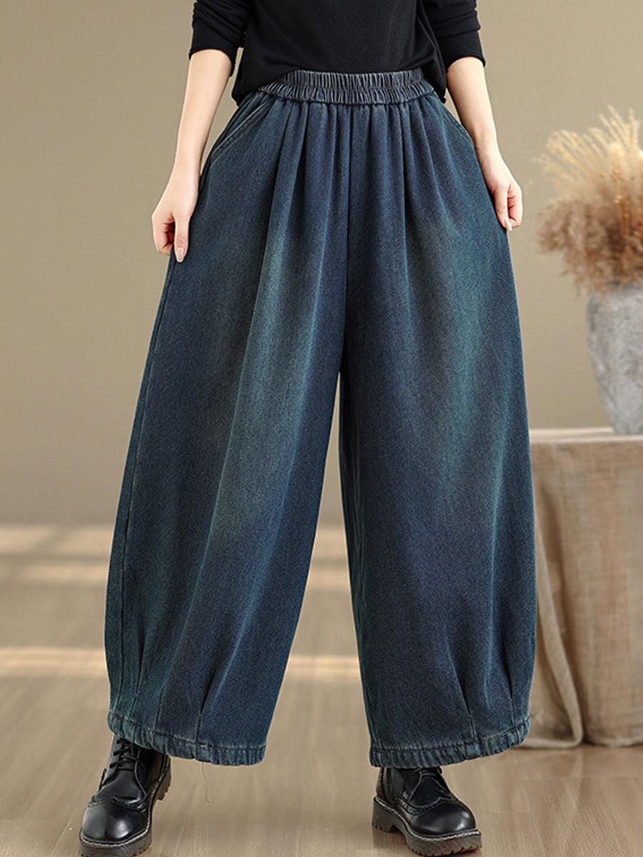 レディース 冬 レトロ デニム フリース裏地 ワイドレッグパンツ