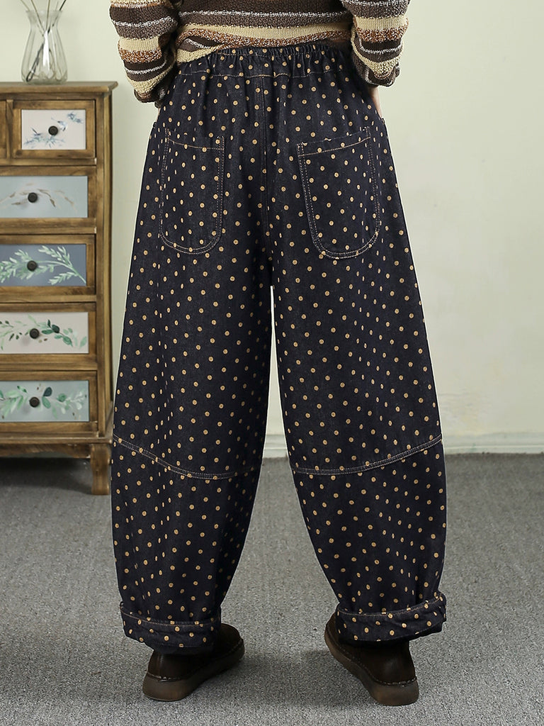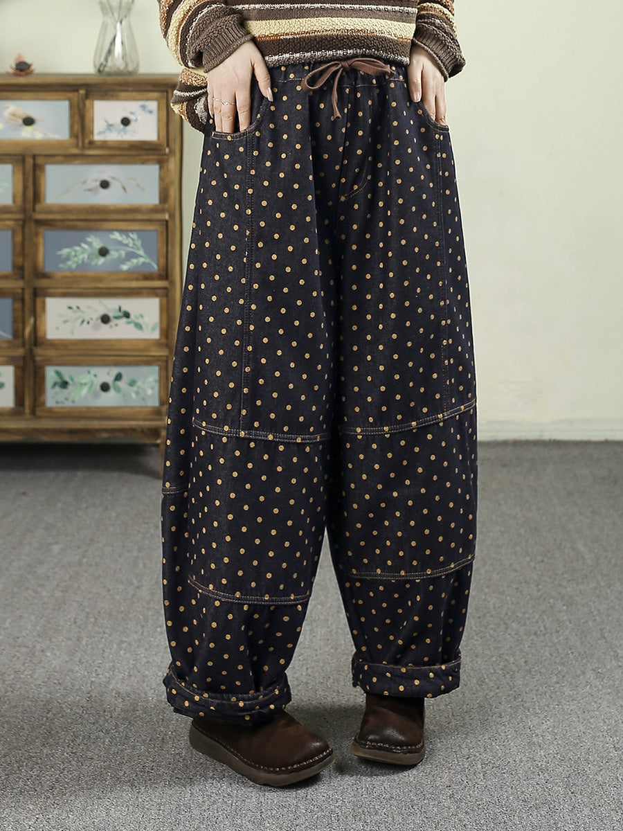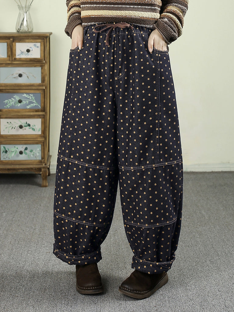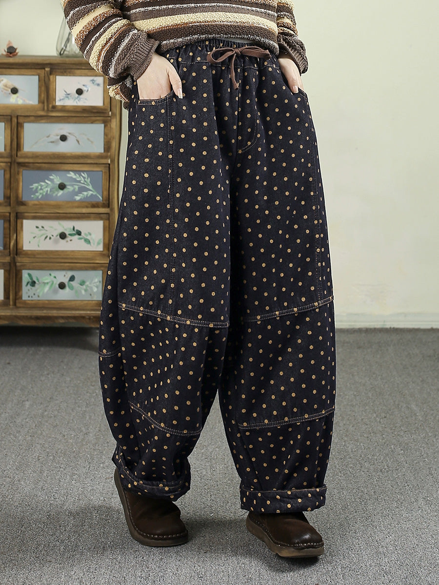 レディース 冬 レトロ ドット デニム フリース裏地 ハーレムパンツ