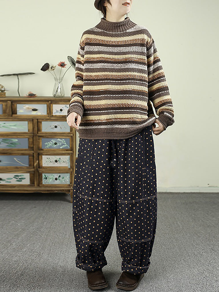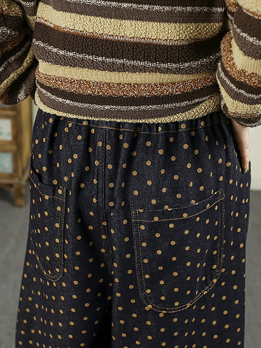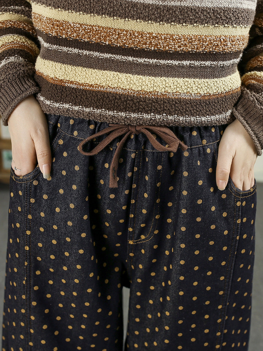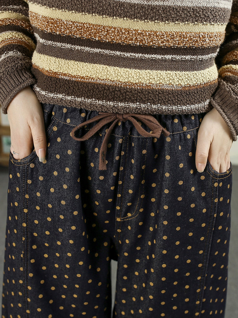 レディース 冬 レトロ ドット デニム フリース裏地 ハーレムパンツ