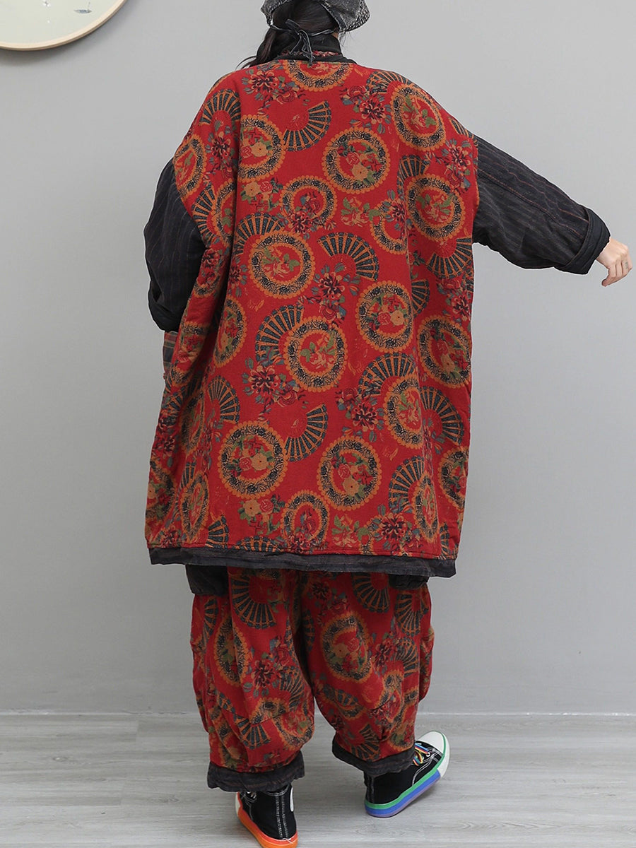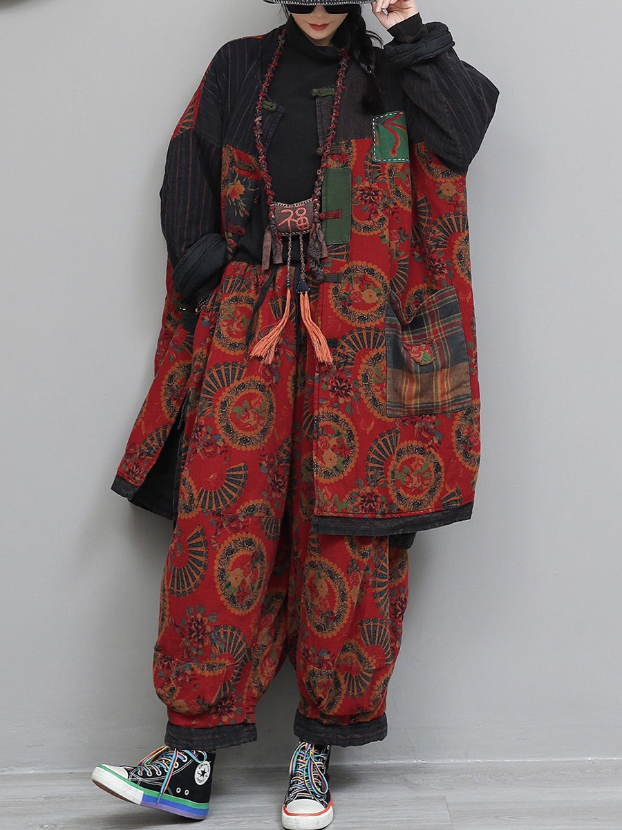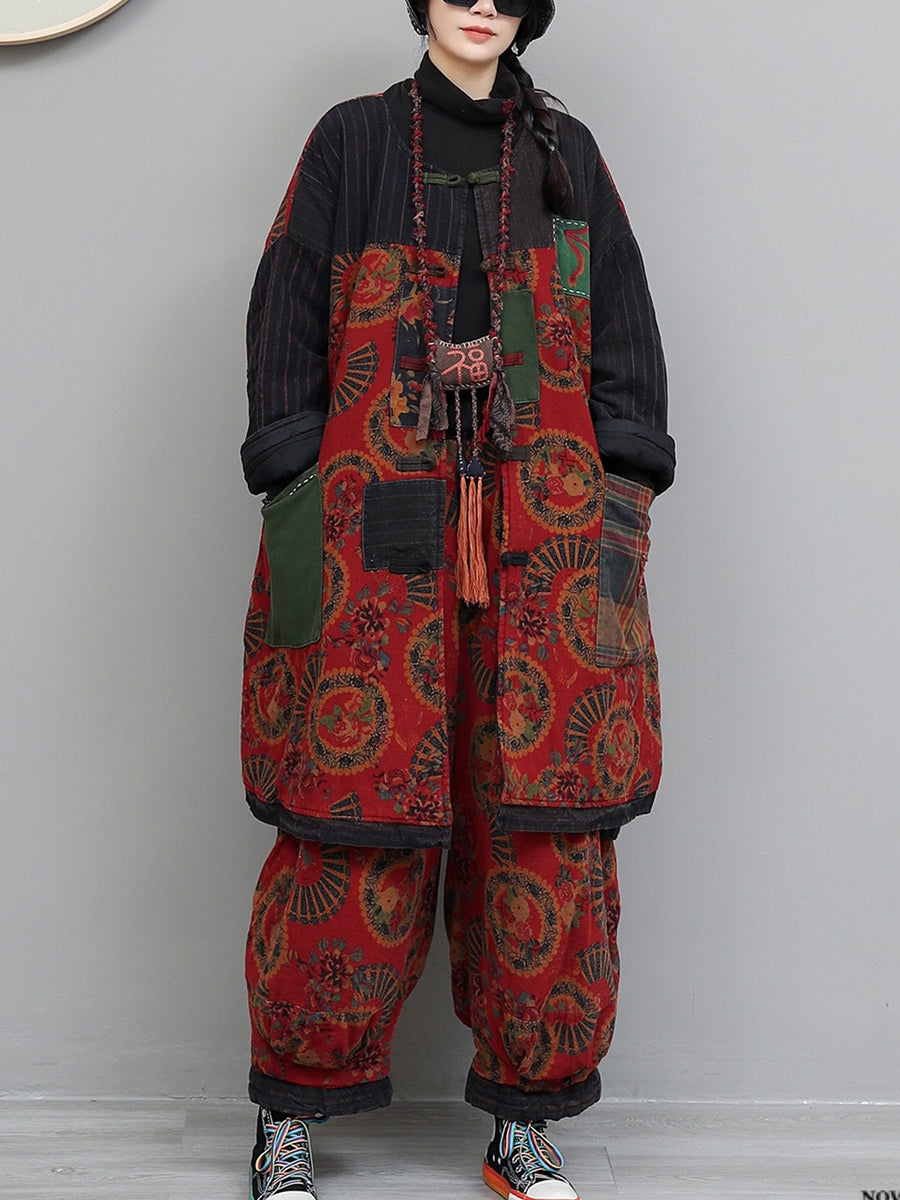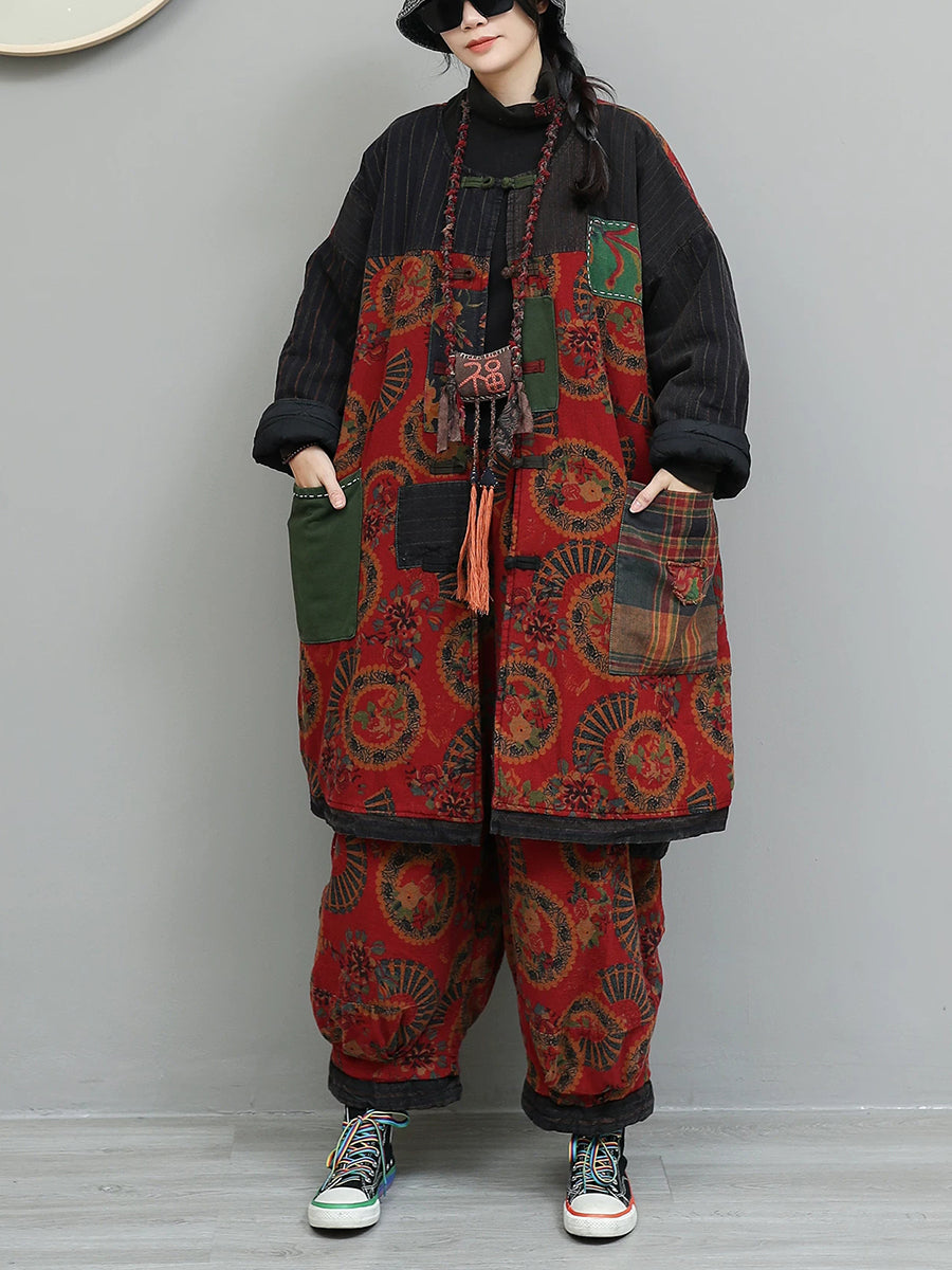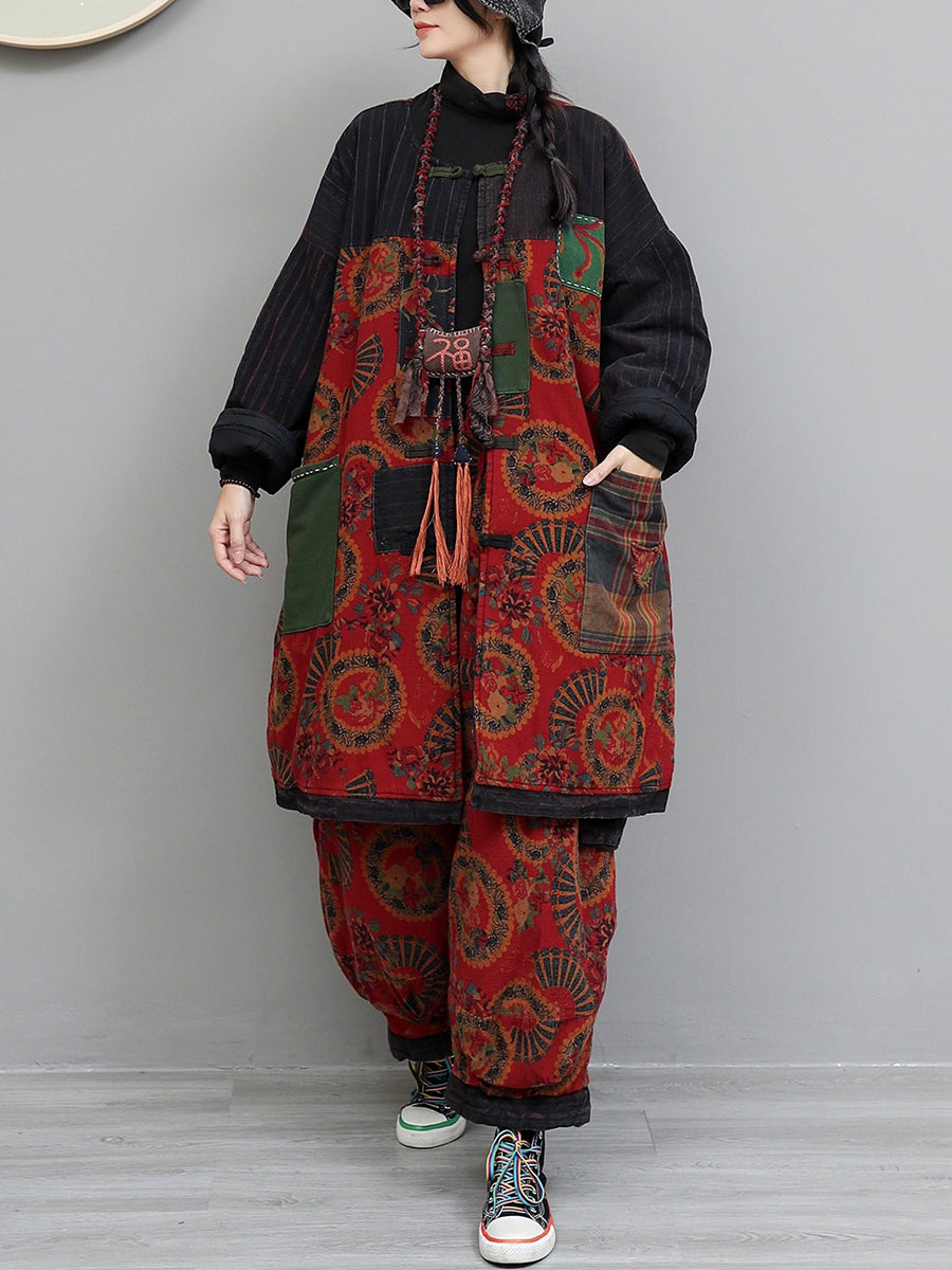 レディース 冬用 レトロ パッチワーク Oネック パッド入りスーツ